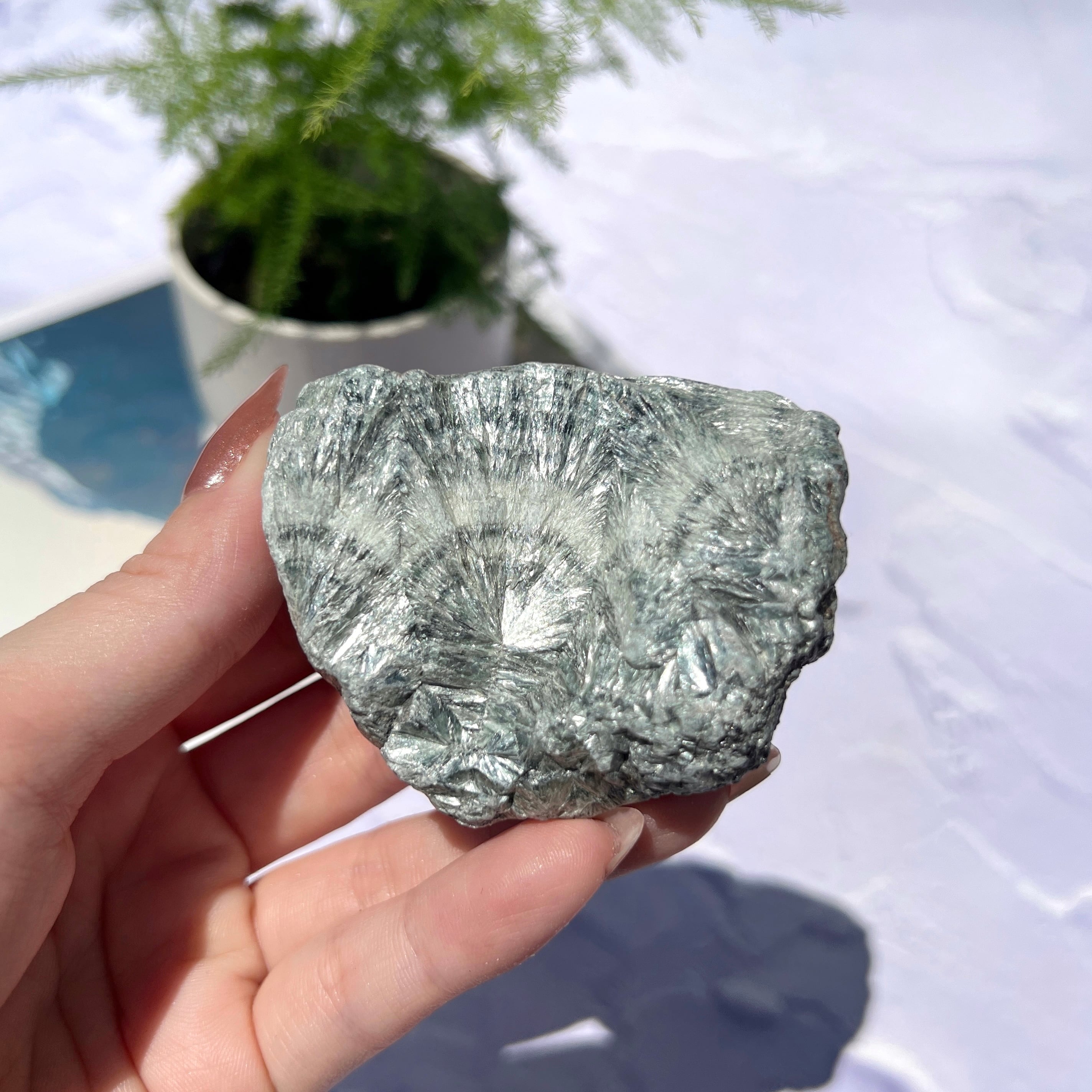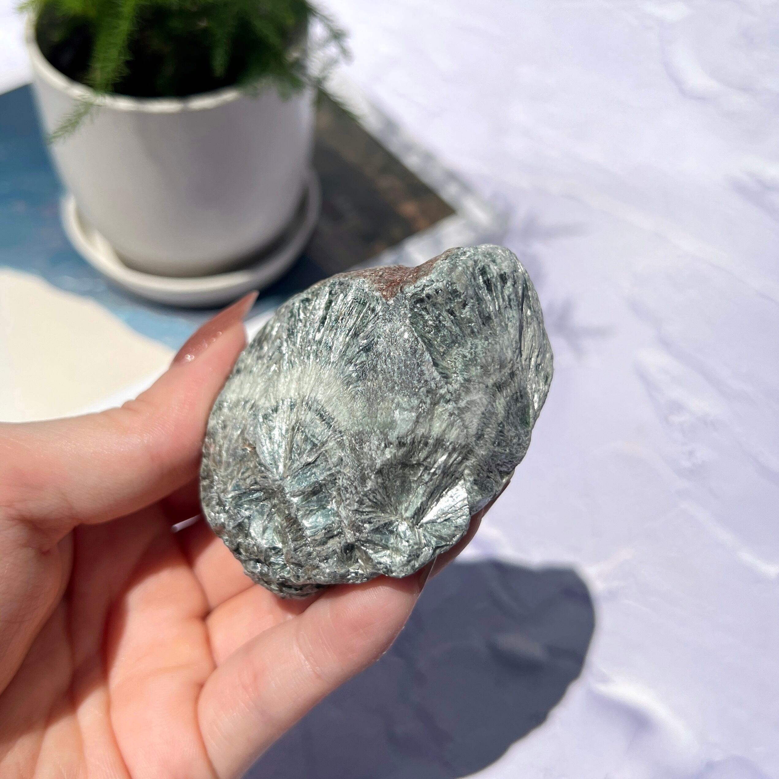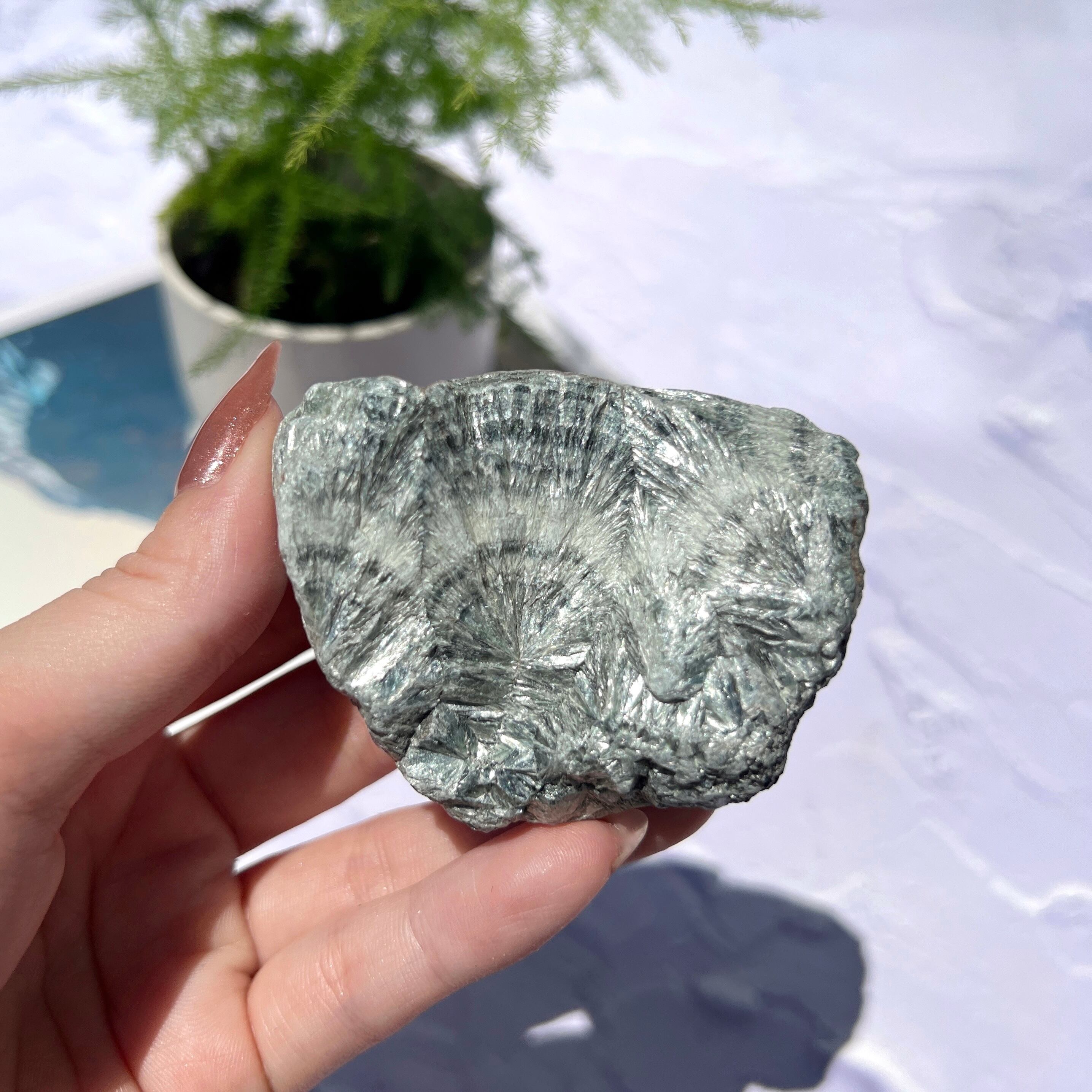 鉱物名はクリノクロア。天使の羽根のような模様を持つことから、旧約聖書のイザヤ書に登場するセラフィムに由来してその名がつけられました。壮大でありながら、繊細で優しく、親しみやすい雰囲気を感じる石かもしれません。