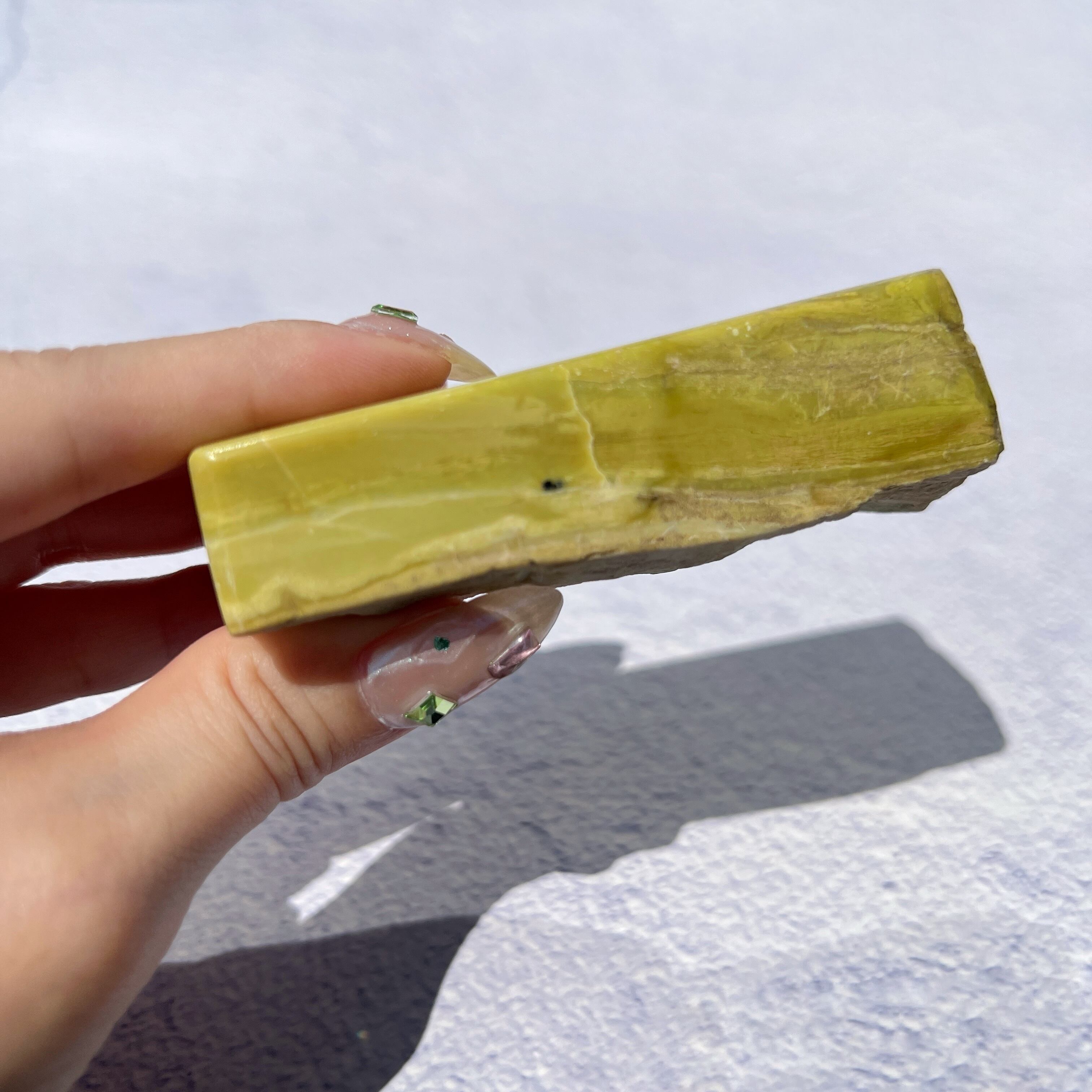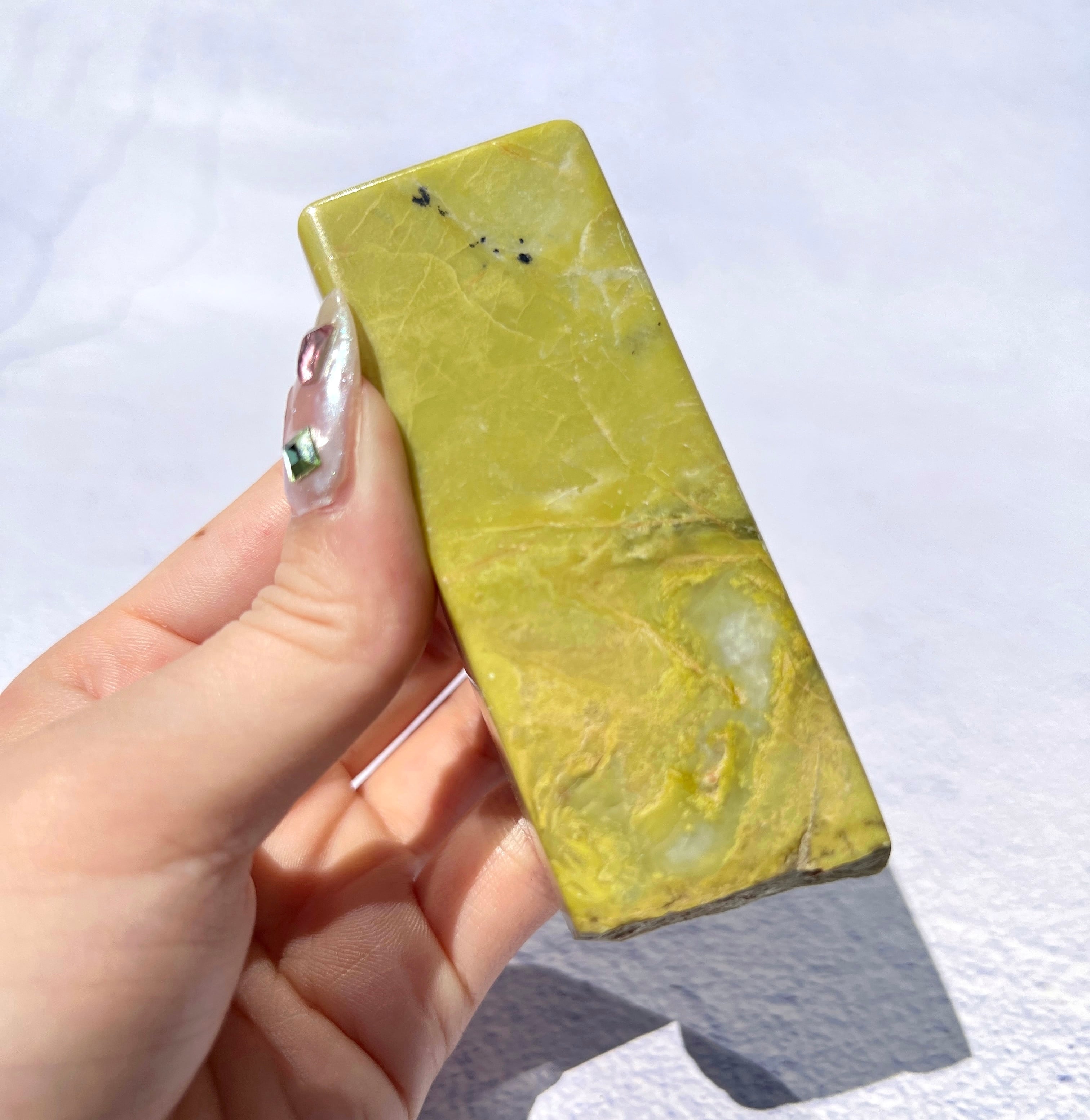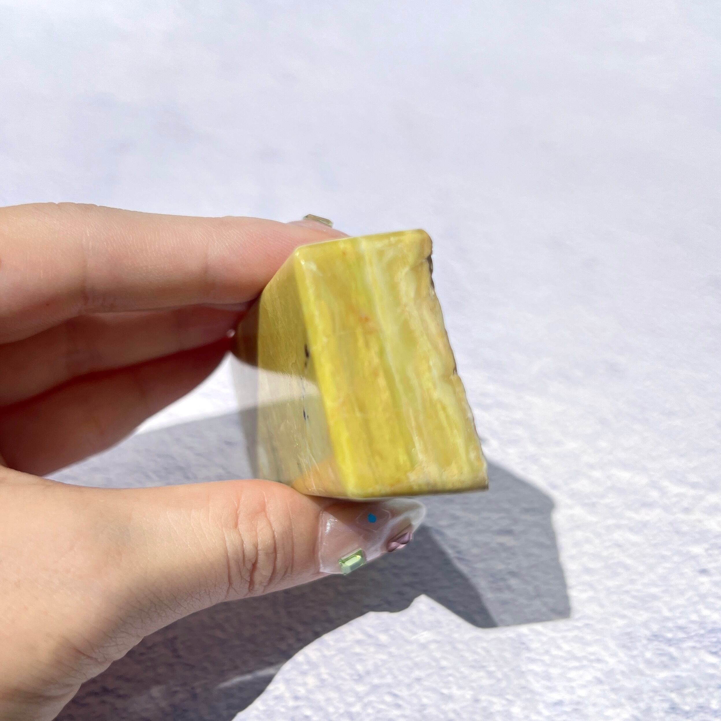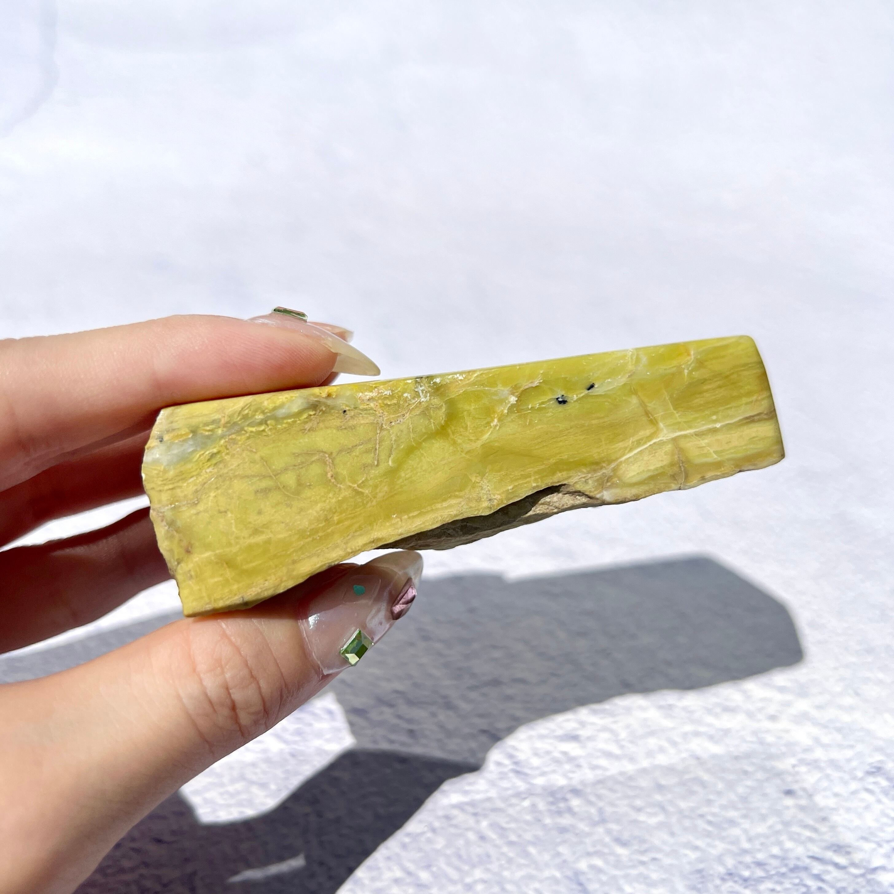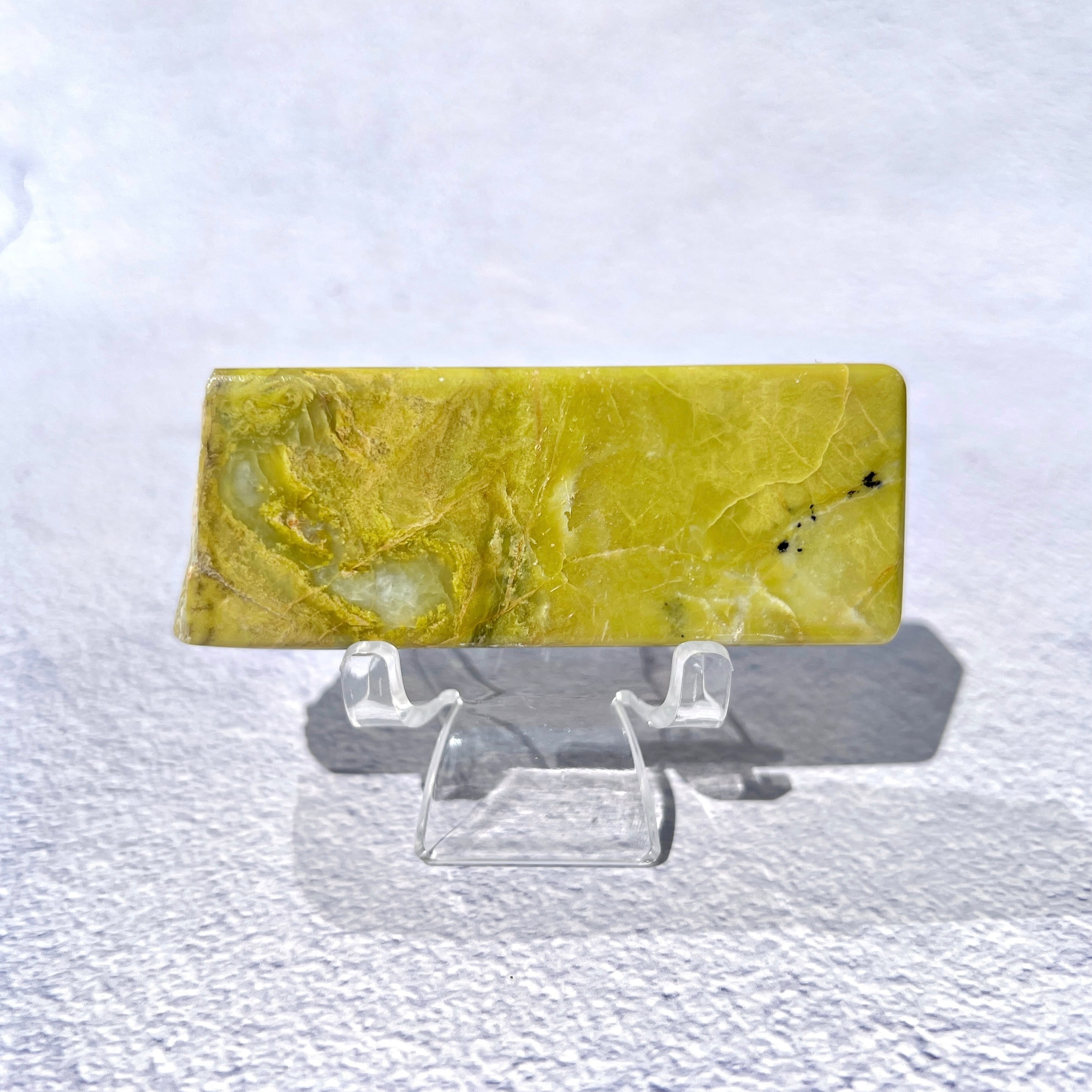 レモンジェイドは、鉱物的にはカルサイトとサーペンティンが混合したもので、オフィカルサイトとも呼ばれます。どこを切り取ってもポップなイエローカラーが魅力的です。