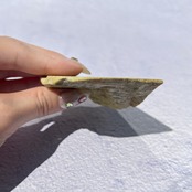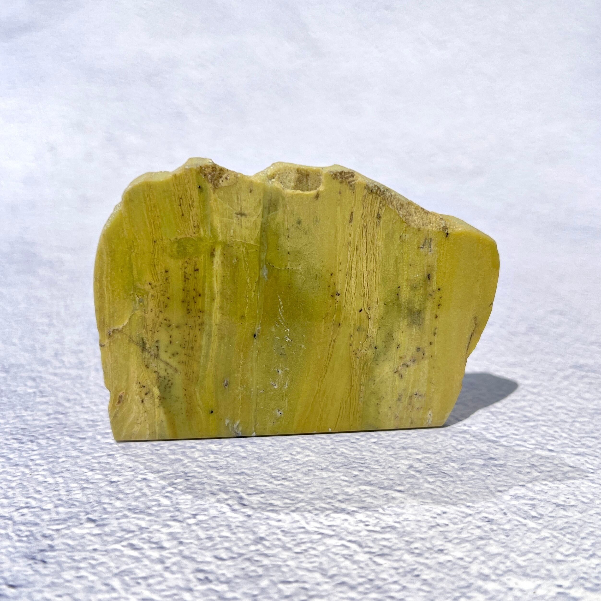レモンジェイドは、鉱物的にはカルサイトとサーペンティンが混合したもので、オフィカルサイトとも呼ばれます。どこを切り取ってもポップなイエローカラーが魅力的です。