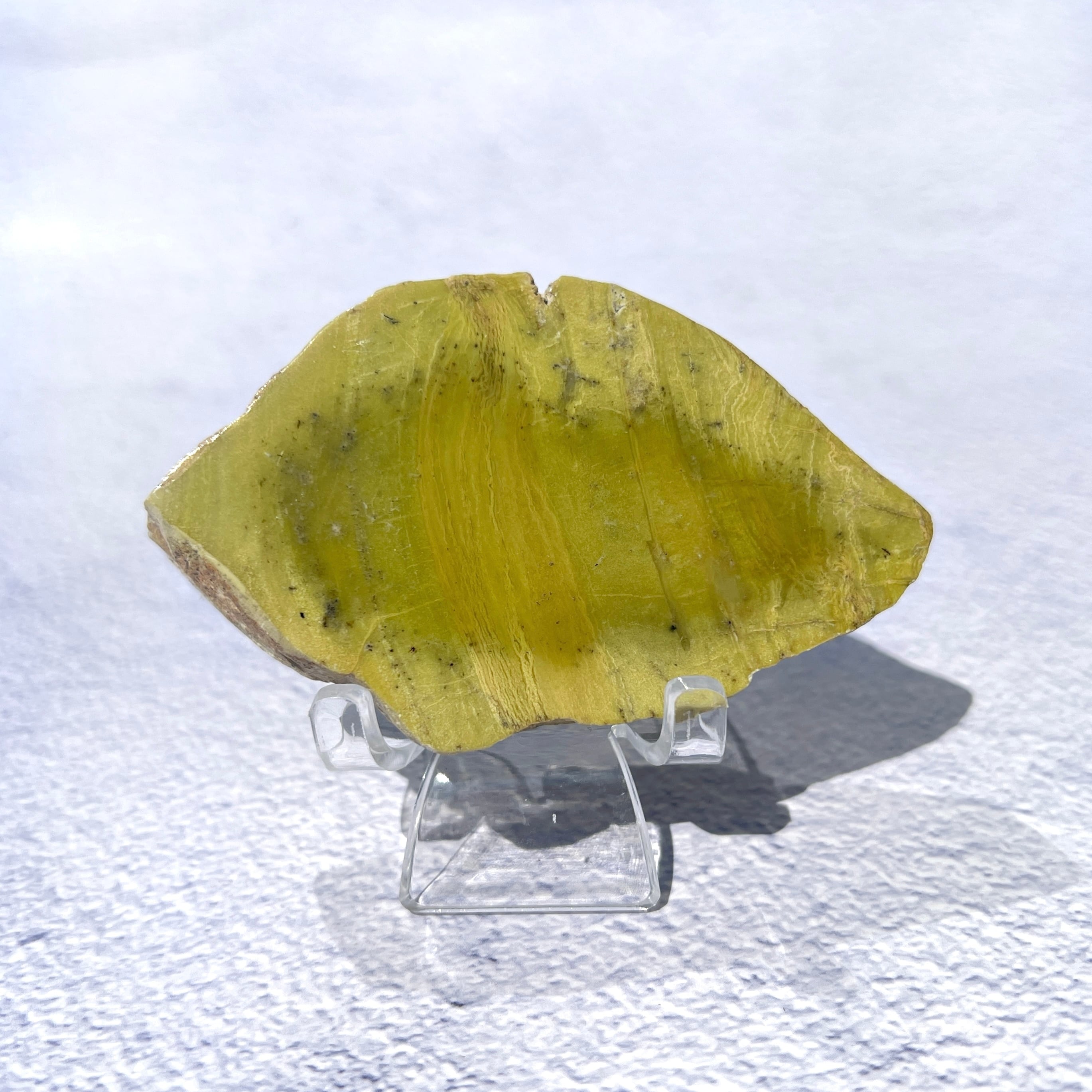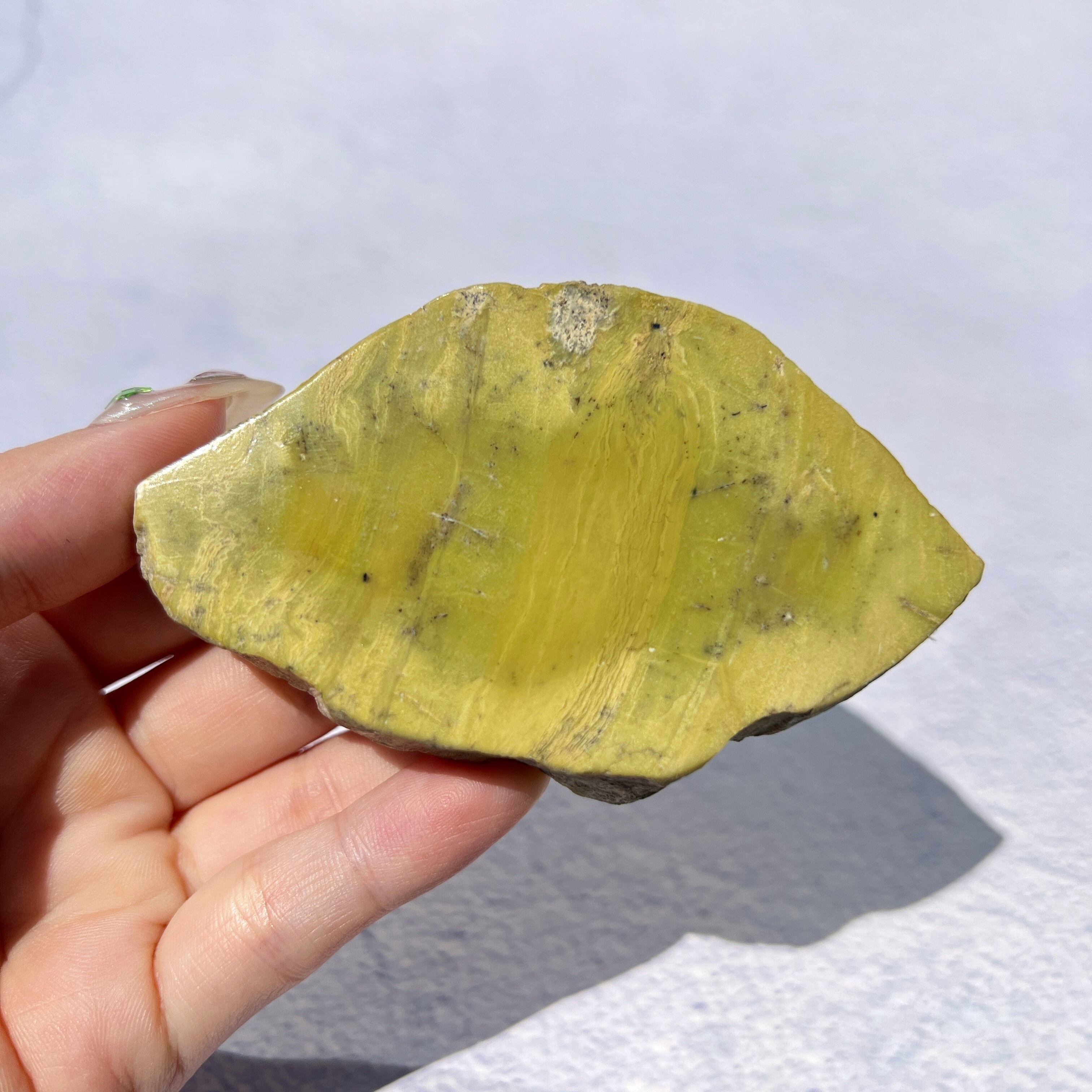 レモンジェイドは、鉱物的にはカルサイトとサーペンティンが混合したもので、オフィカルサイトとも呼ばれます。どこを切り取ってもポップなイエローカラーが魅力的です。