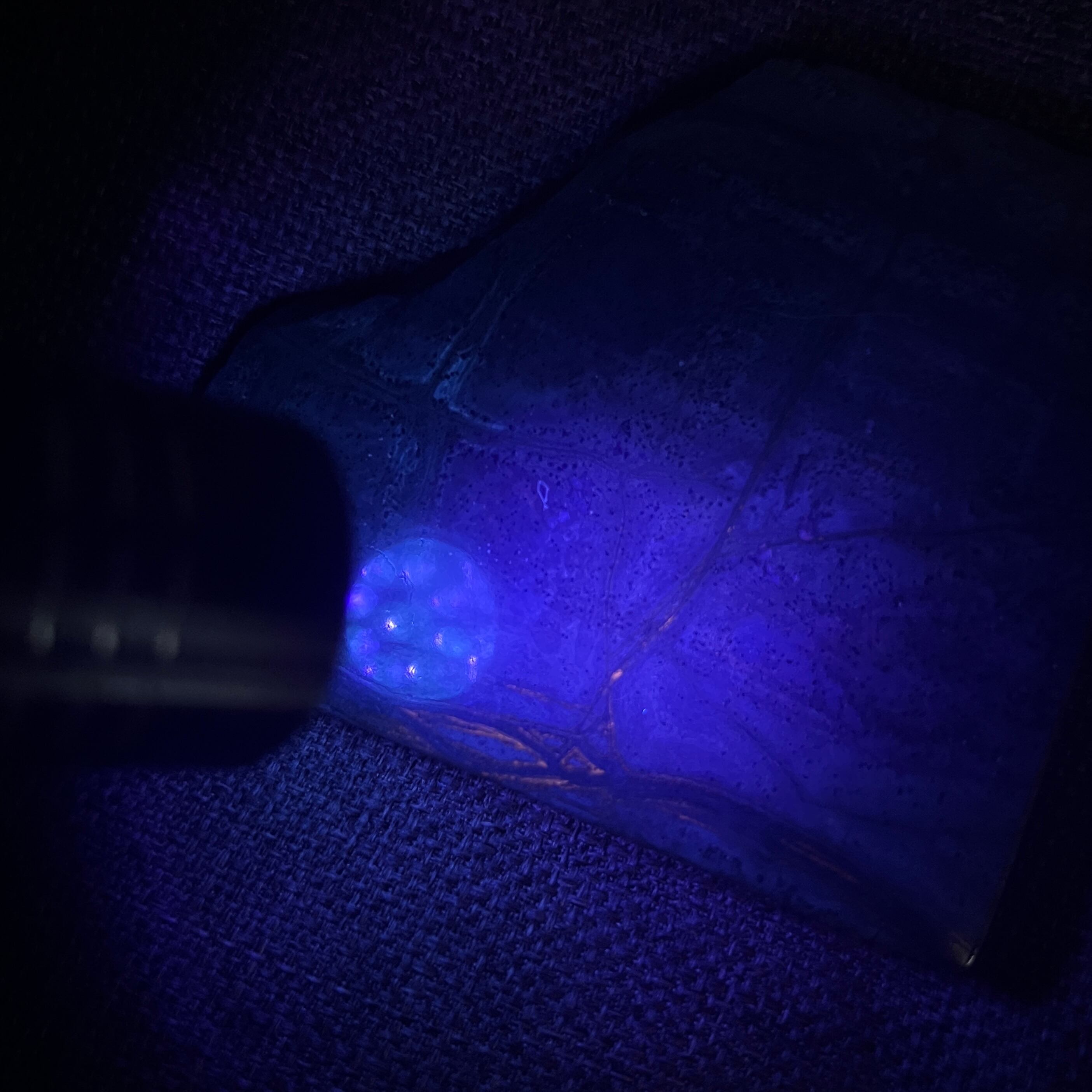 暗所でUVライトを当てると脈のような模様が蛍光します。
