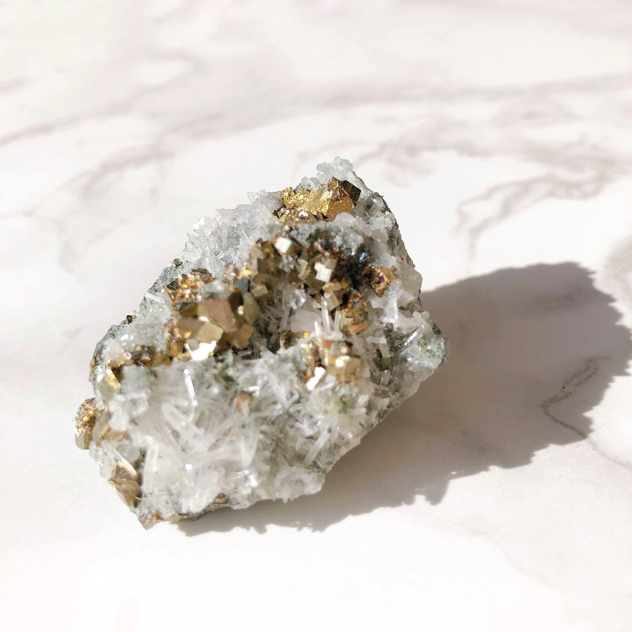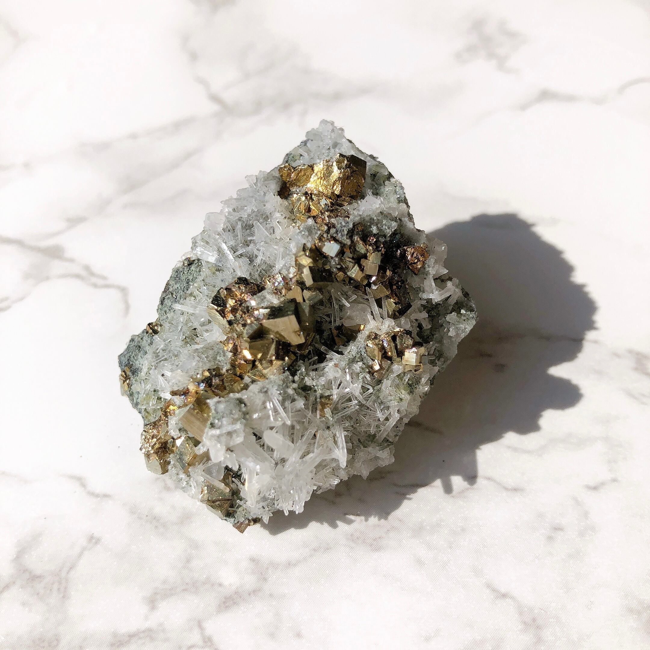 細く小さな水晶クラスター上にパイライトのキューブが散りばめられた、可愛らしい原石。