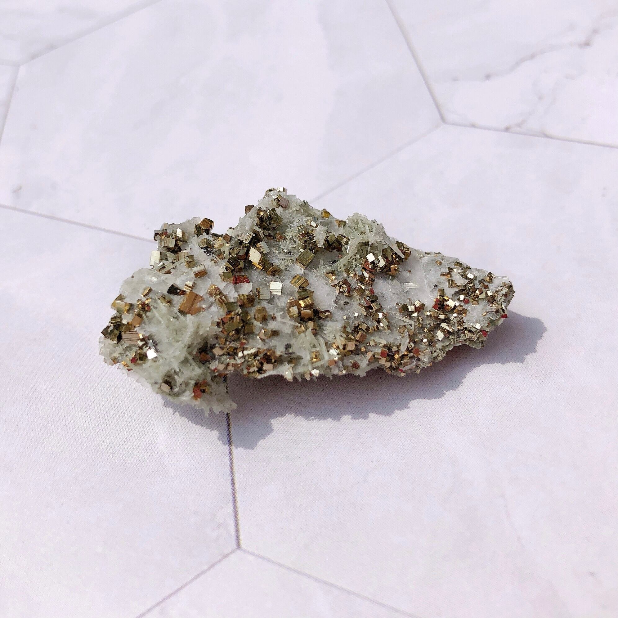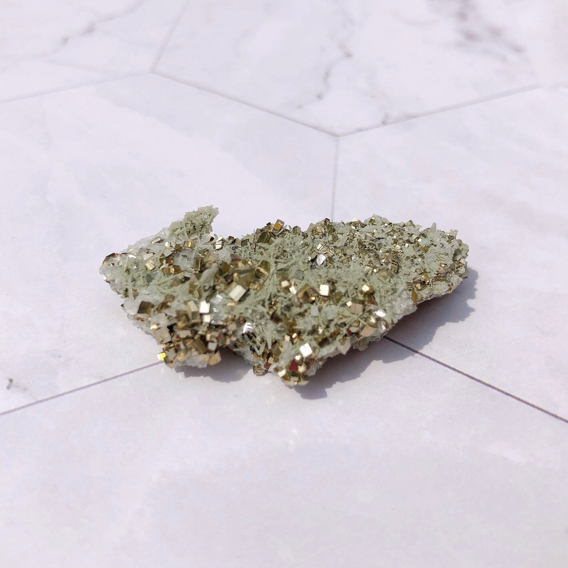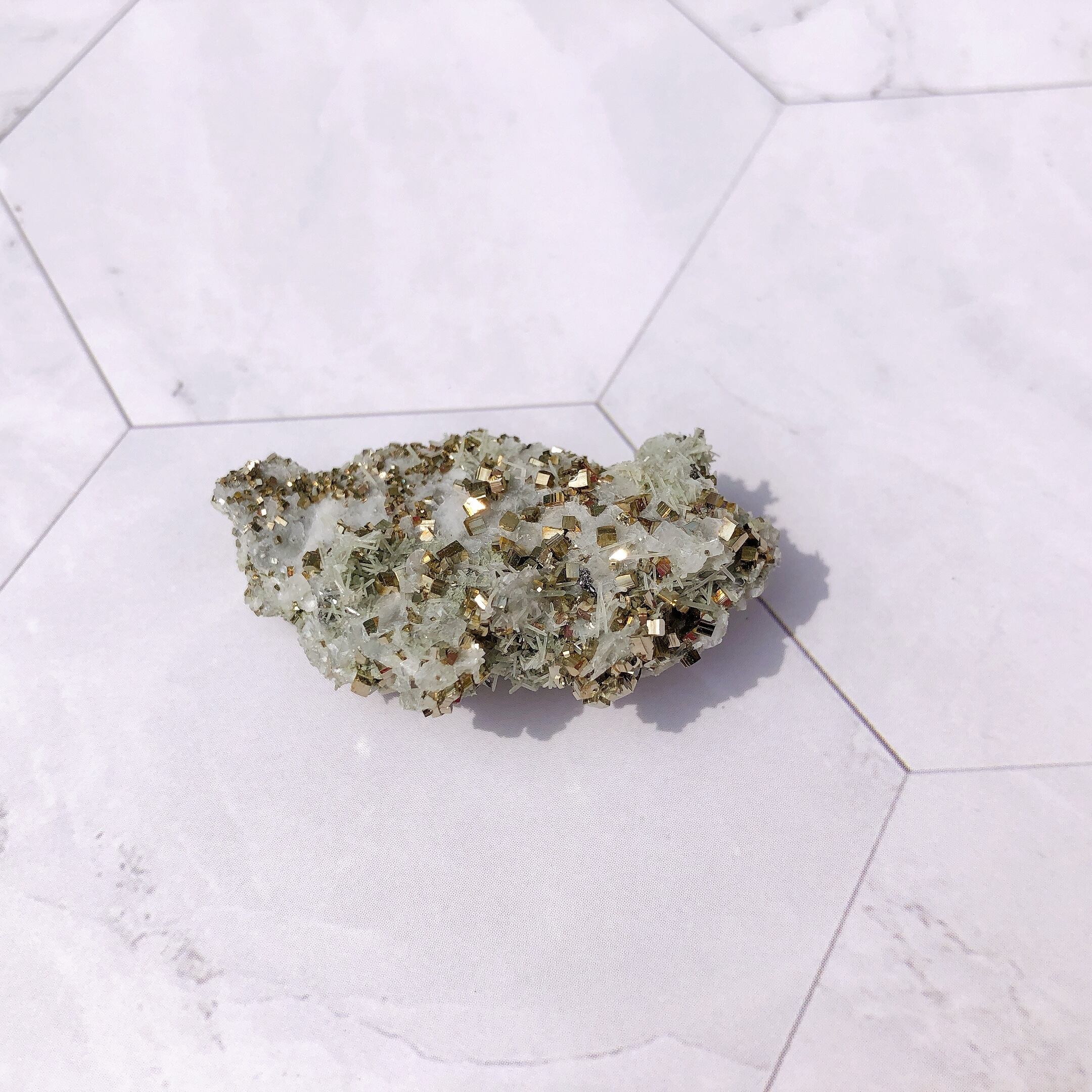 ✺ わずかな摩擦でもパイライトの結晶がいくつか取れる場合がございます。(立方体のパイライトの結晶がそのまま乗っかるように形成されているため) 配送の際、細心の注意を払ってお包み致しますが、それでも結晶が取れることがあります。また、触れる際はそっと手に取ってあげてください。