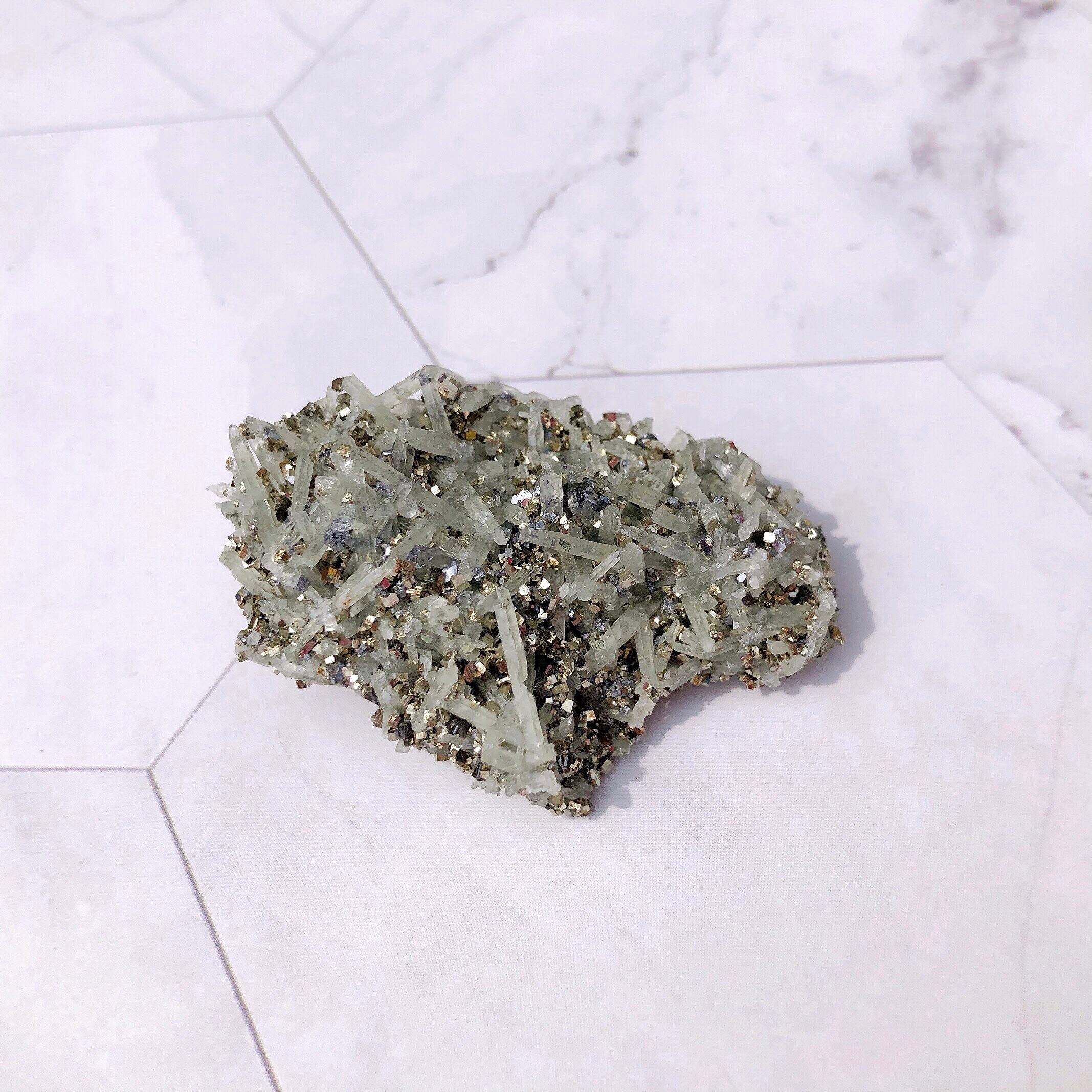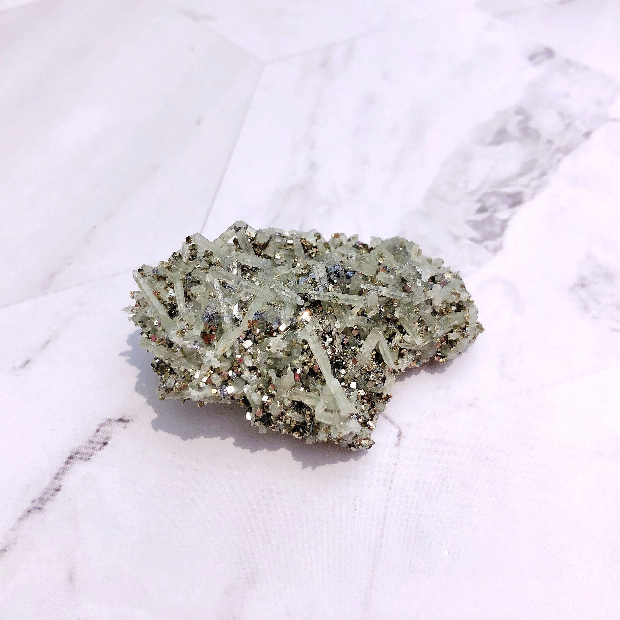 細くて小さな水晶クラスターとパイライトのキューブ⧉が混在した、可愛らしい原石です。