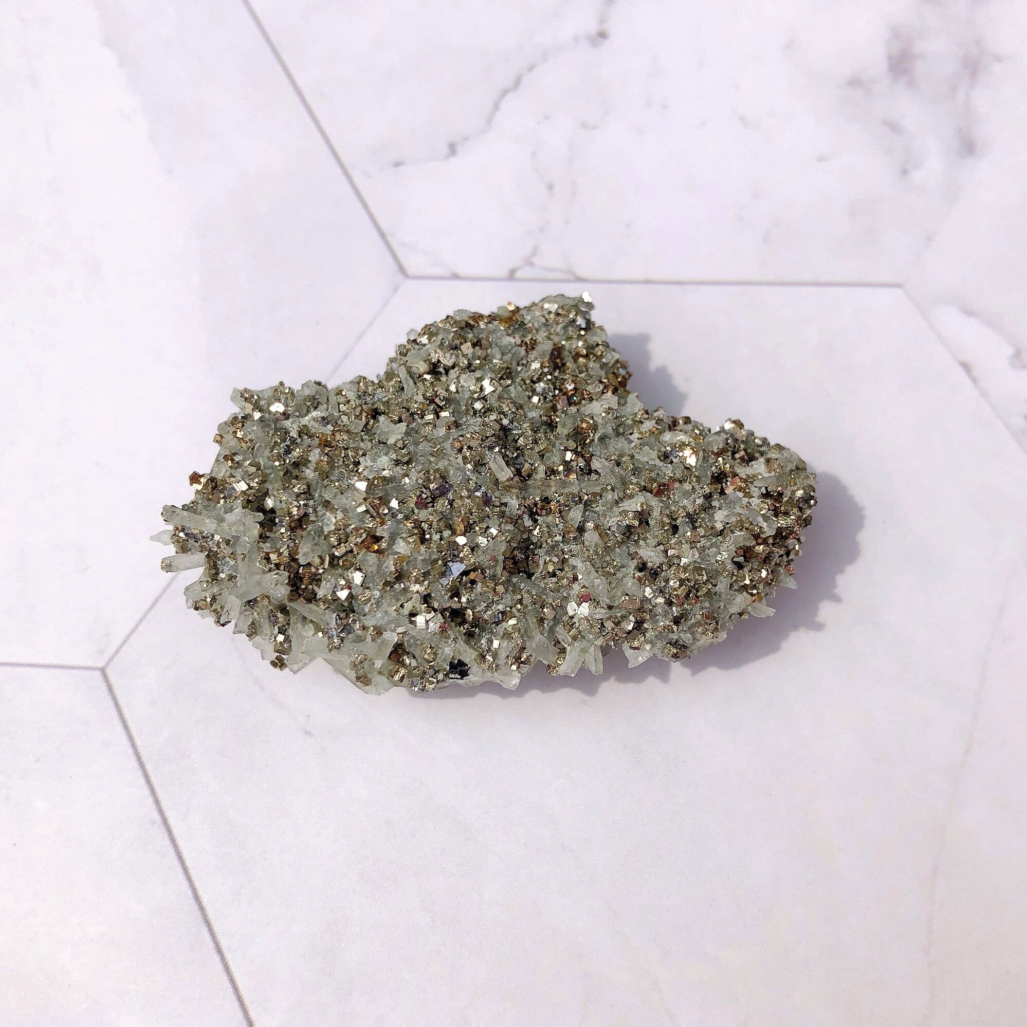 ✺ わずかな摩擦でもパイライトの結晶がいくつか取れる場合がございます。(立方体のパイライトの結晶がそのまま乗っかるように形成されているため) 配送の際、細心の注意を払ってお包み致しますが、それでも結晶が取れることがあります。また、触れる際はそっと手に取ってあげてください。