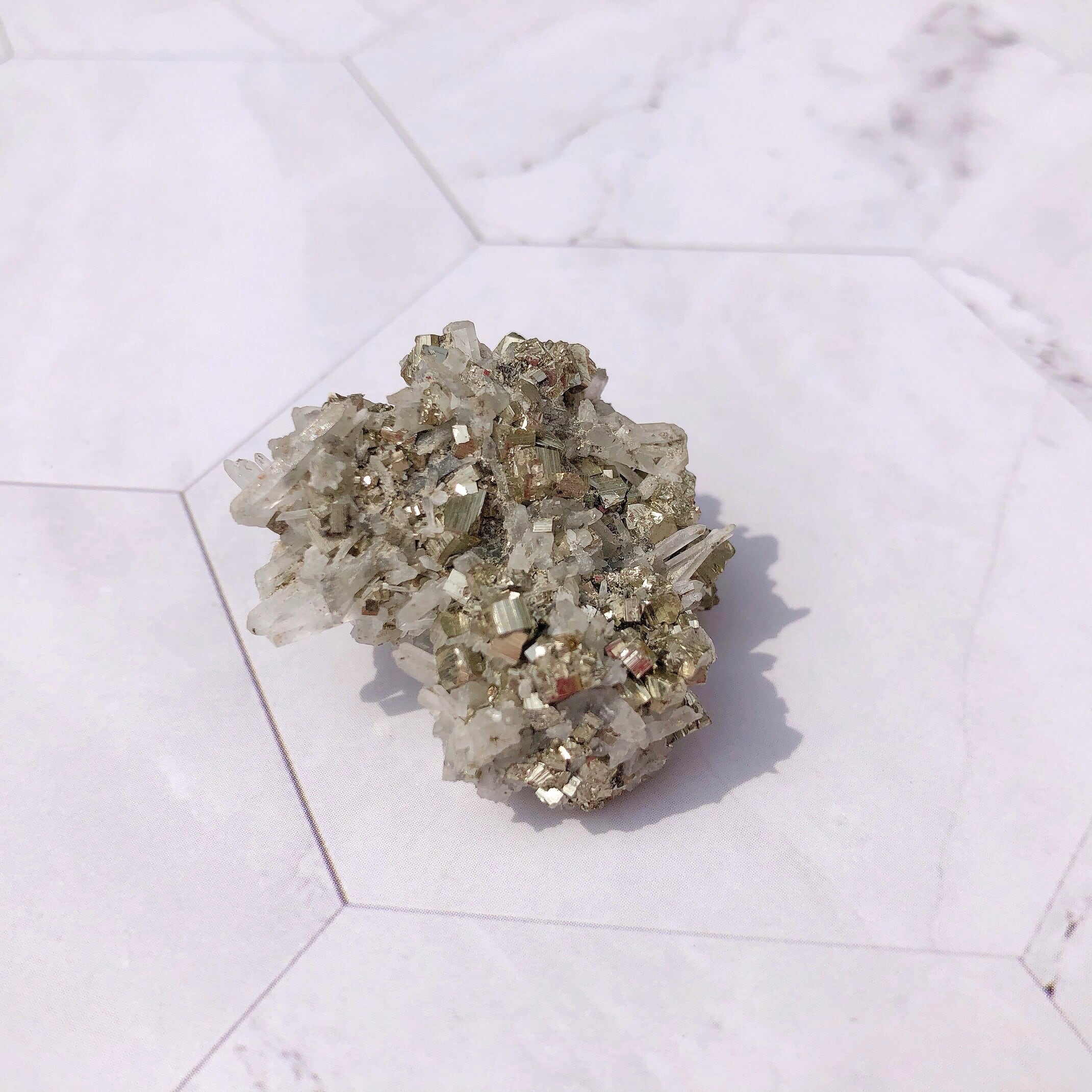 ✺ わずかな摩擦でもパイライトの結晶がいくつか取れる場合がございます。(立方体のパイライトの結晶がそのまま乗っかるように形成されているため) 配送の際、細心の注意を払ってお包み致しますが、それでも結晶が取れることがあります。また、触れる際はそっと手に取ってあげてください。