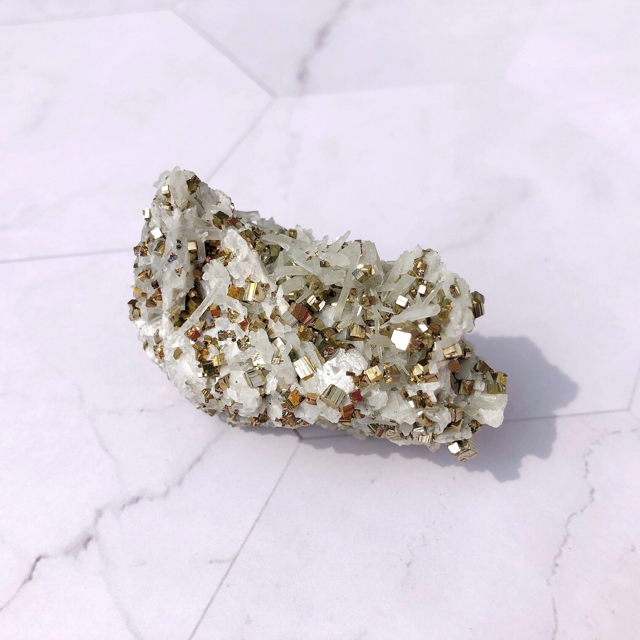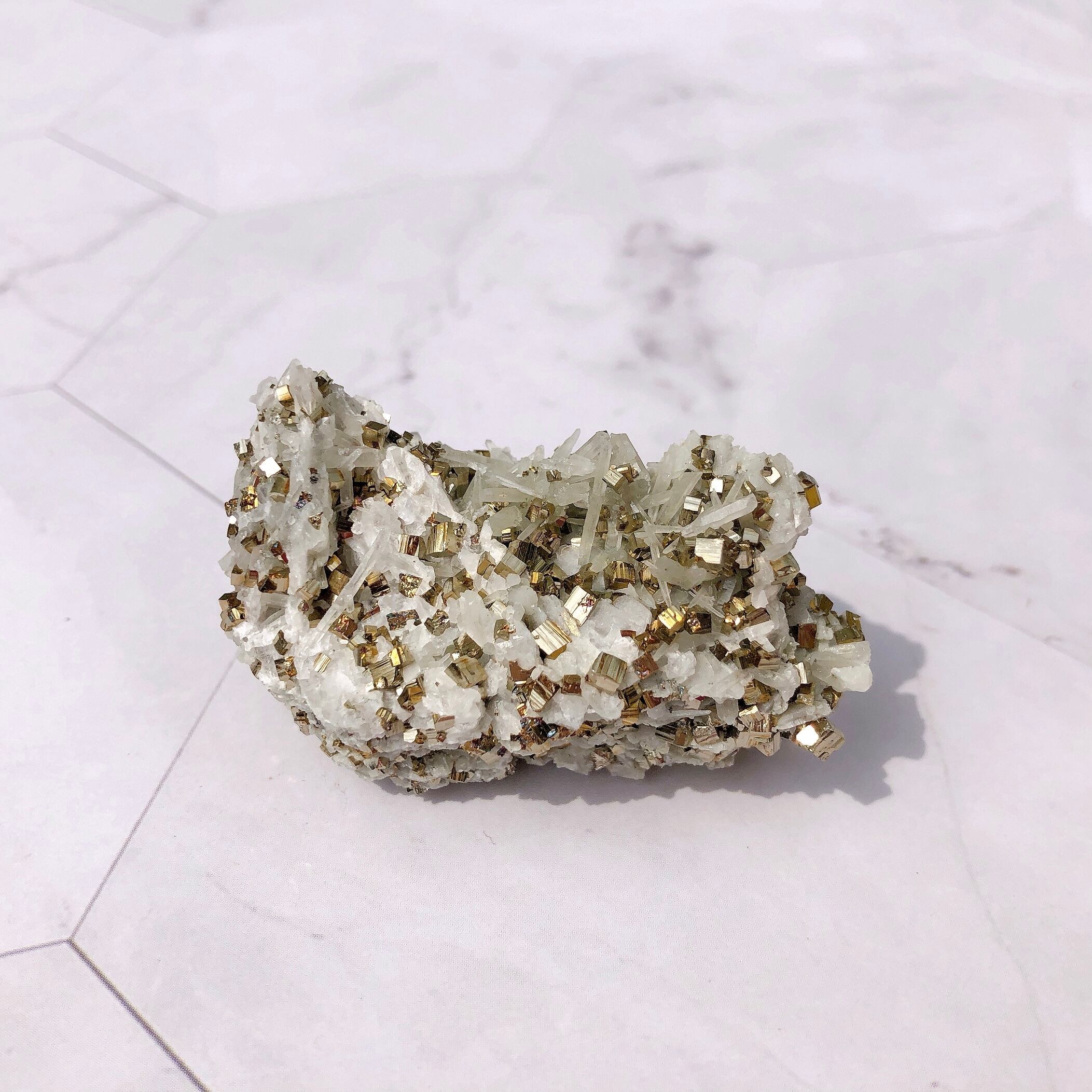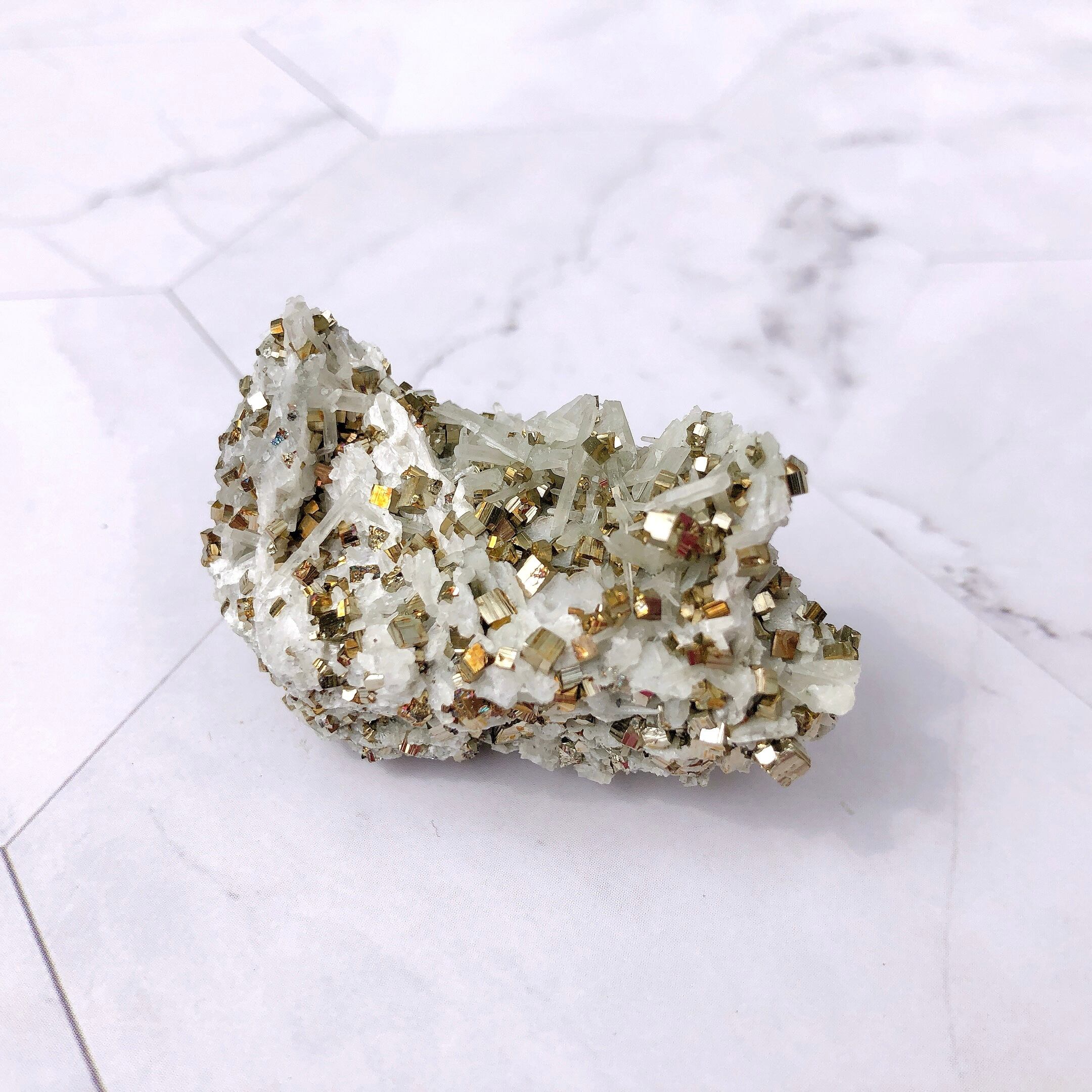 ✺ わずかな摩擦でもパイライトの結晶がいくつか取れる場合がございます。(立方体のパイライトの結晶がそのまま乗っかるように形成されているため) 配送の際、細心の注意を払ってお包み致しますが、それでも結晶が取れることがあります。また、触れる際はそっと手に取ってあげてください。
