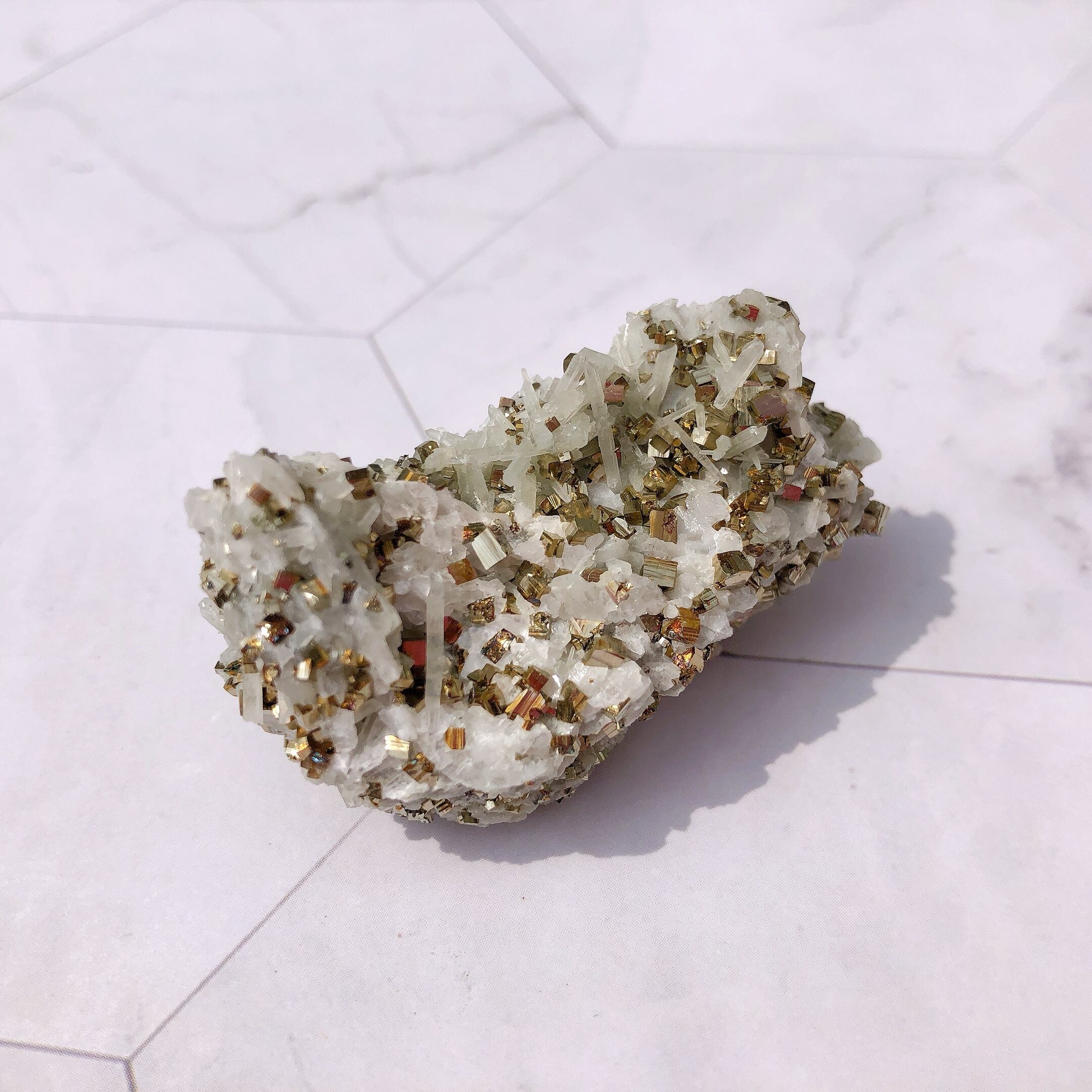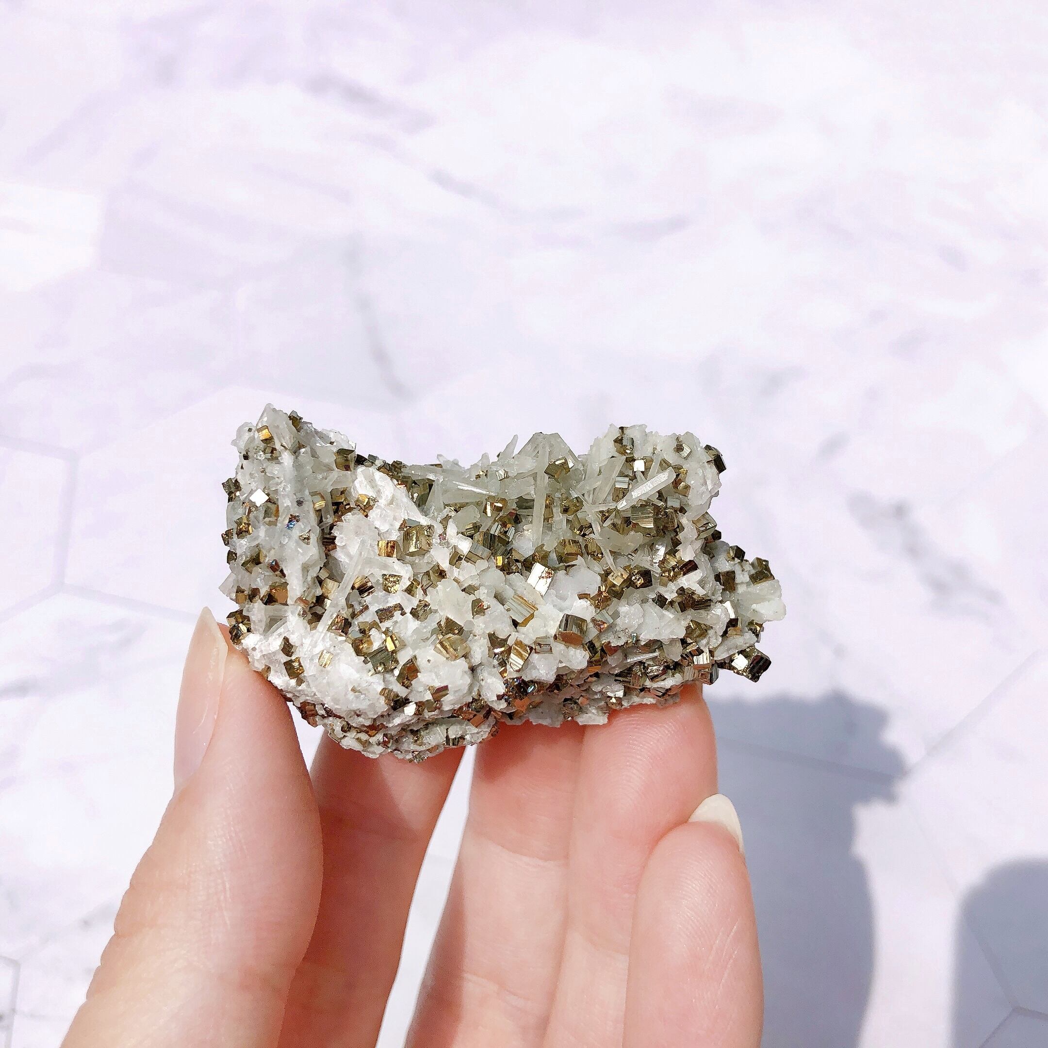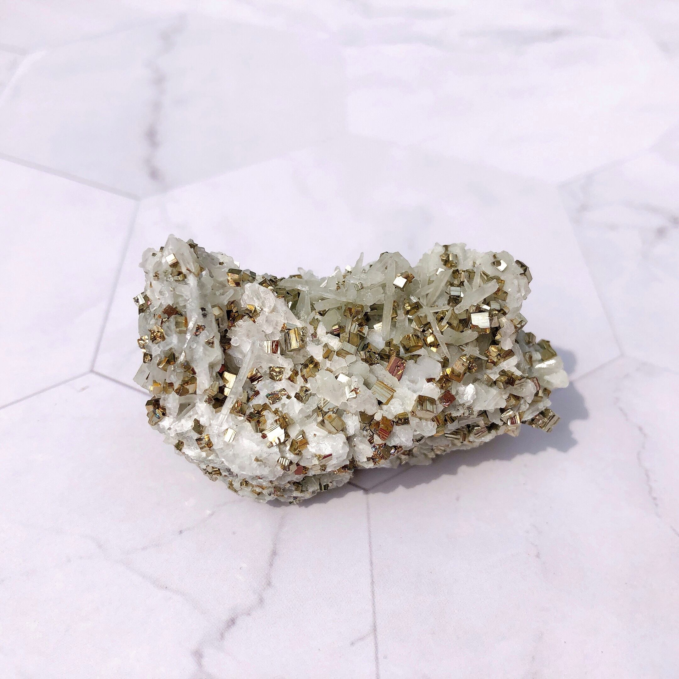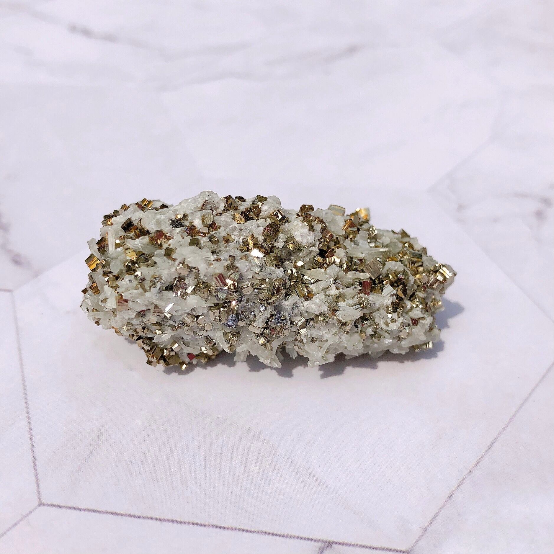 ✺ わずかな摩擦でもパイライトの結晶がいくつか取れる場合がございます。(立方体のパイライトの結晶がそのまま乗っかるように形成されているため) 配送の際、細心の注意を払ってお包み致しますが、それでも結晶が取れることがあります。また、触れる際はそっと手に取ってあげてください。