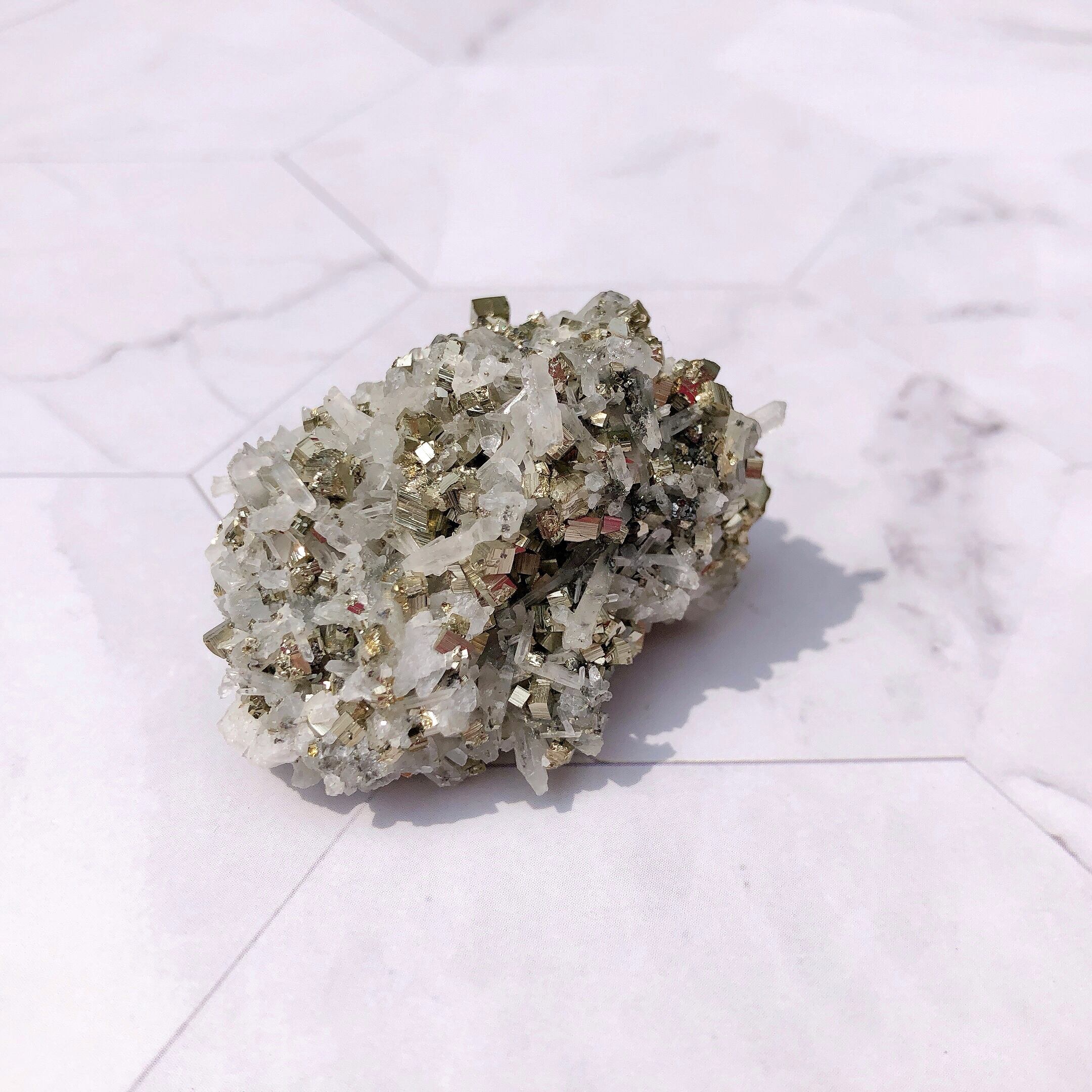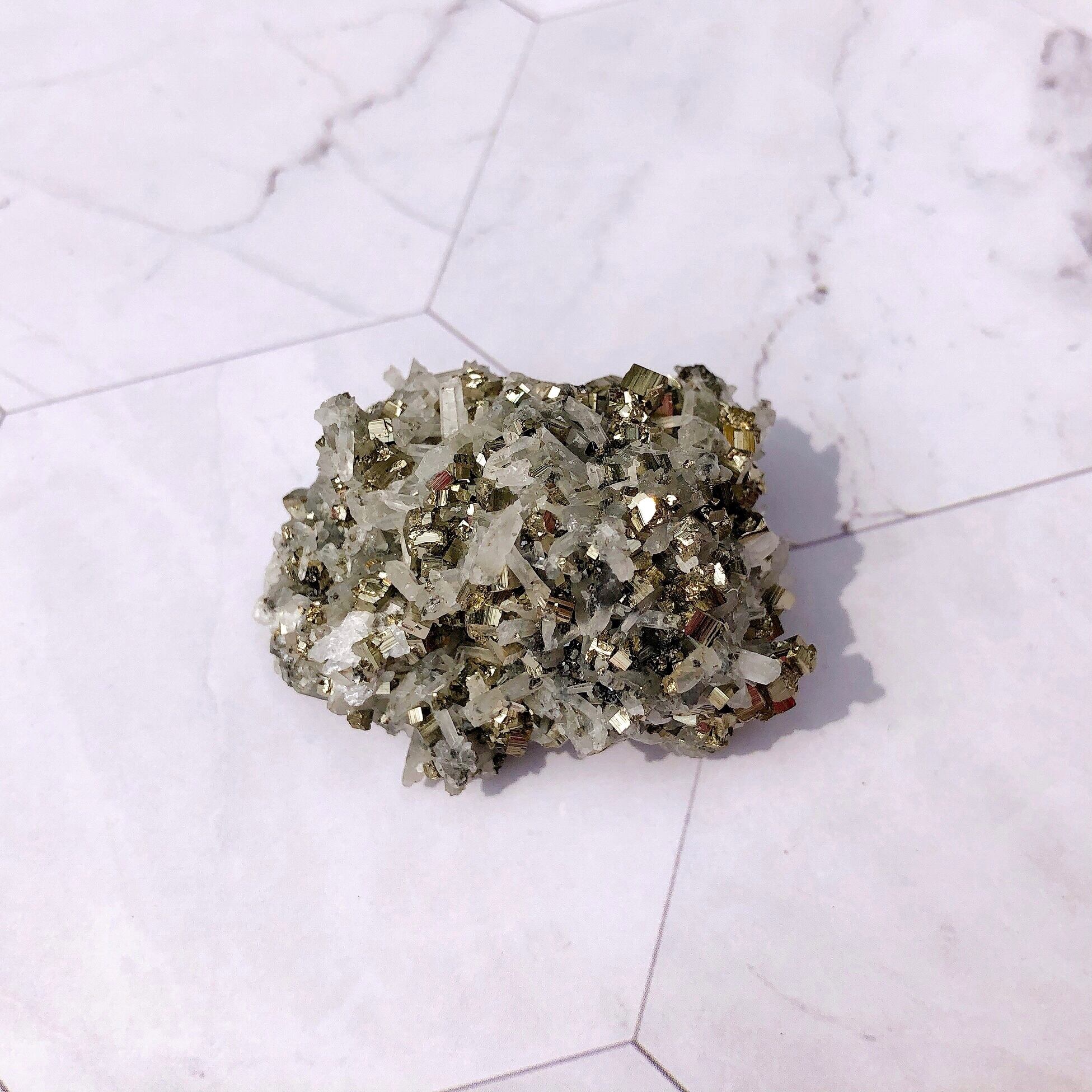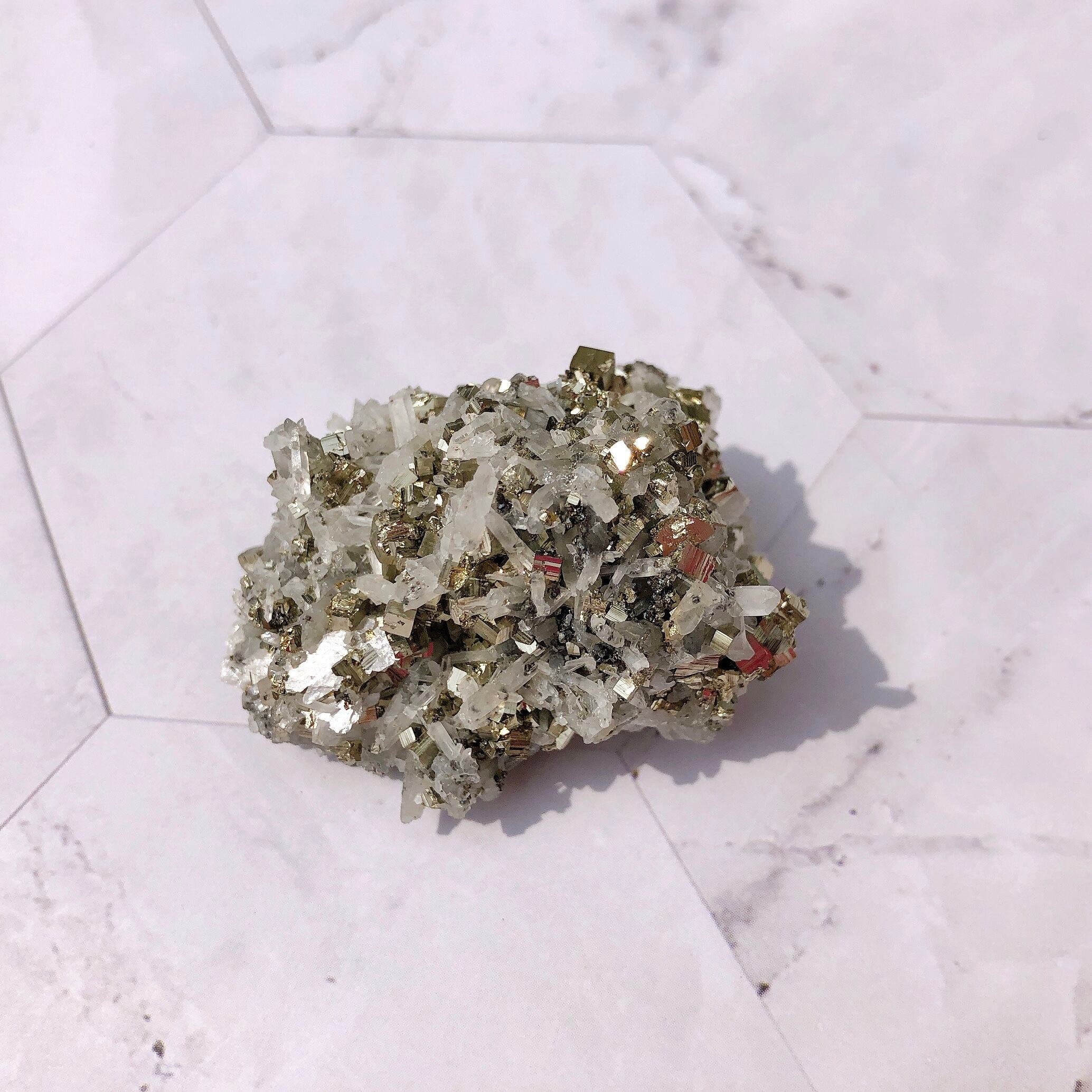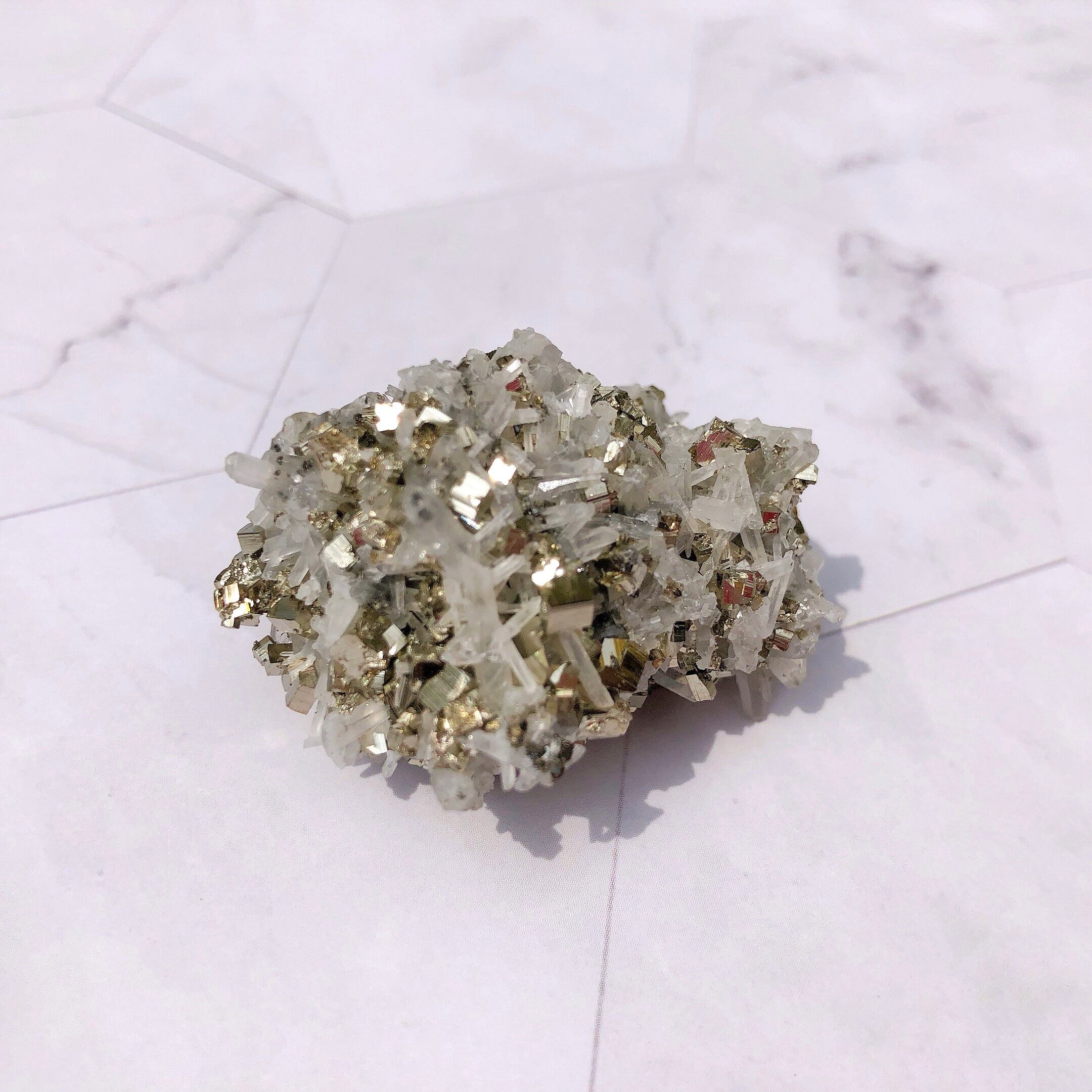 ✺ わずかな摩擦でもパイライトの結晶がいくつか取れる場合がございます。(立方体のパイライトの結晶がそのまま乗っかるように形成されているため) 配送の際、細心の注意を払ってお包み致しますが、それでも結晶が取れることがあります。また、触れる際はそっと手に取ってあげてください。