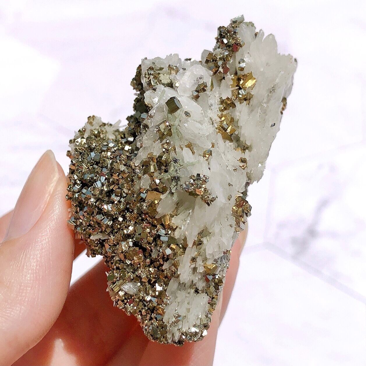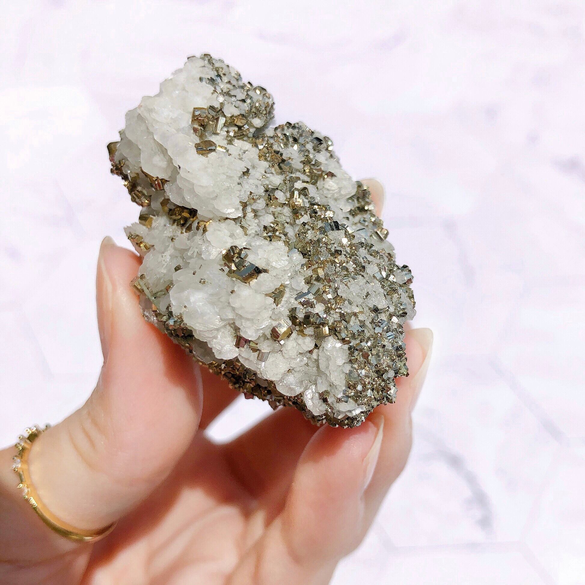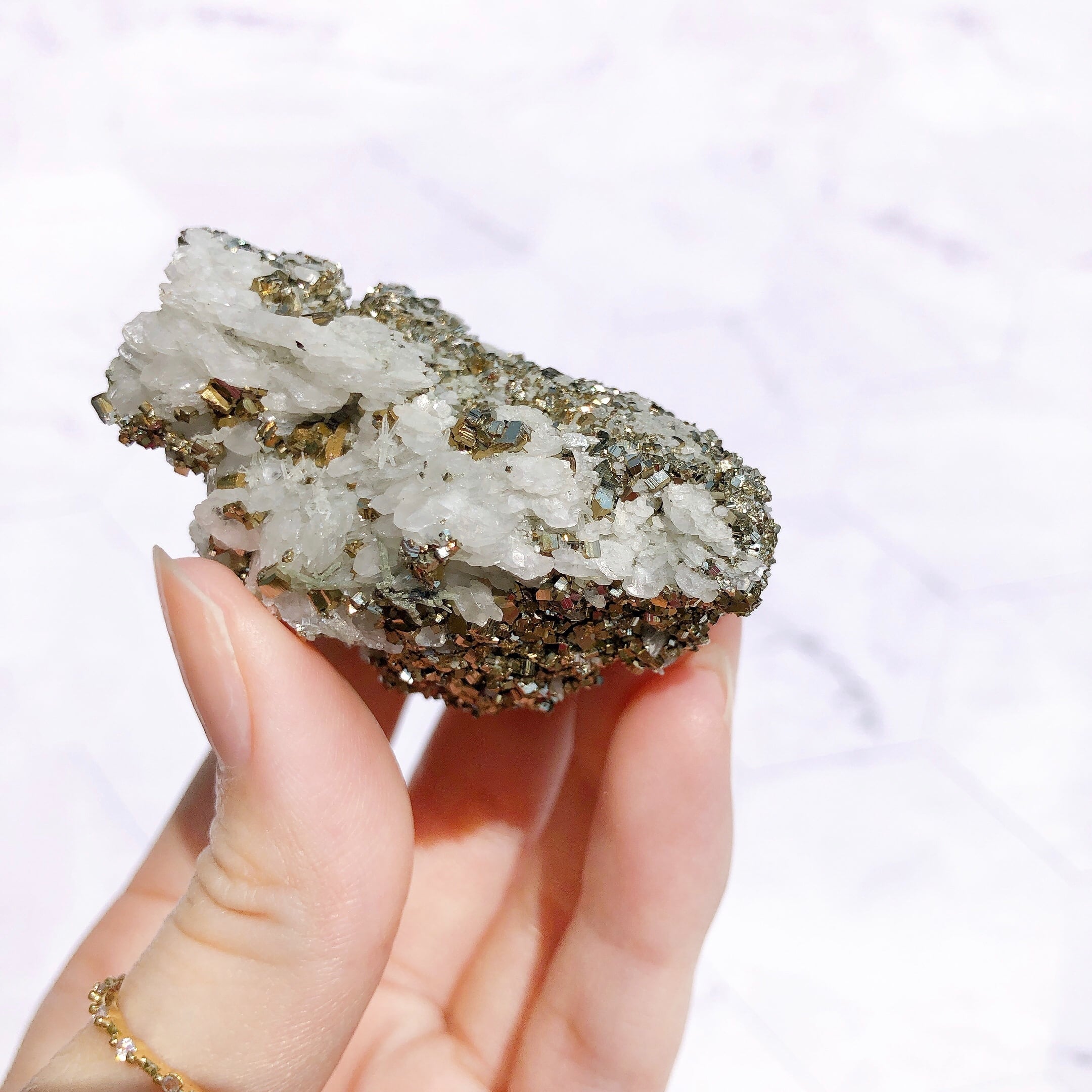 ✺ わずかな摩擦でもパイライトの結晶がいくつか取れる場合がございます。(立方体のパイライトの結晶がそのまま乗っかるように形成されているため) 配送の際、細心の注意を払ってお包み致しますが、それでも結晶が取れることがあります。また、触れる際はそっと手に取ってあげてください。