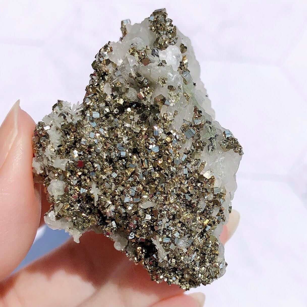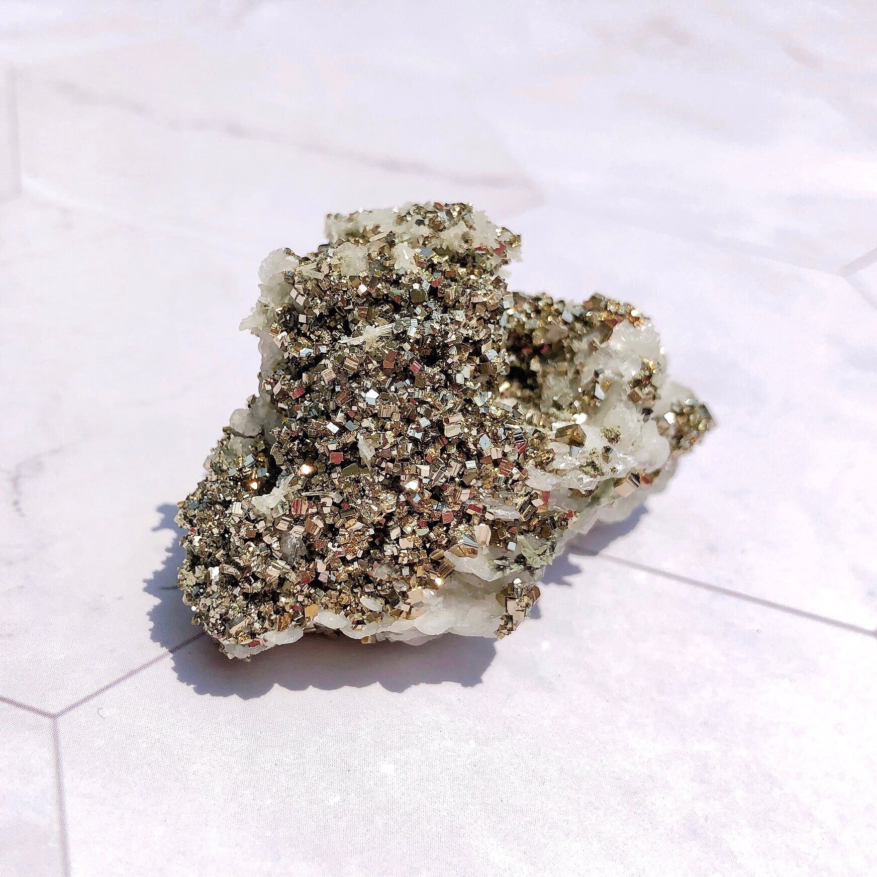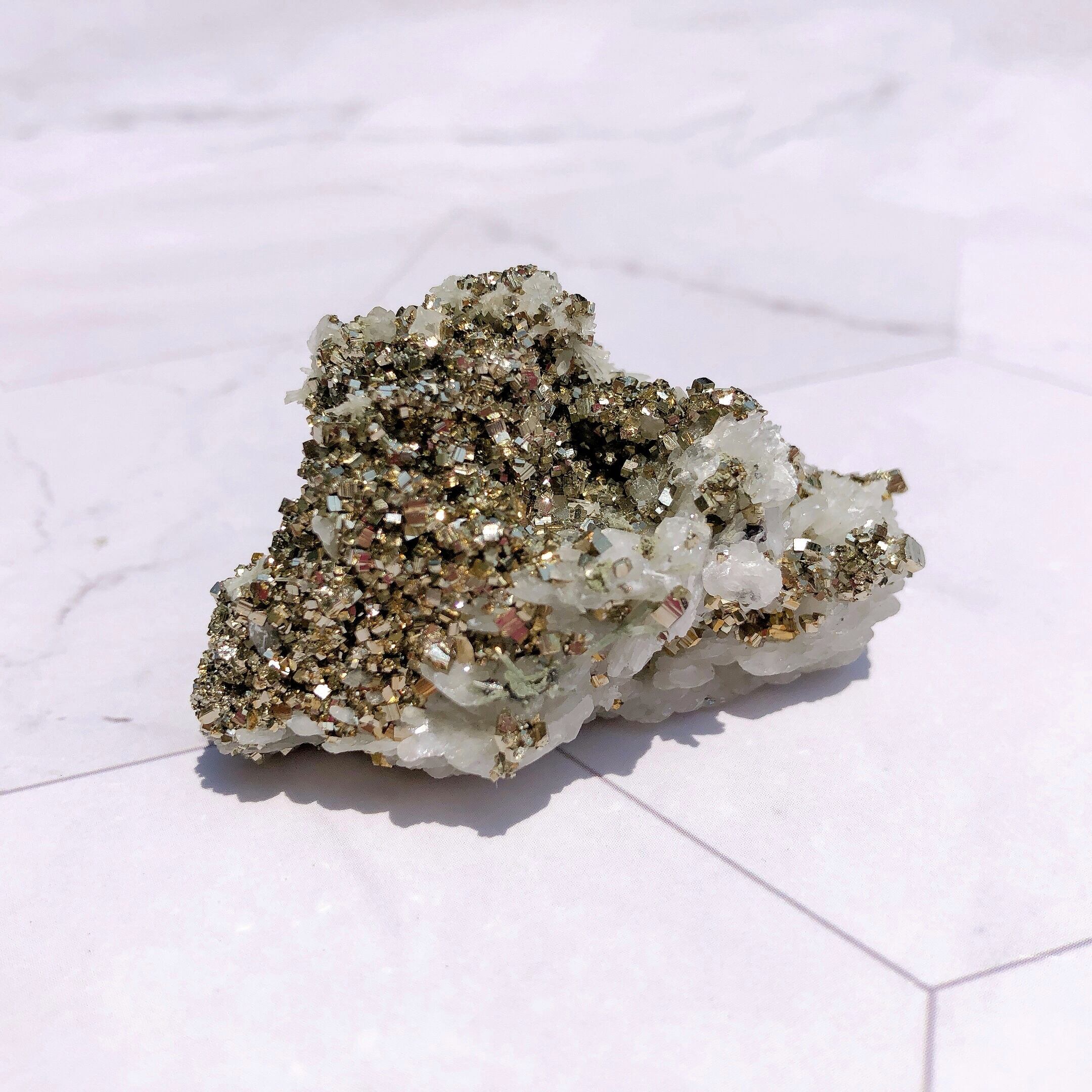 ✺ わずかな摩擦でもパイライトの結晶がいくつか取れる場合がございます。(立方体のパイライトの結晶がそのまま乗っかるように形成されているため) 配送の際、細心の注意を払ってお包み致しますが、それでも結晶が取れることがあります。また、触れる際はそっと手に取ってあげてください。