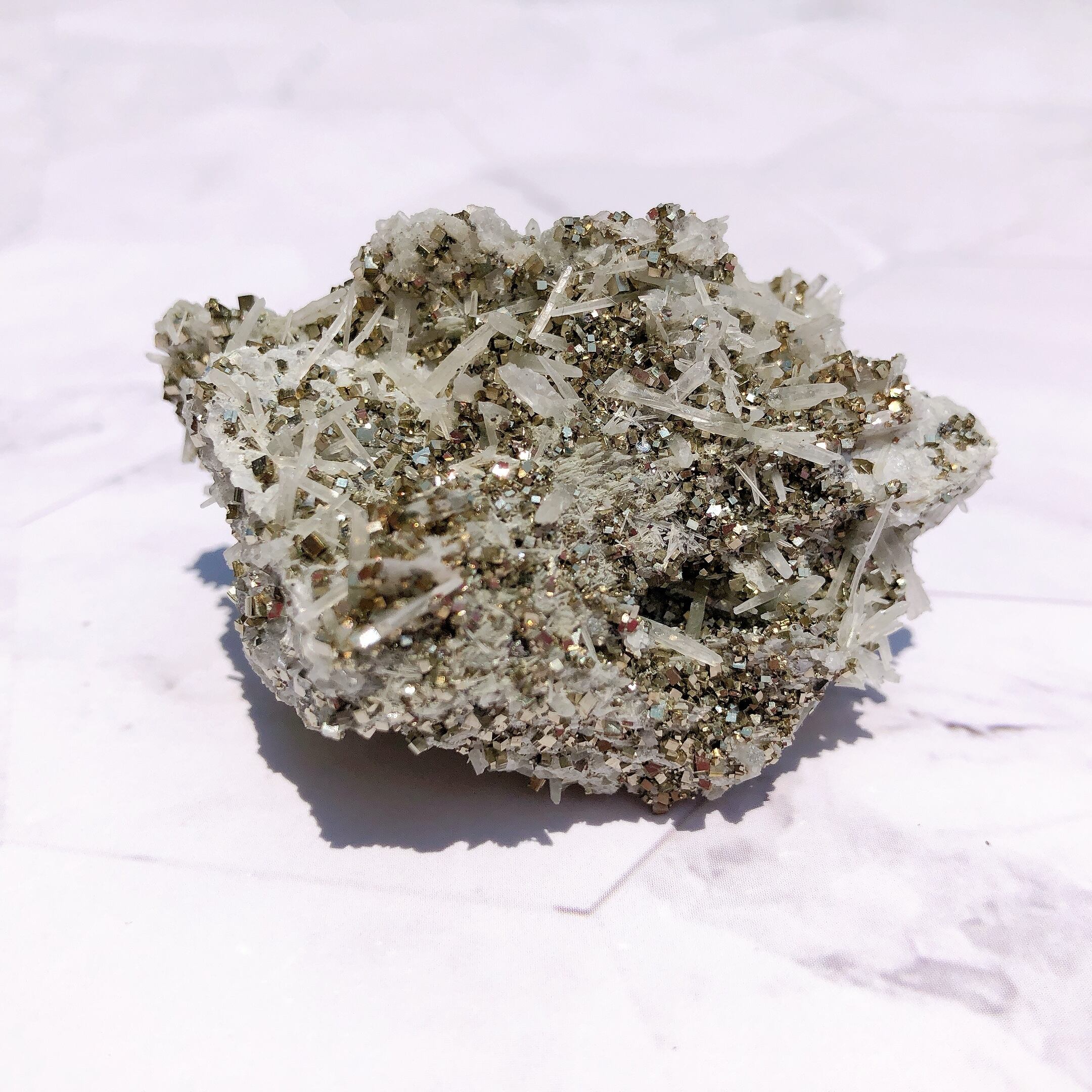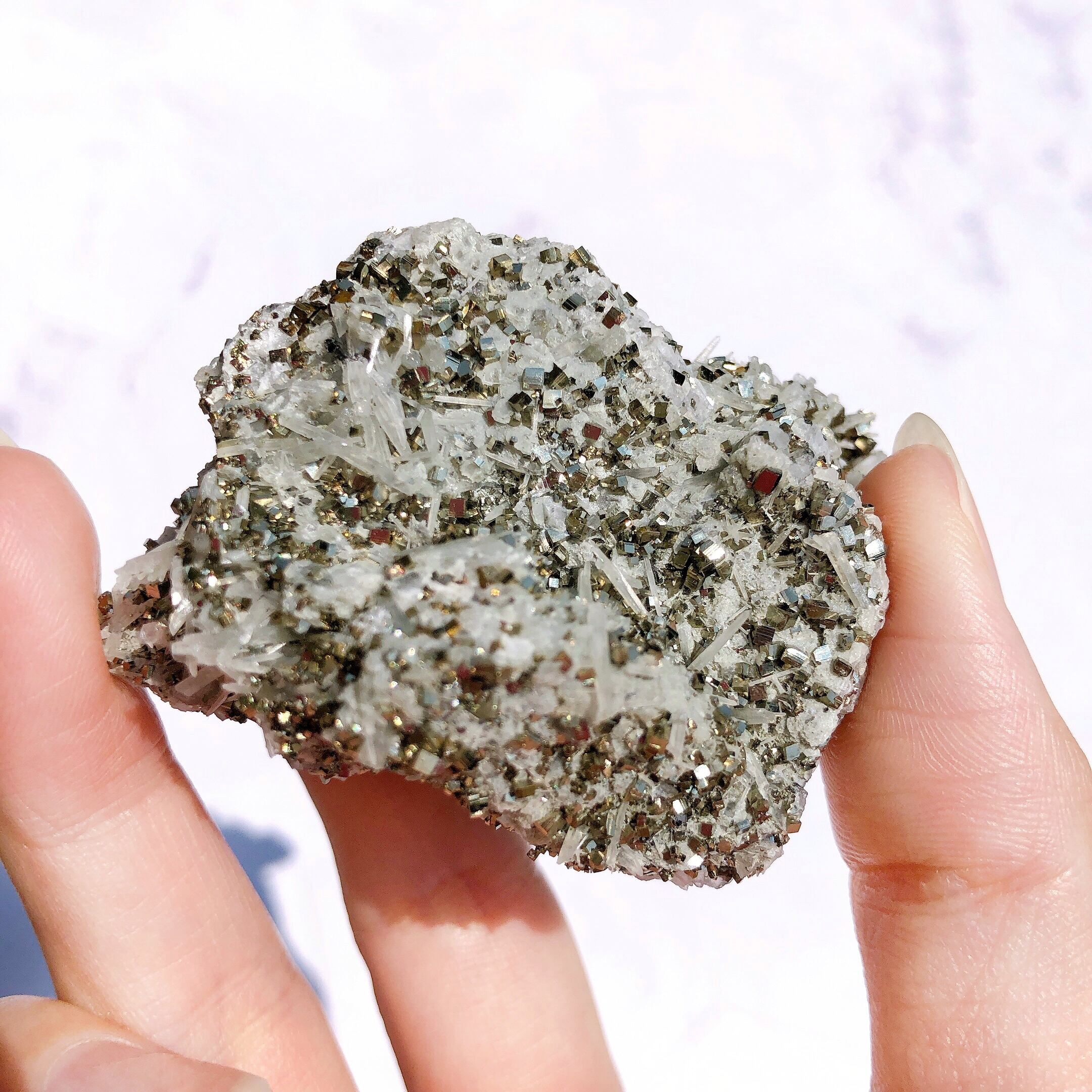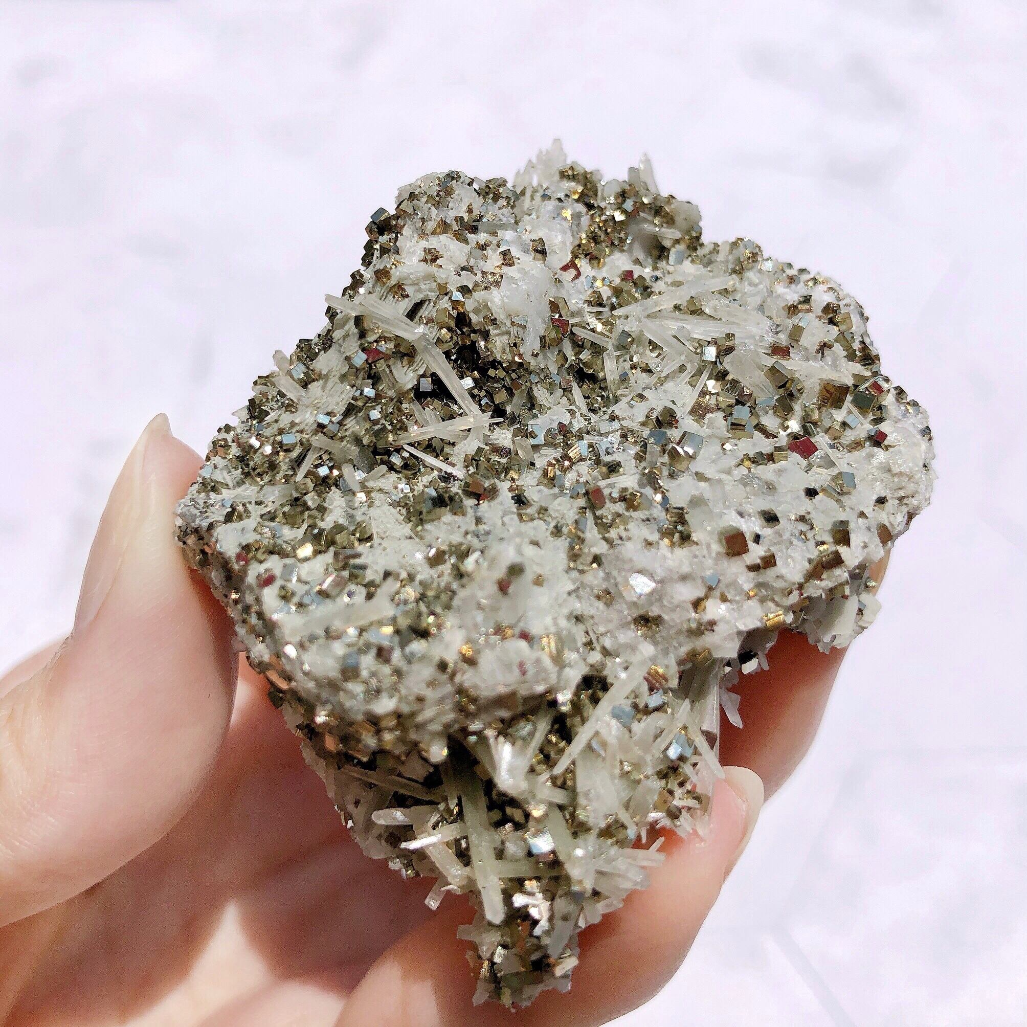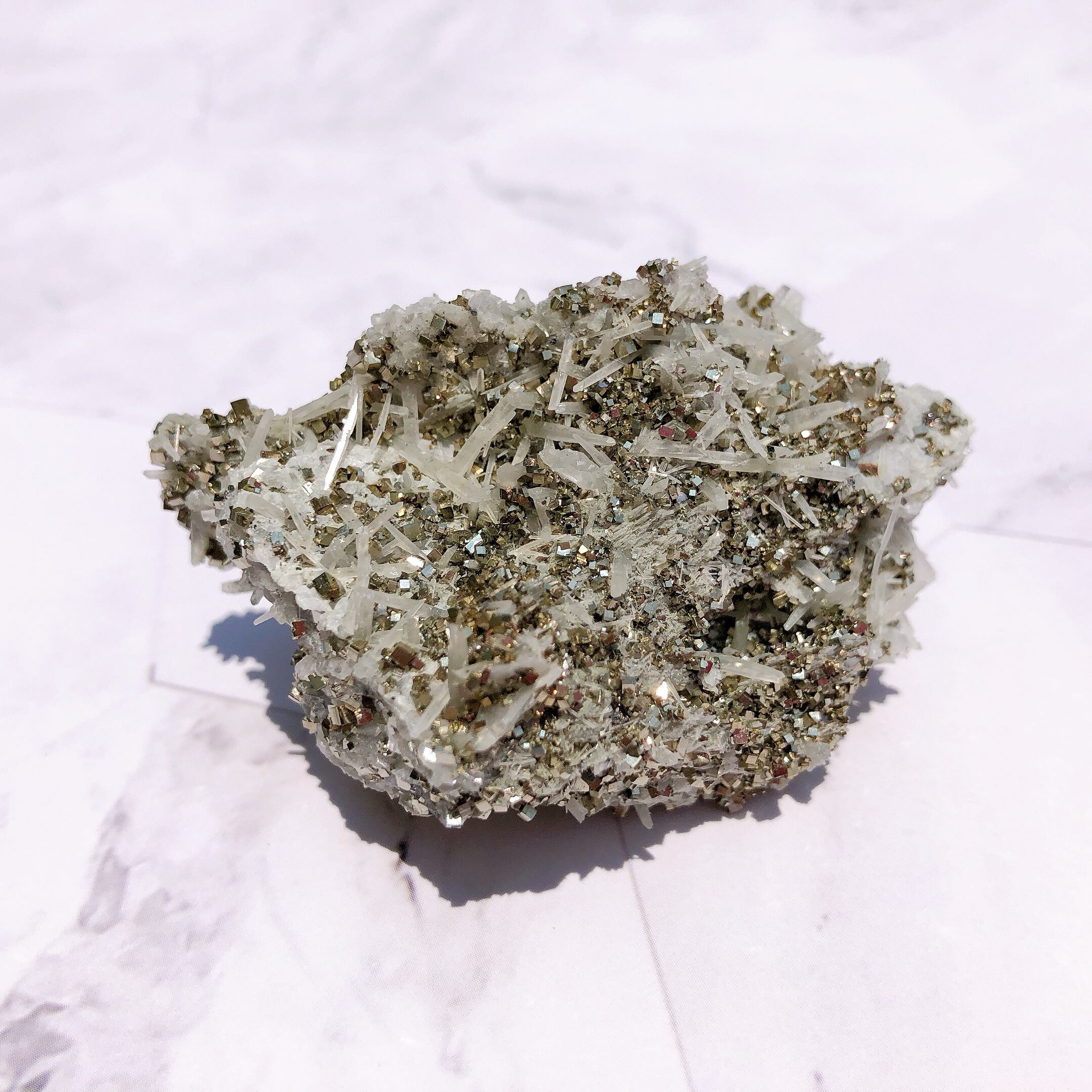 ✺ わずかな摩擦でもパイライトの結晶がいくつか取れる場合がございます。(立方体のパイライトの結晶がそのまま乗っかるように形成されているため) 配送の際、細心の注意を払ってお包み致しますが、それでも結晶が取れることがあります。また、触れる際はそっと手に取ってあげてください。