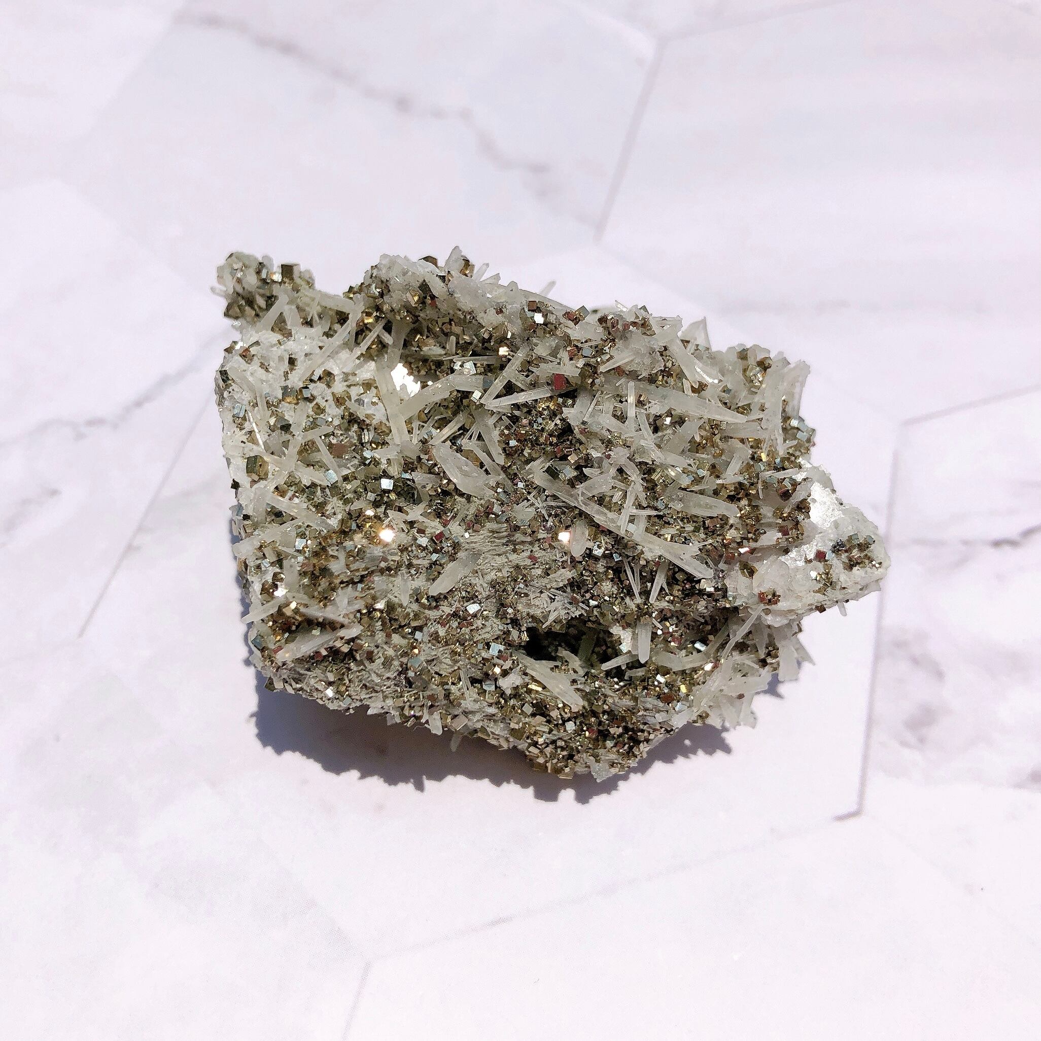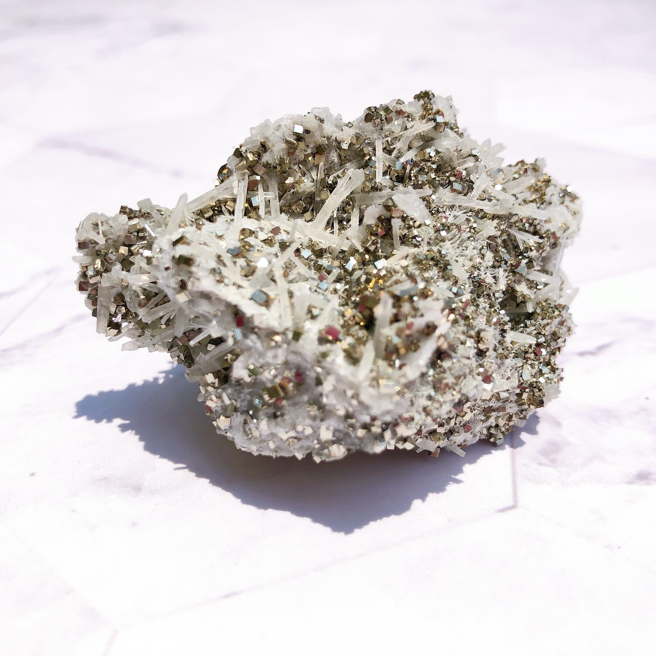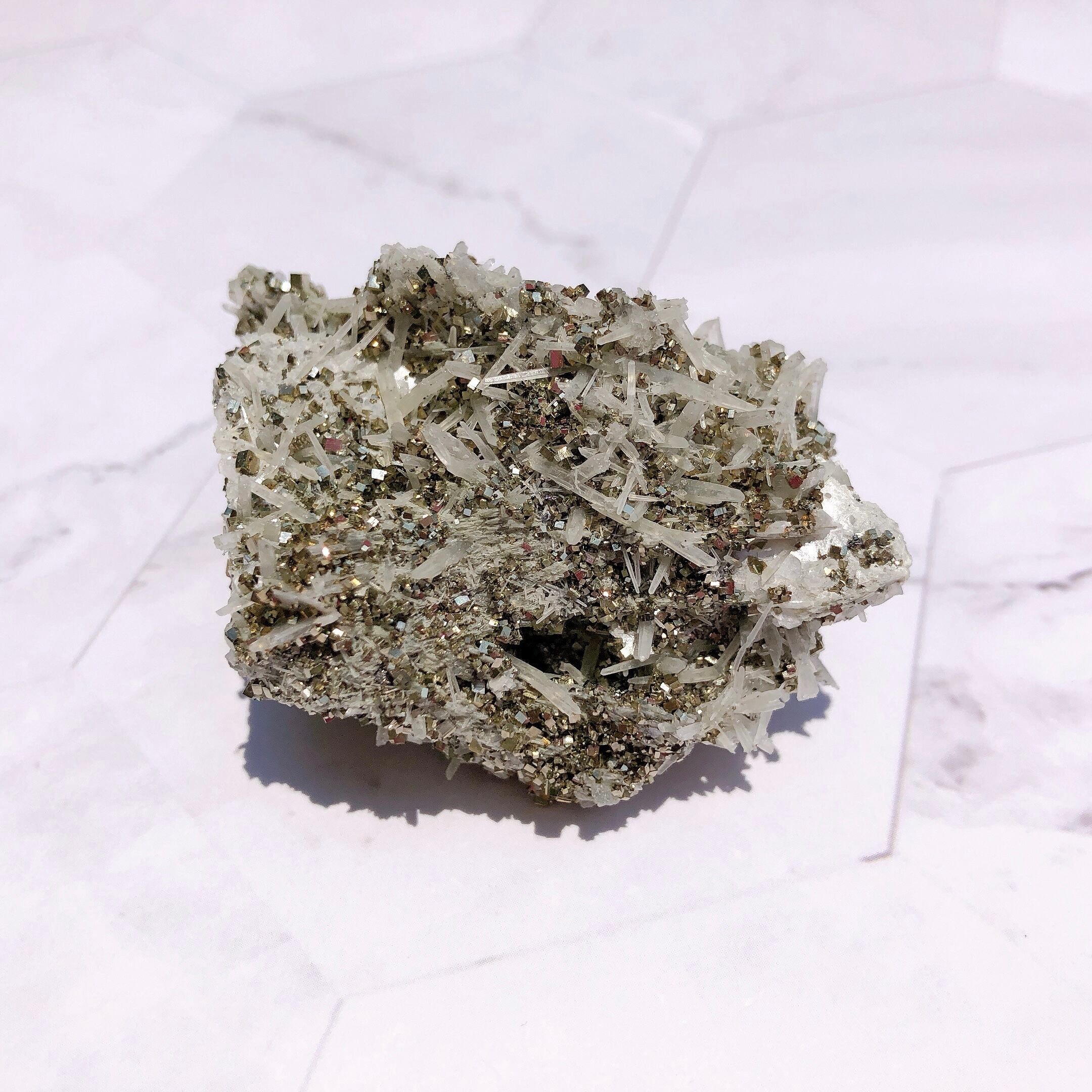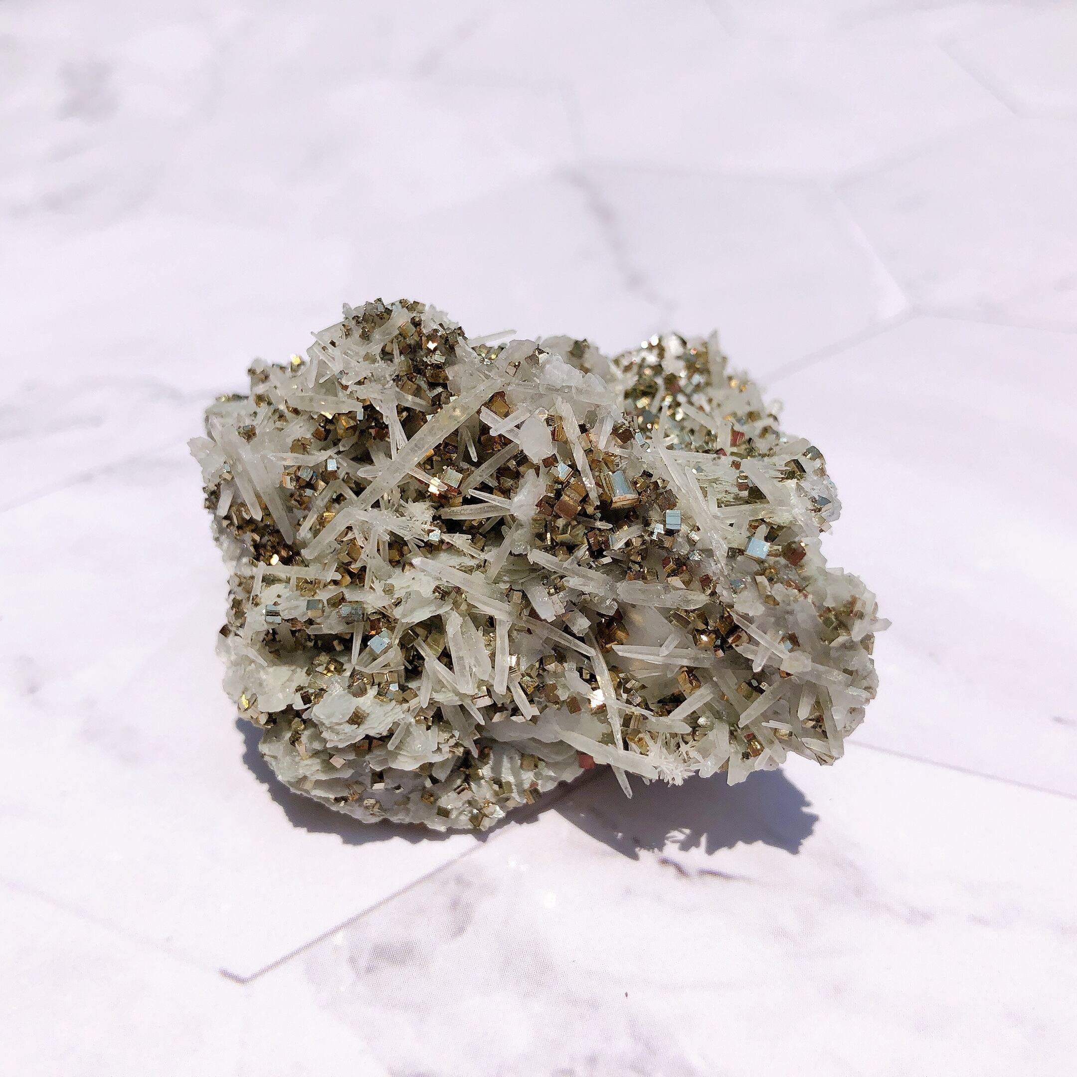 ✺ わずかな摩擦でもパイライトの結晶がいくつか取れる場合がございます。(立方体のパイライトの結晶がそのまま乗っかるように形成されているため) 配送の際、細心の注意を払ってお包み致しますが、それでも結晶が取れることがあります。また、触れる際はそっと手に取ってあげてください。