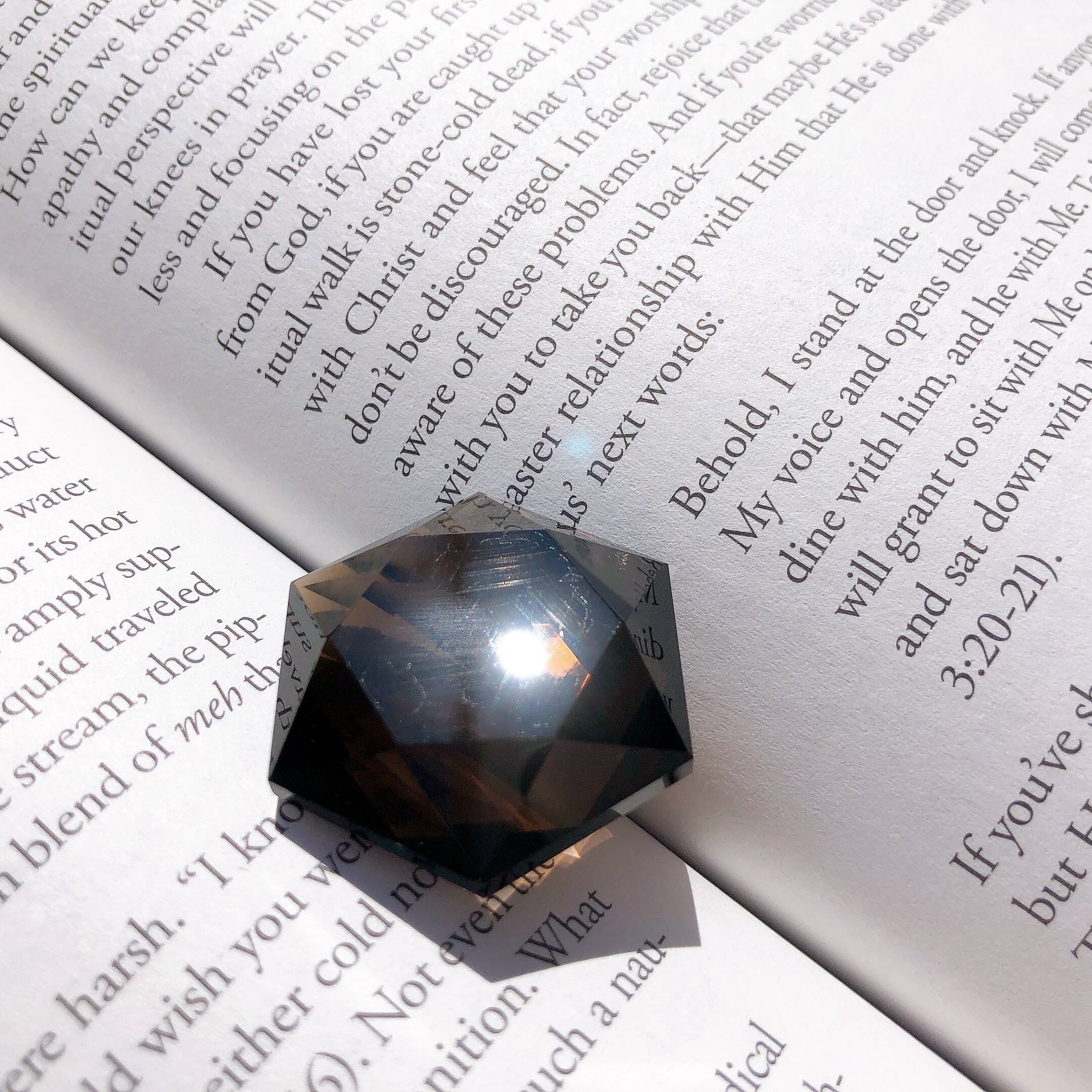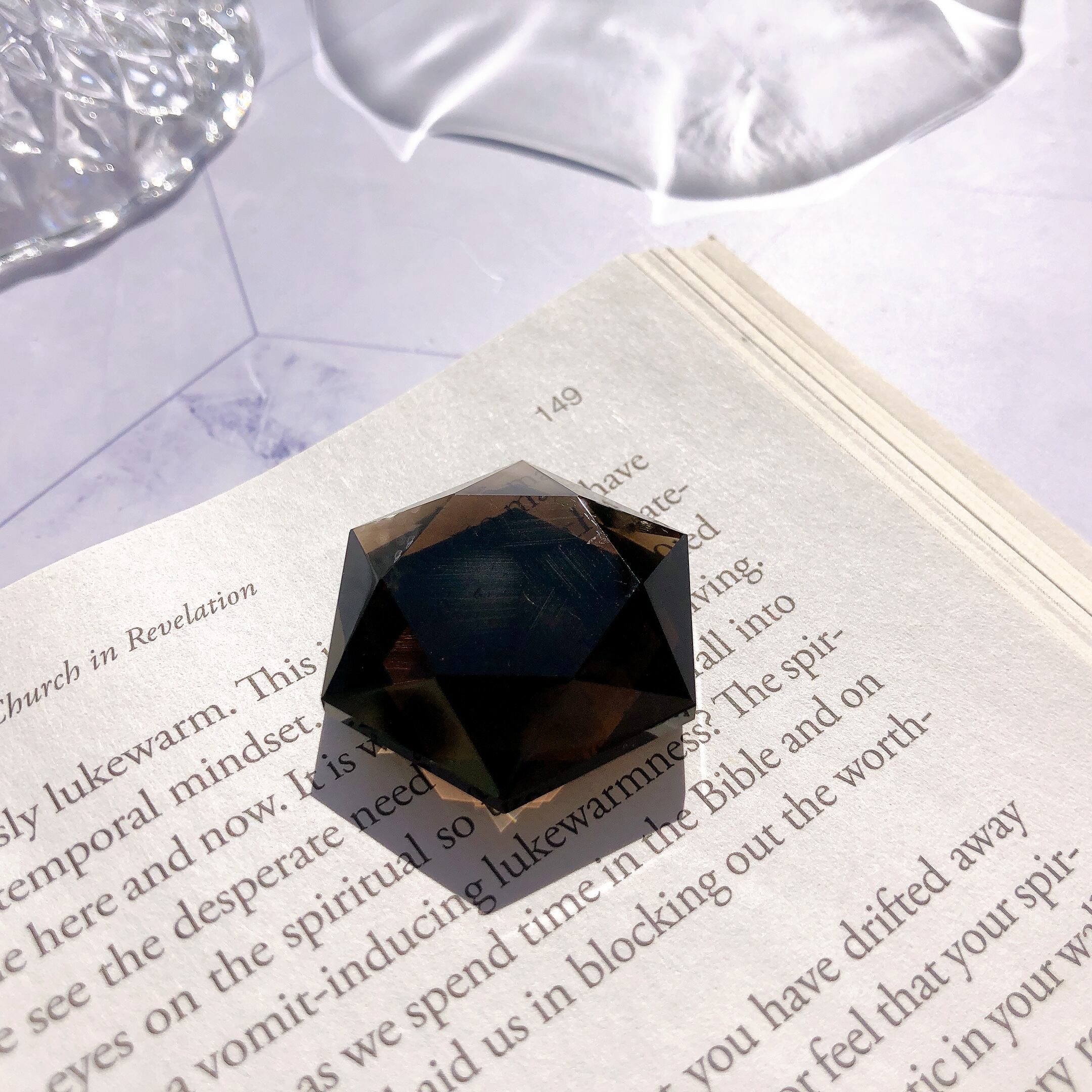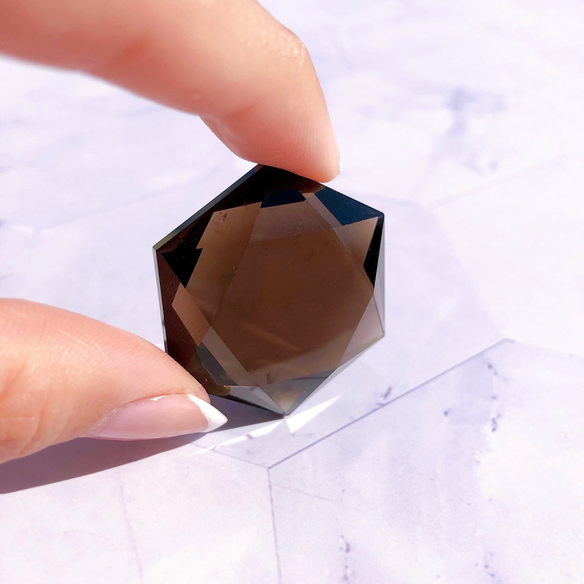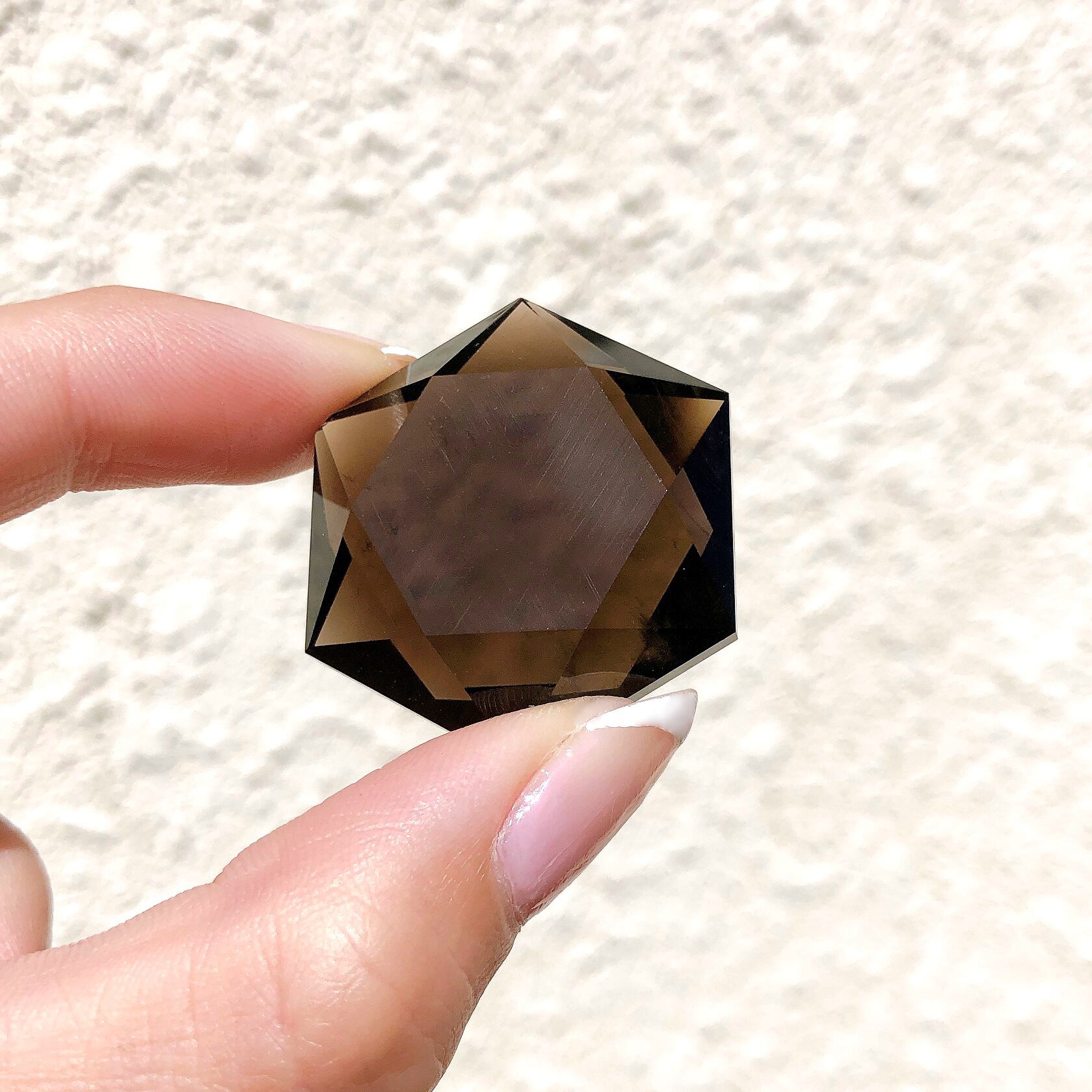 ダビデの星・ヘキサグラム型にジェムカットが施された、シックでクリアなスモーキークォーツ。