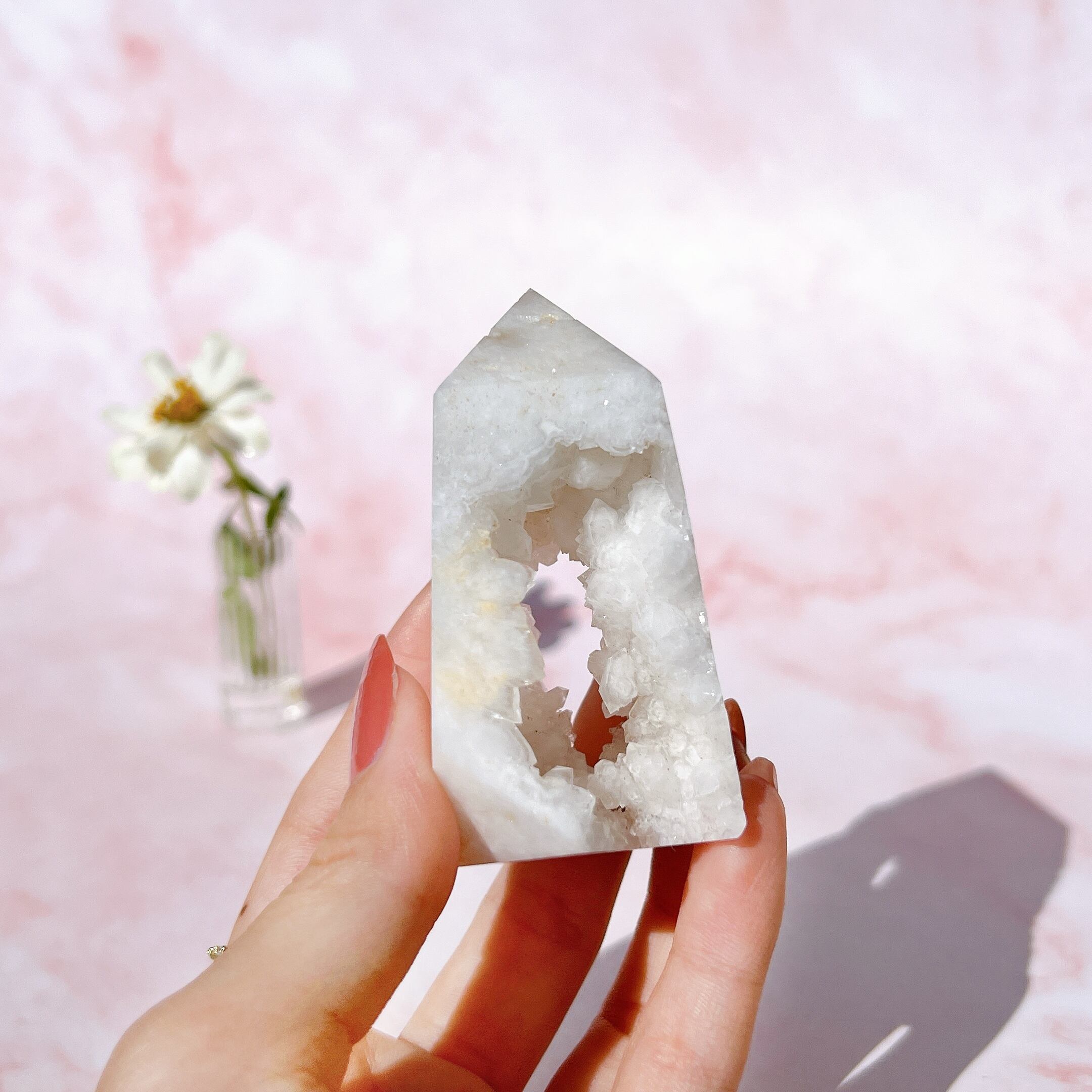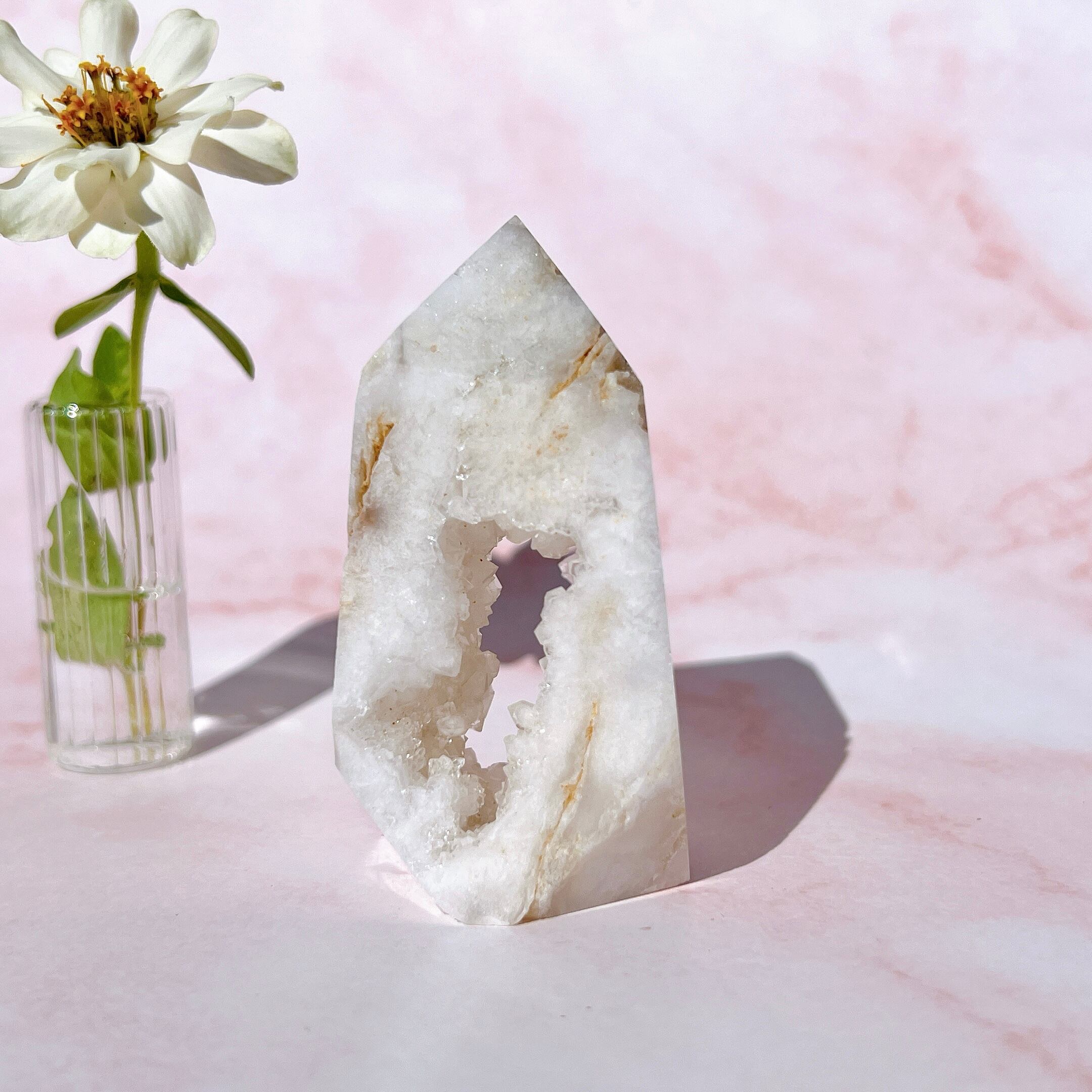 光を受けて眩く輝く、ブラジル産のドゥルージークォーツのタワー⊹