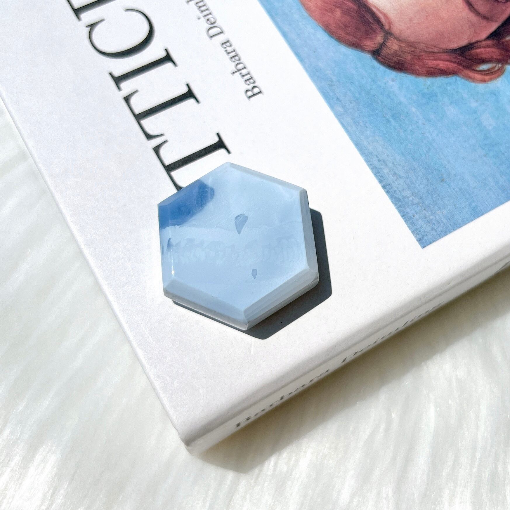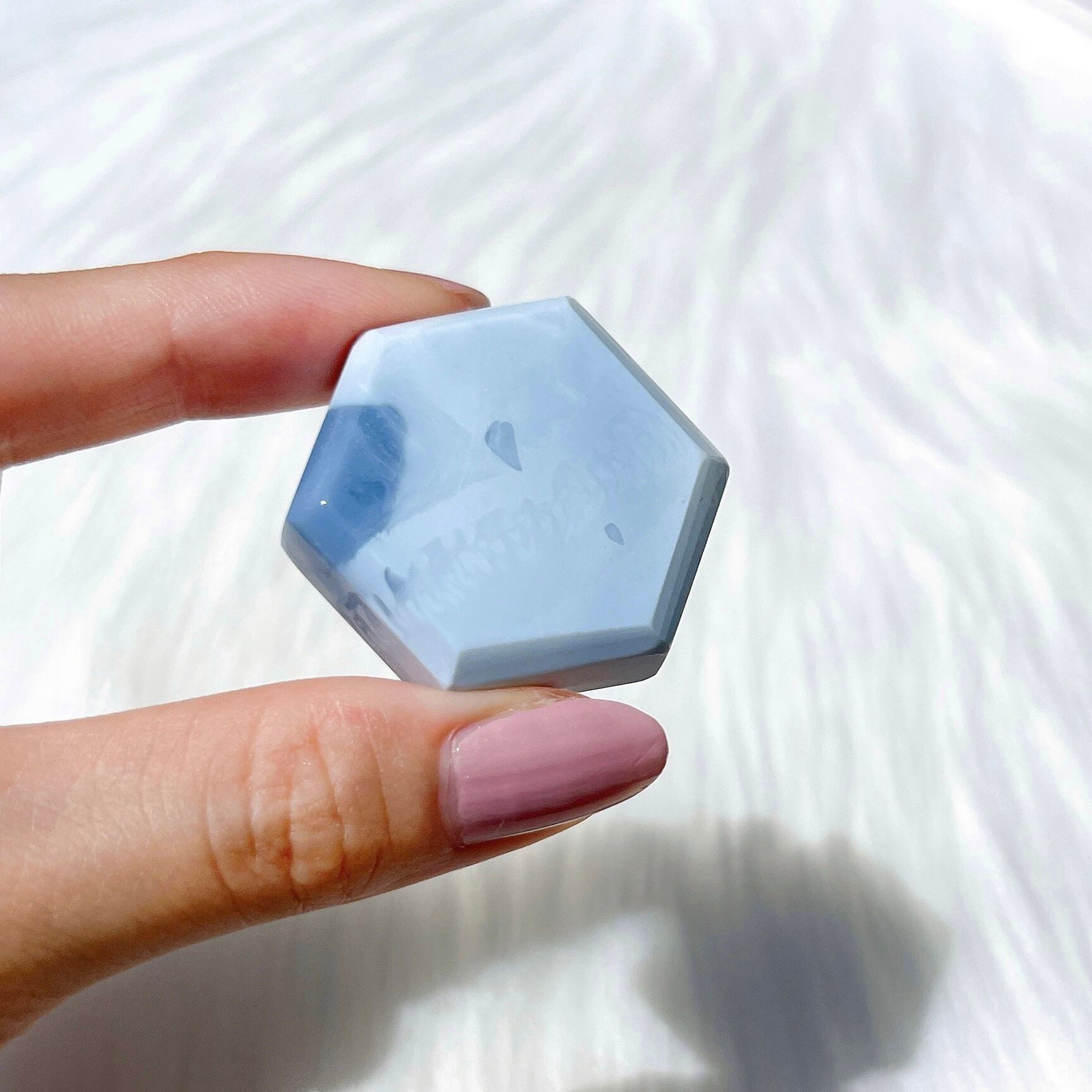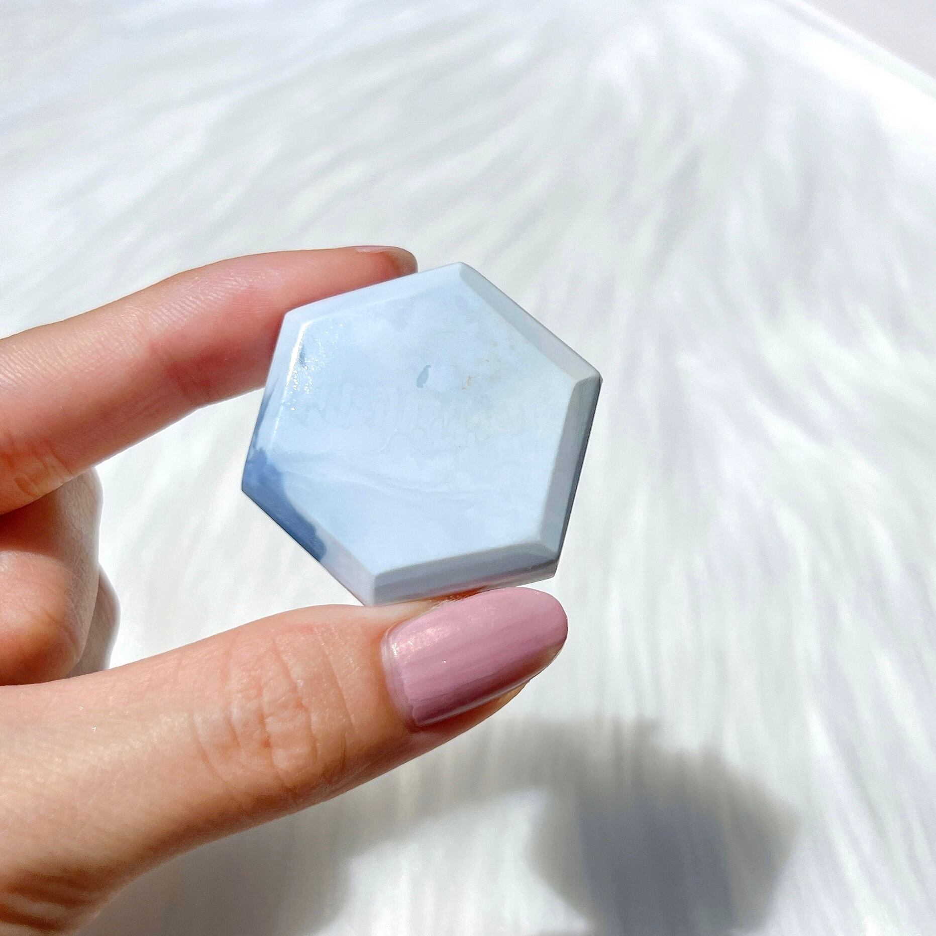 今回はくすみのない美しい発色のものをセレクトしています。5-10グラム程度のアクセサリー用ルースとして流通することの多い石ですが、こちらは厚みのあるヘキサゴン型にカットを施しています。研磨・加工はインドの工房でひとつひとつ手作業で行われているため、研磨の甘いところや傷等あるかもしれません。写真にてご確認いただけますと幸いです。