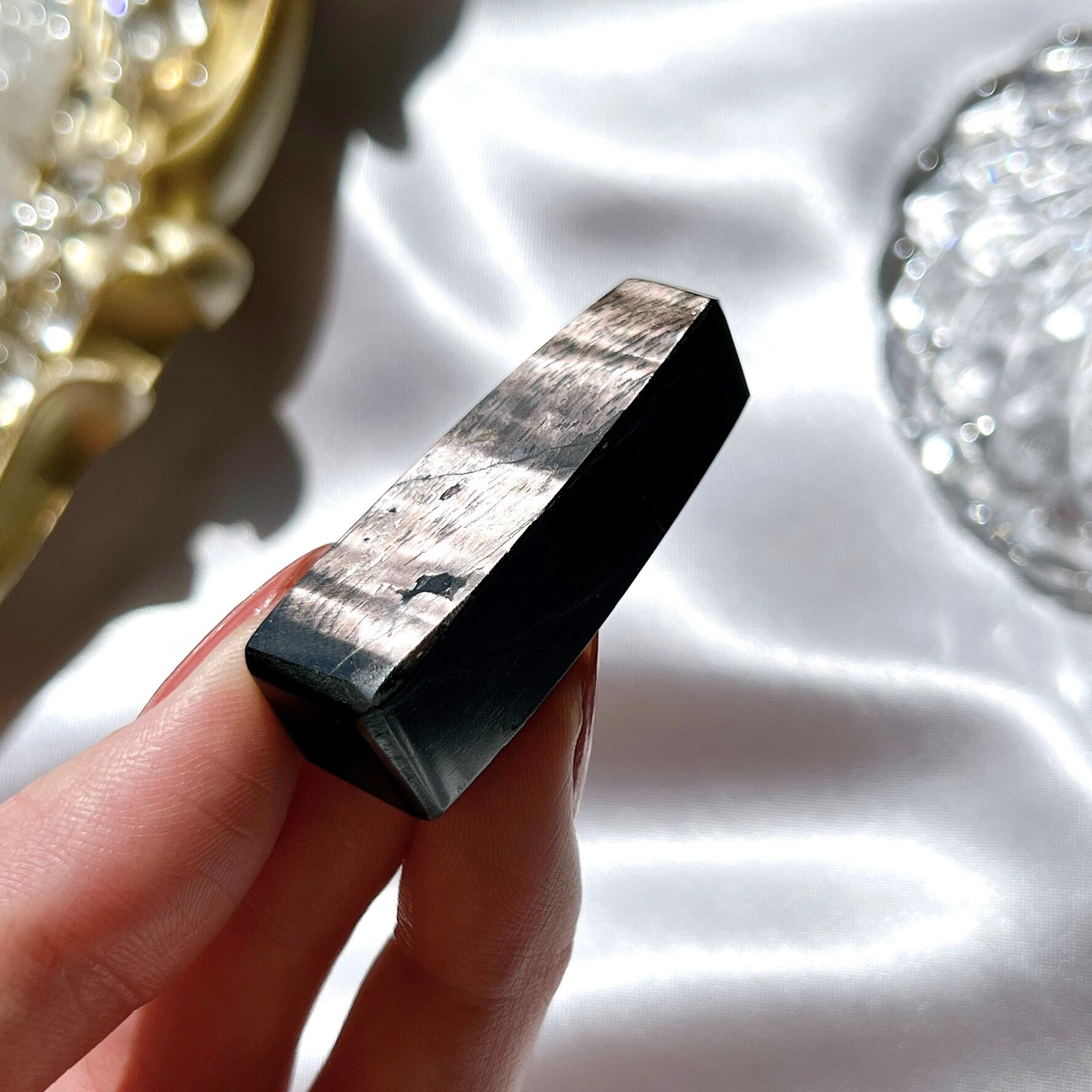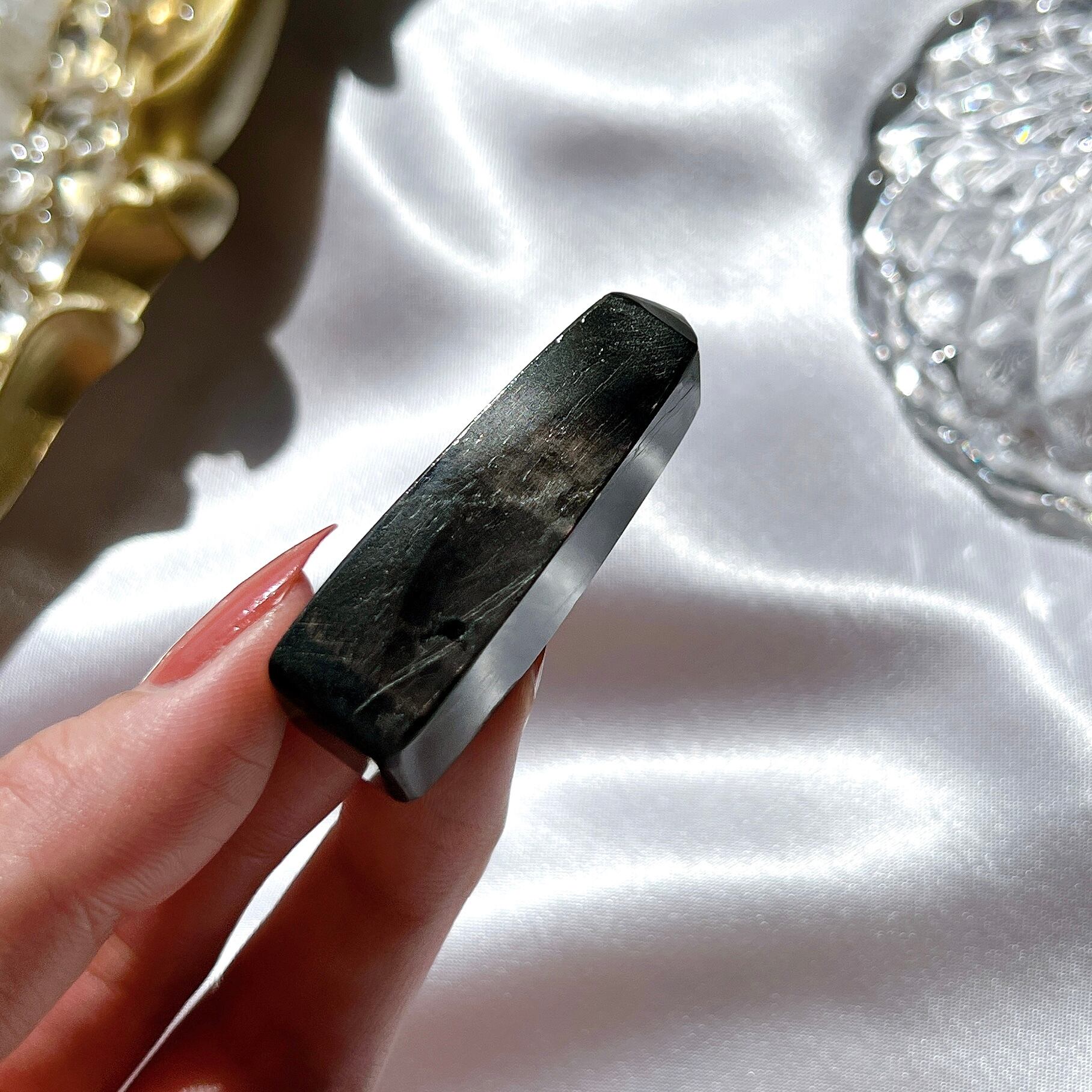 ギリシャ語で超越を意味する”hyper”と、強さを意味する”sthenos”が由来のハイパーシーン。黒地にシルバーの輝きが見事で、パワフルな印象を与える石です。