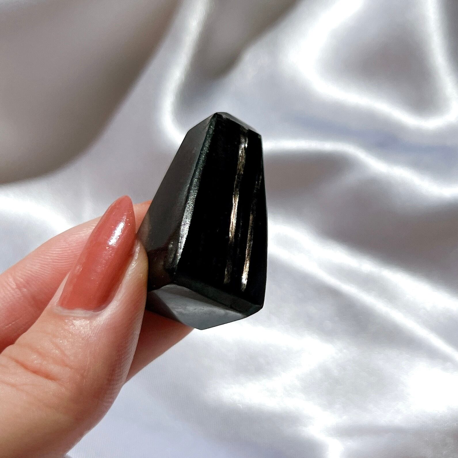 ギリシャ語で超越を意味する”hyper”と、強さを意味する”sthenos”が由来のハイパーシーン。黒地にシルバーの輝きが見事で、パワフルな印象を与える石です。