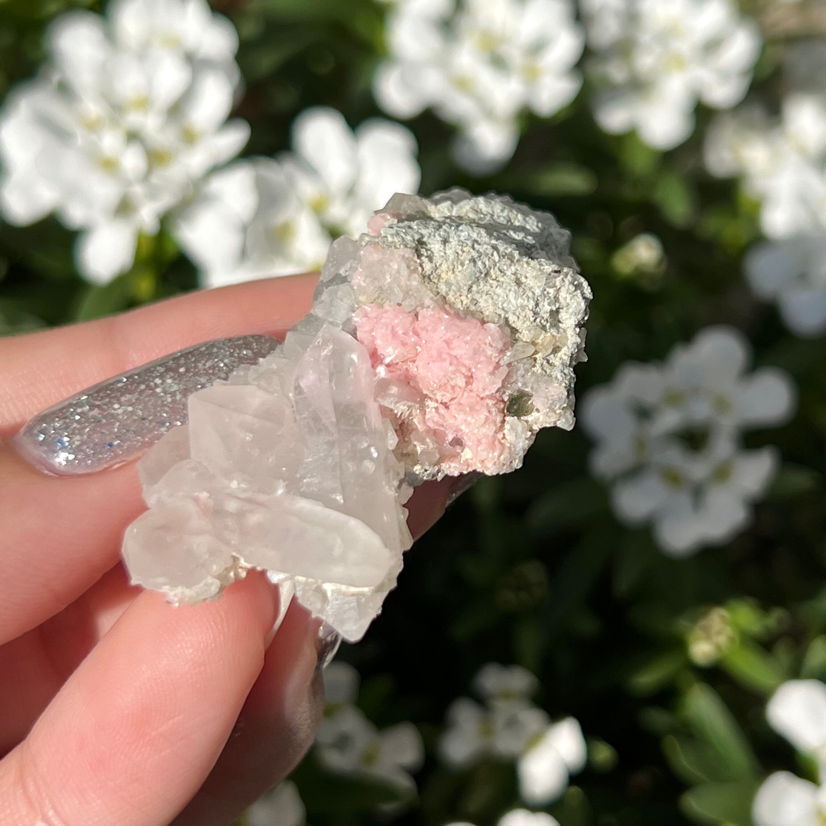 ロードクロサイト×水晶の共生原石をご紹介いたします。
