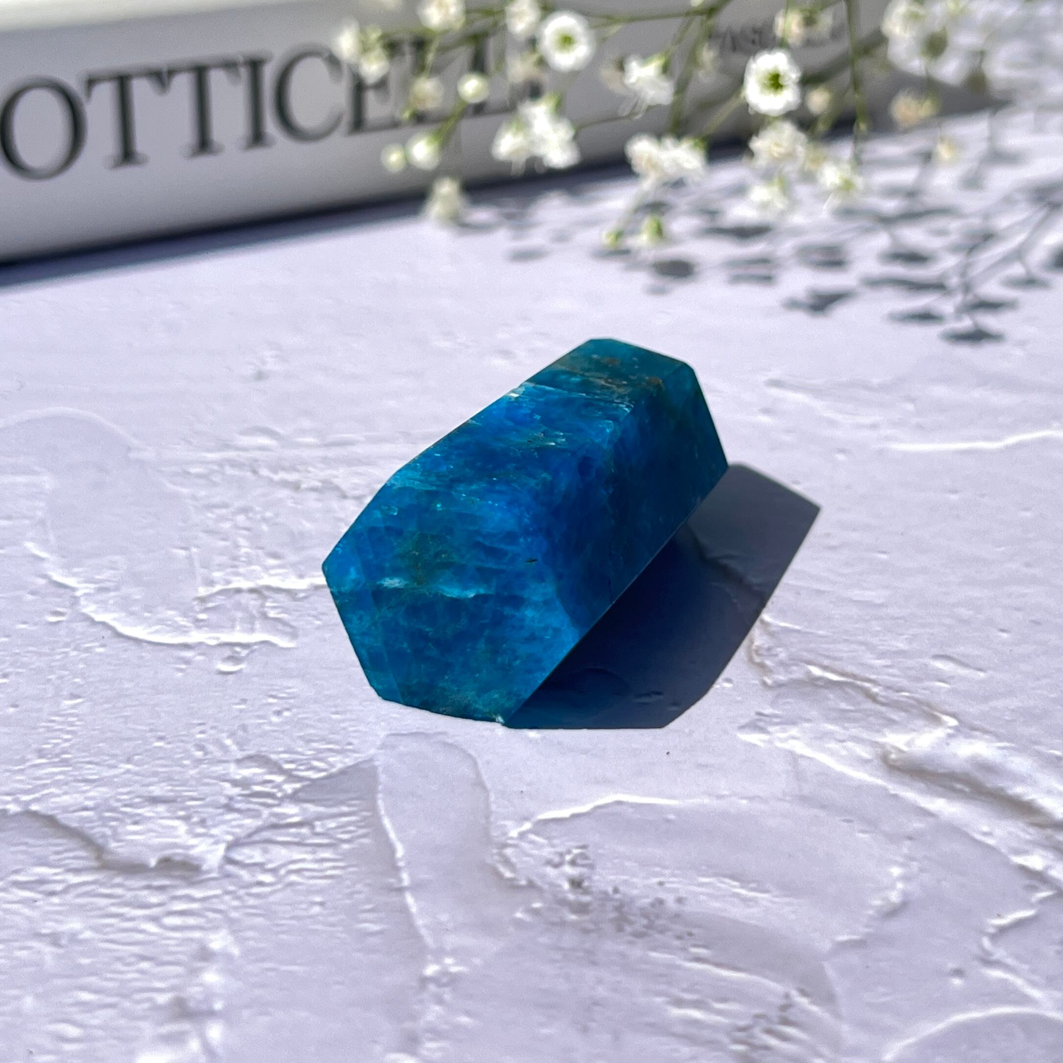 マダガスカルは宝石質のネオンブルーアパタイトが採れる世界有数の産地ですが、今回ご紹介するものもネオンブルーと呼びたくなるほどに目の覚めるような鮮やかな色合いをしています。瑞々しい透け感があり、シラーが現れる面もあります✧