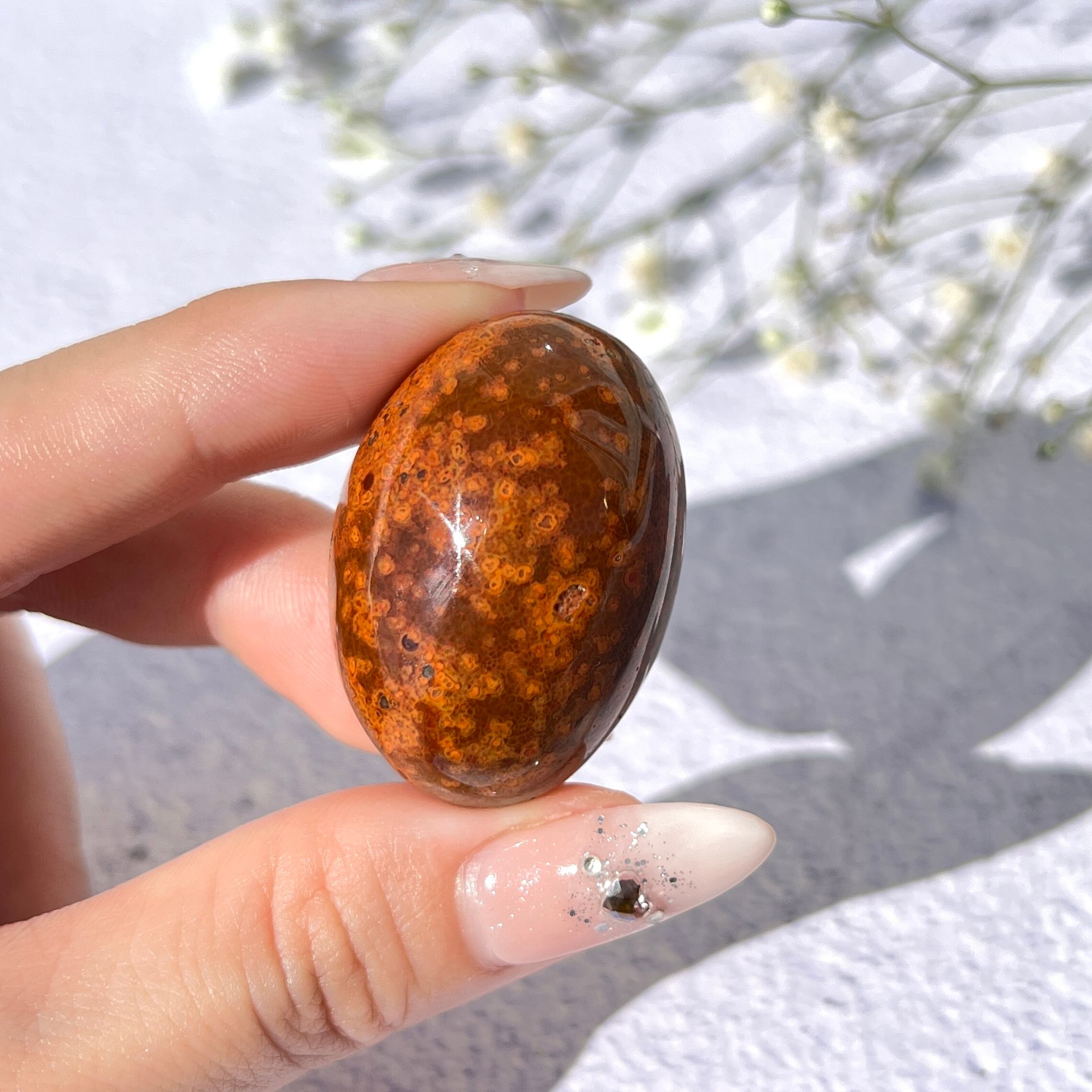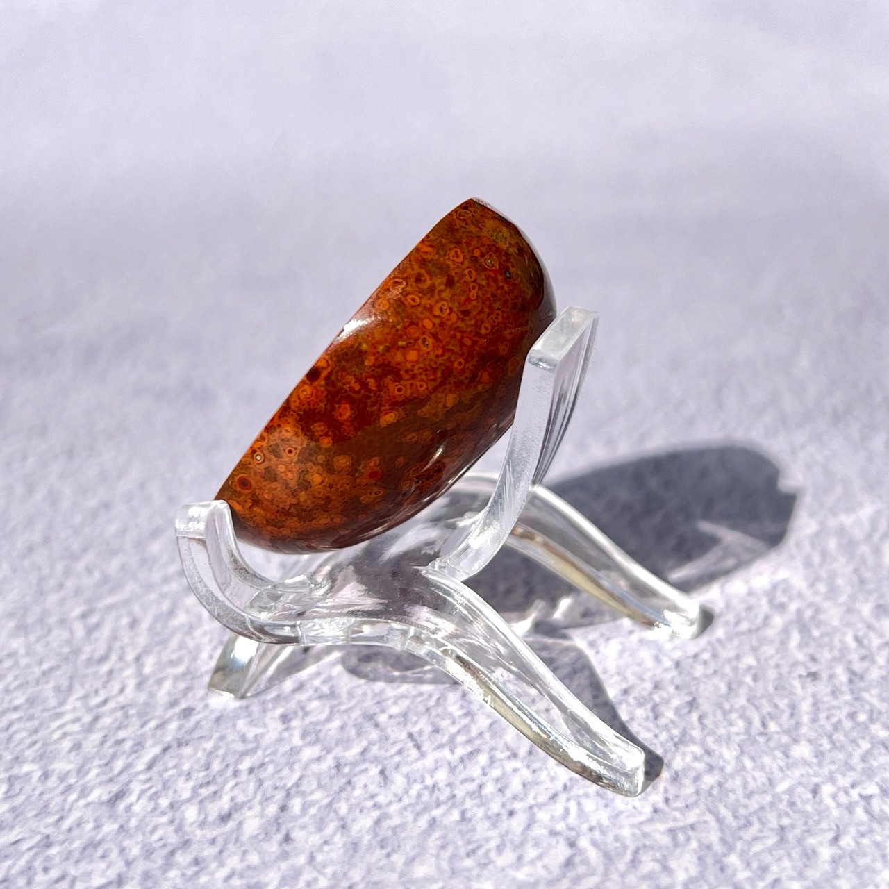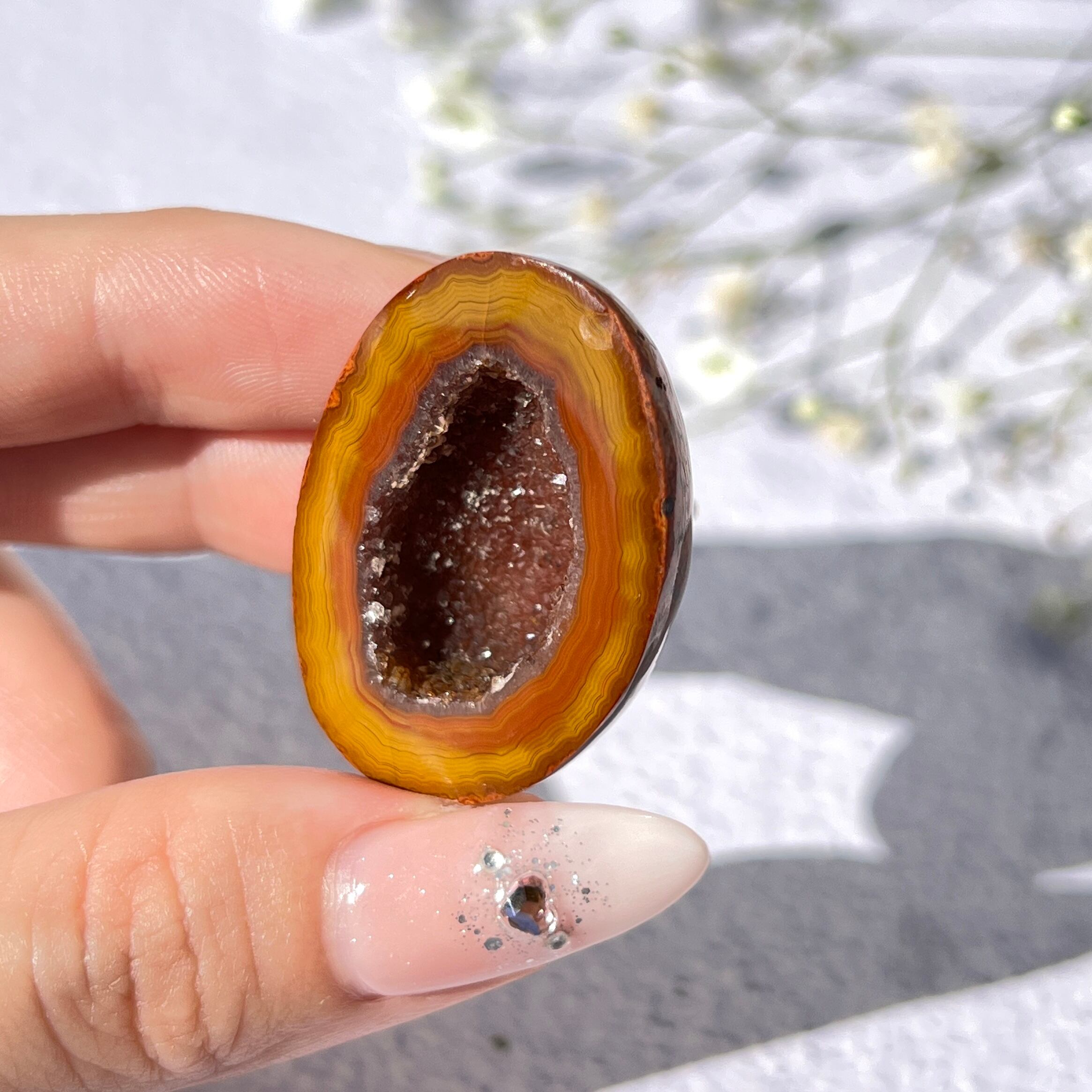 ジオード瑪瑙(アゲート)は通常グレーやブラウン、クリーム色などの無機質な色味がほとんどですが、こちらは赤色や朱色、黄色、紫色など、色彩豊かでユニークな模様をしています。