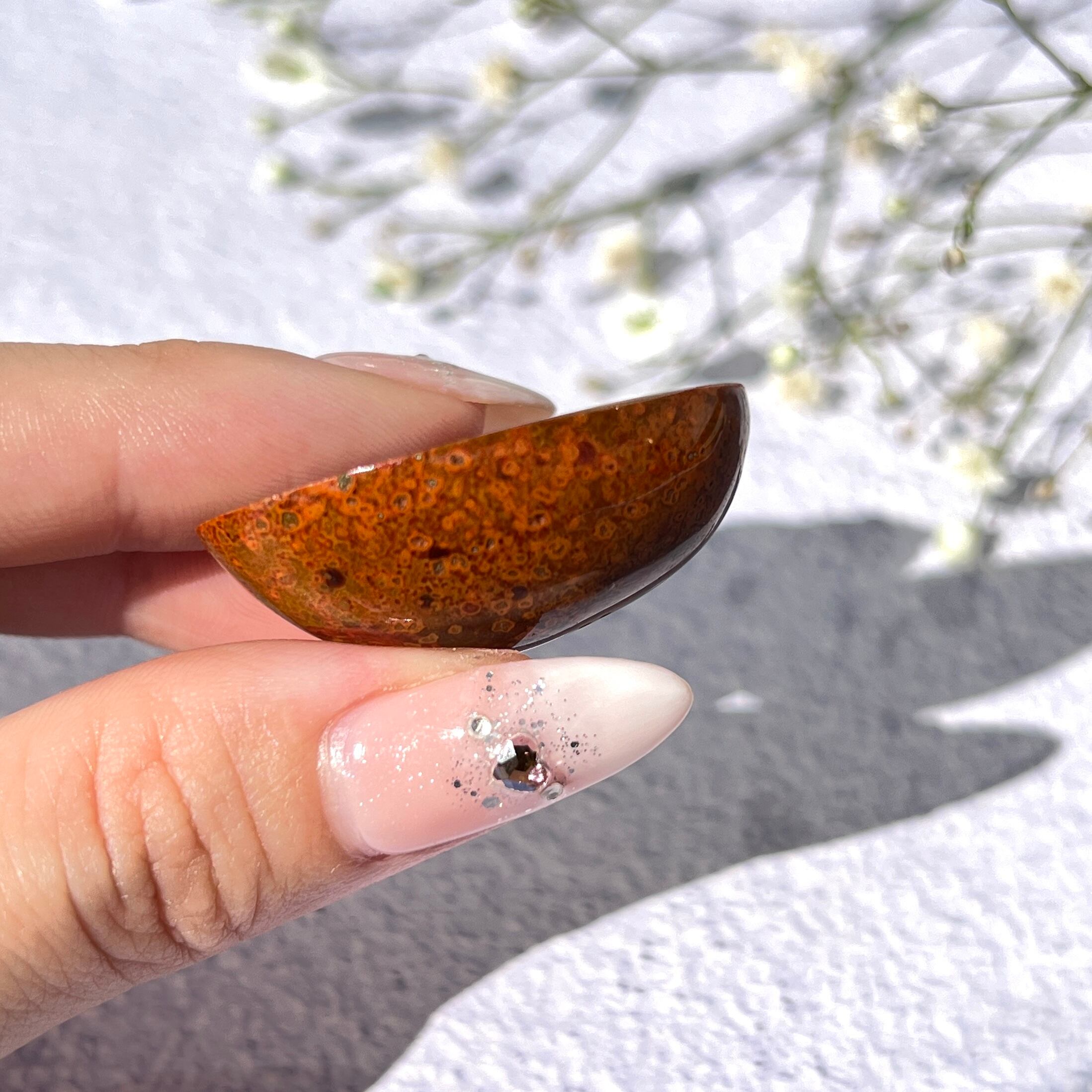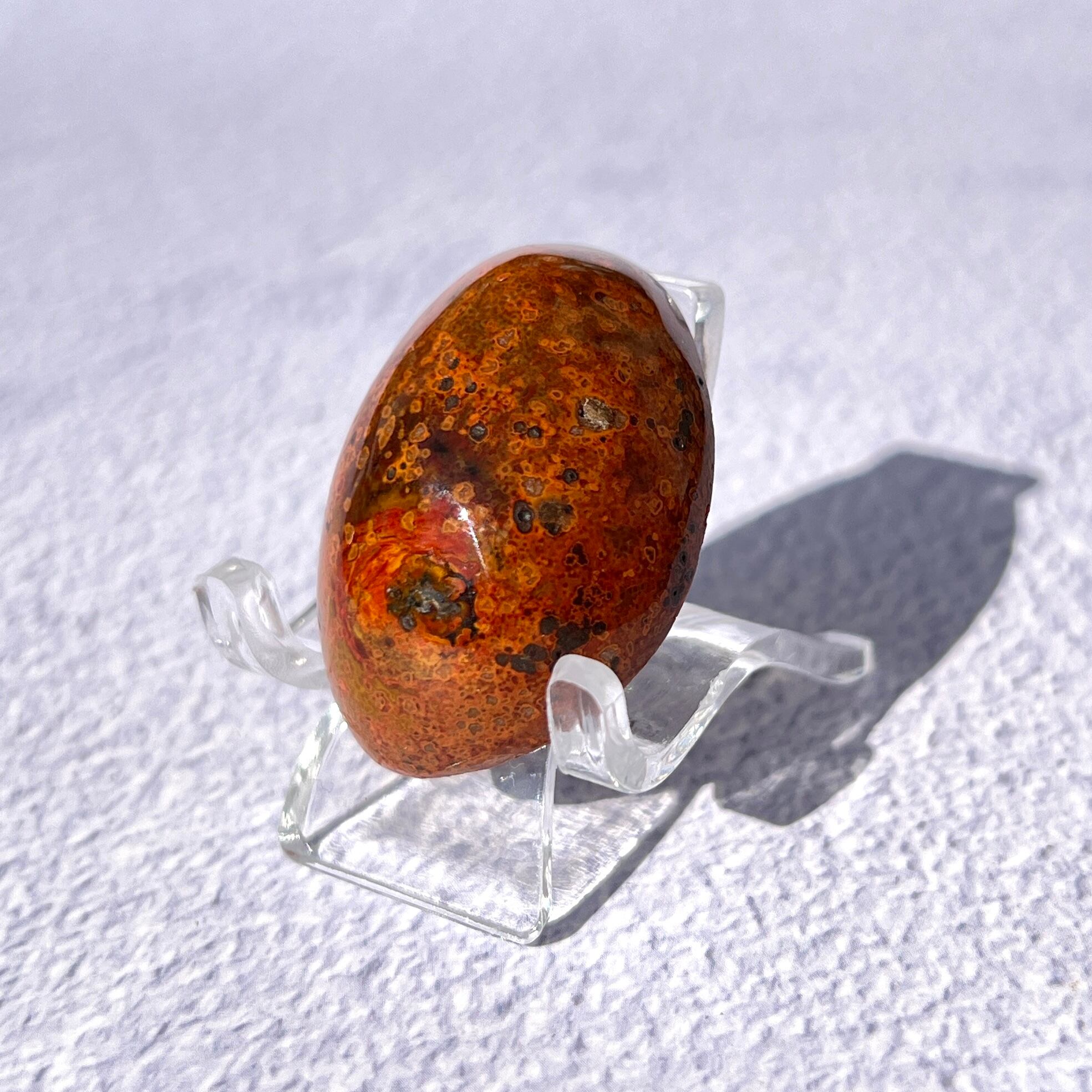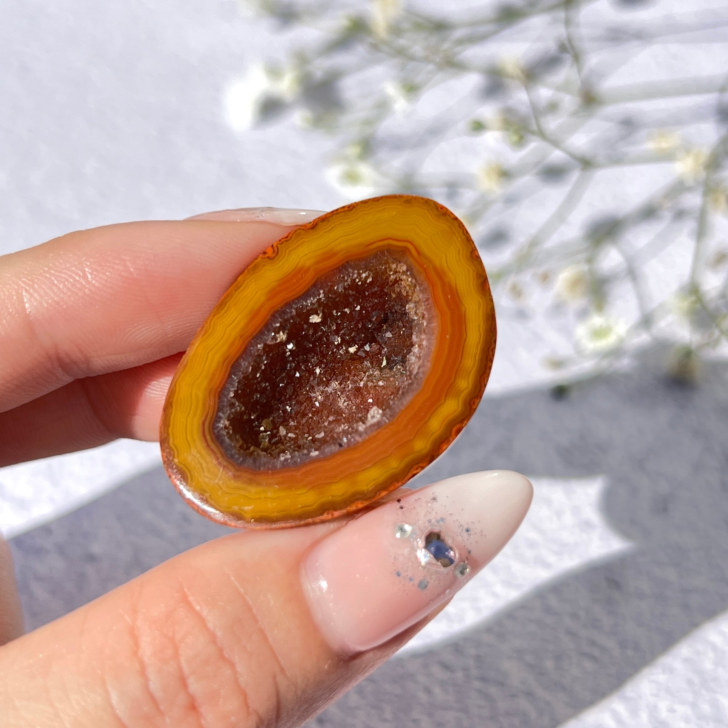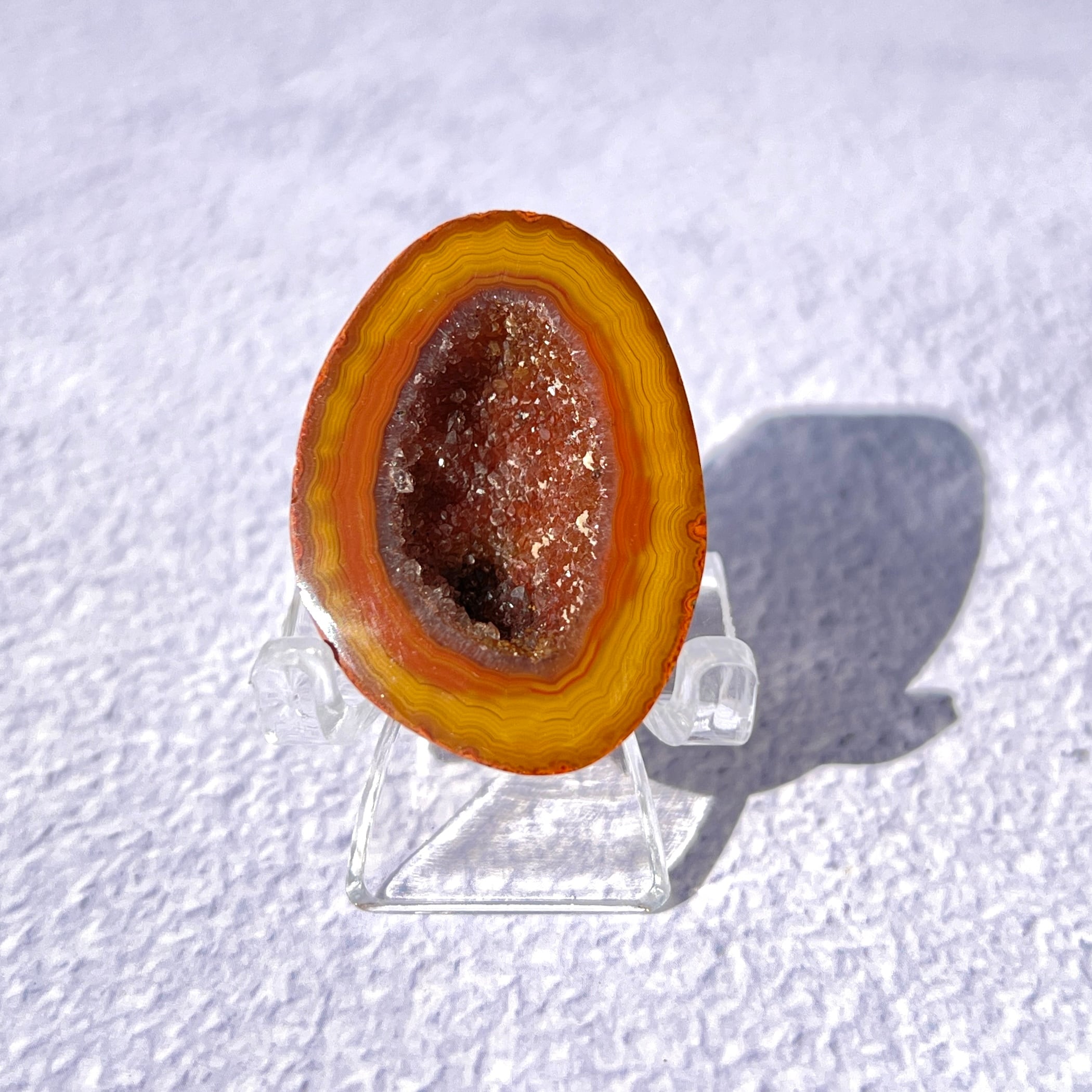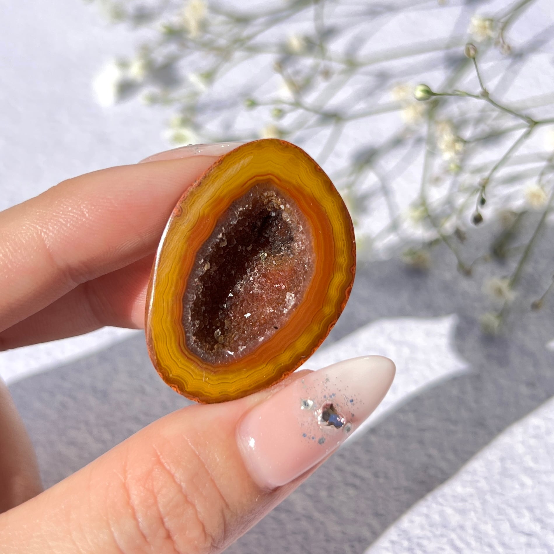 ジオード瑪瑙(アゲート)は通常グレーやブラウン、クリーム色などの無機質な色味がほとんどですが、こちらは赤色や朱色、黄色、紫色など、色彩豊かでユニークな模様をしています。