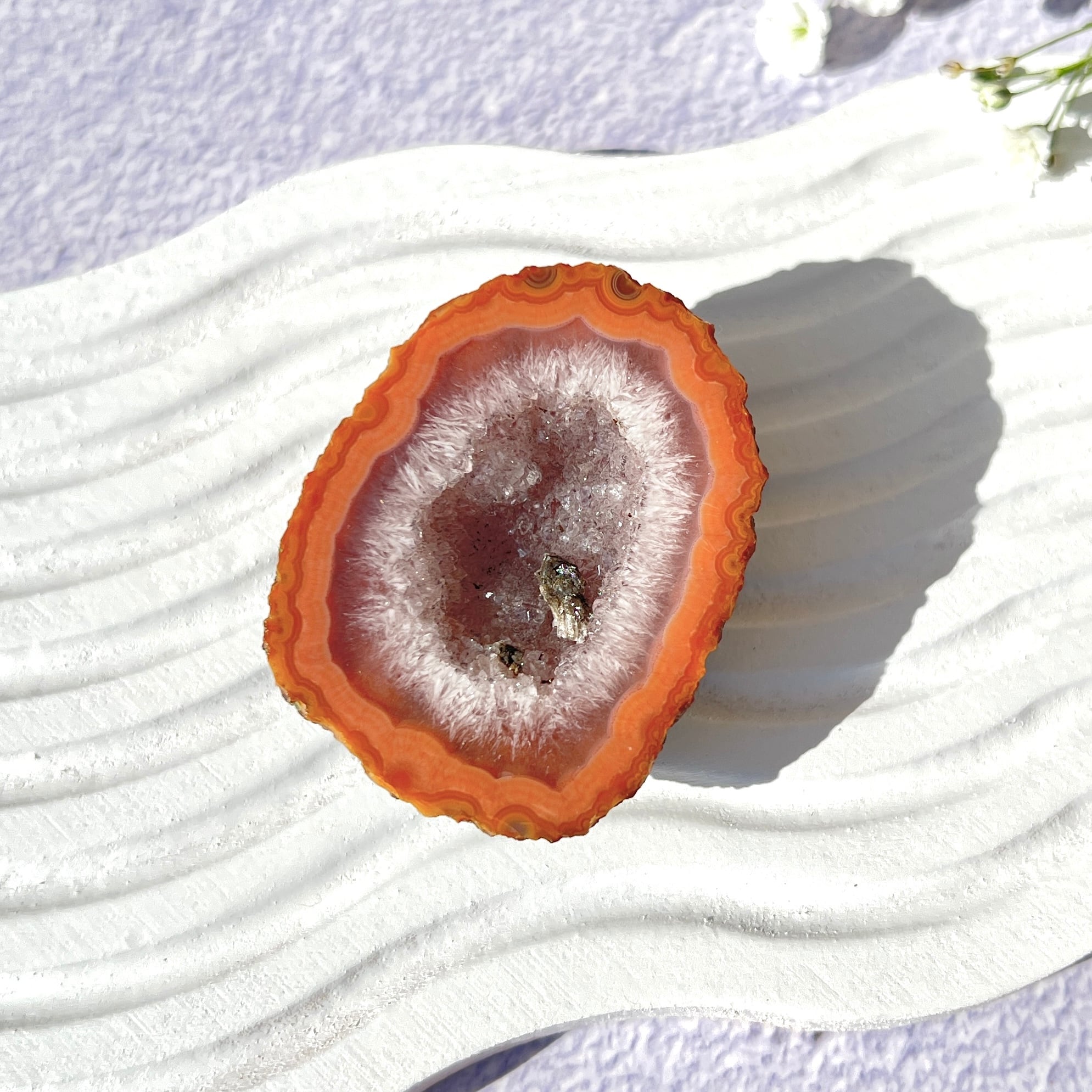 ジオード瑪瑙(アゲート)は通常グレーやブラウン、クリーム色などの無機質な色味がほとんどですが、こちらは赤色や朱色、黄色、紫色など、色彩豊かでユニークな模様をしています。