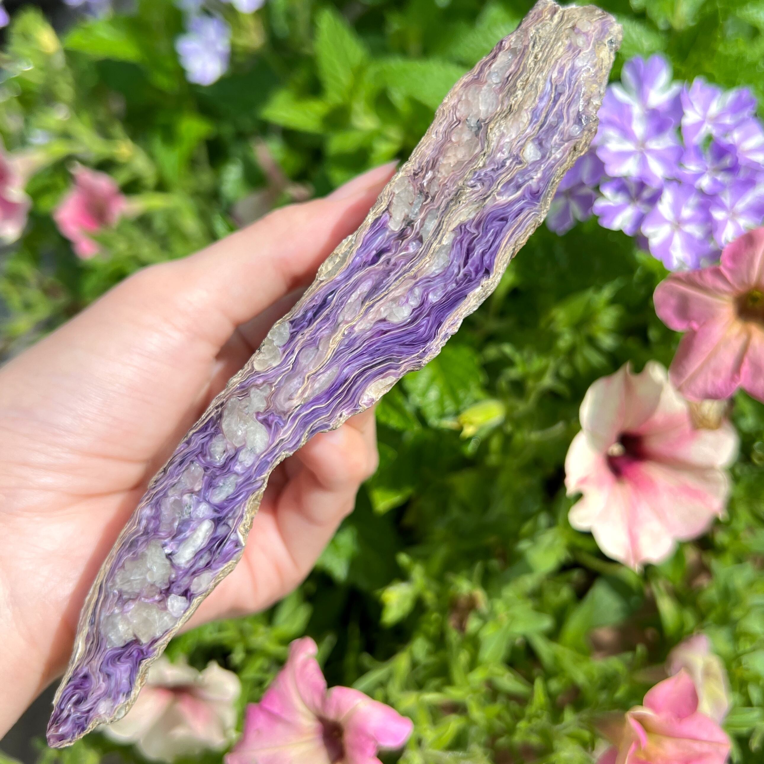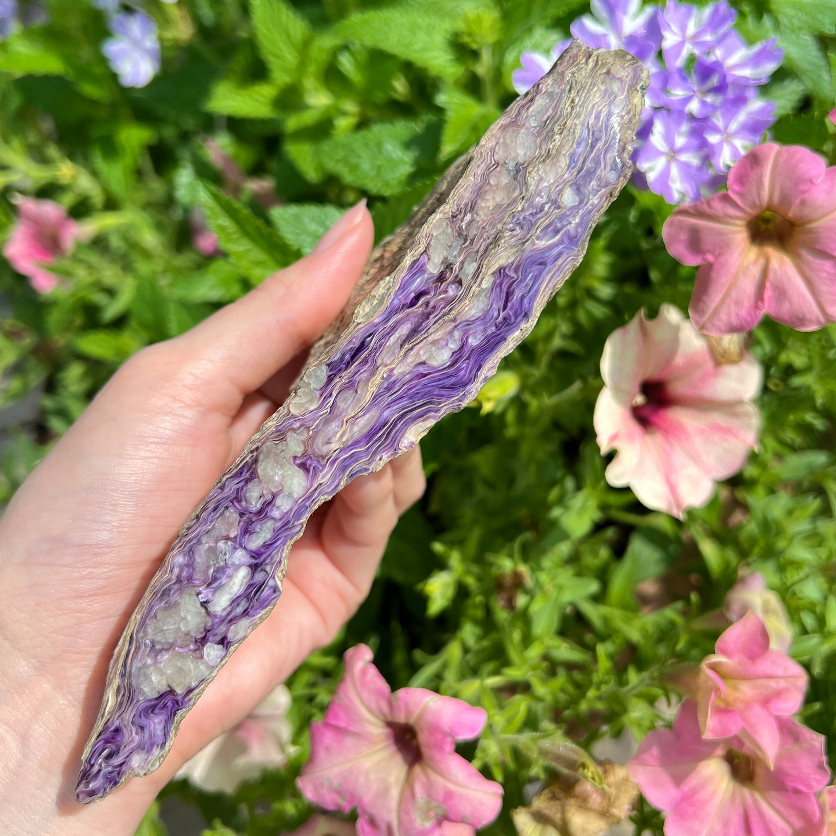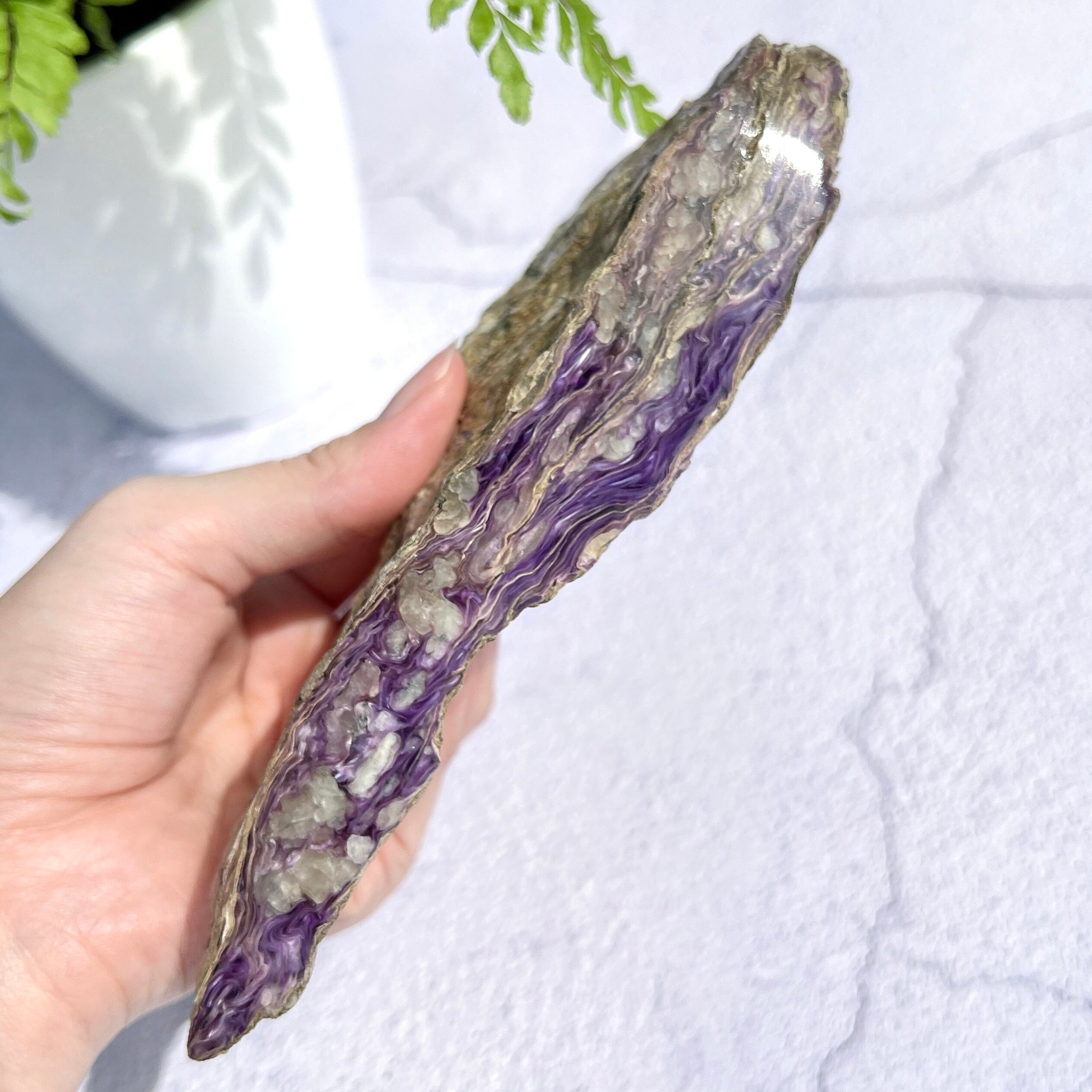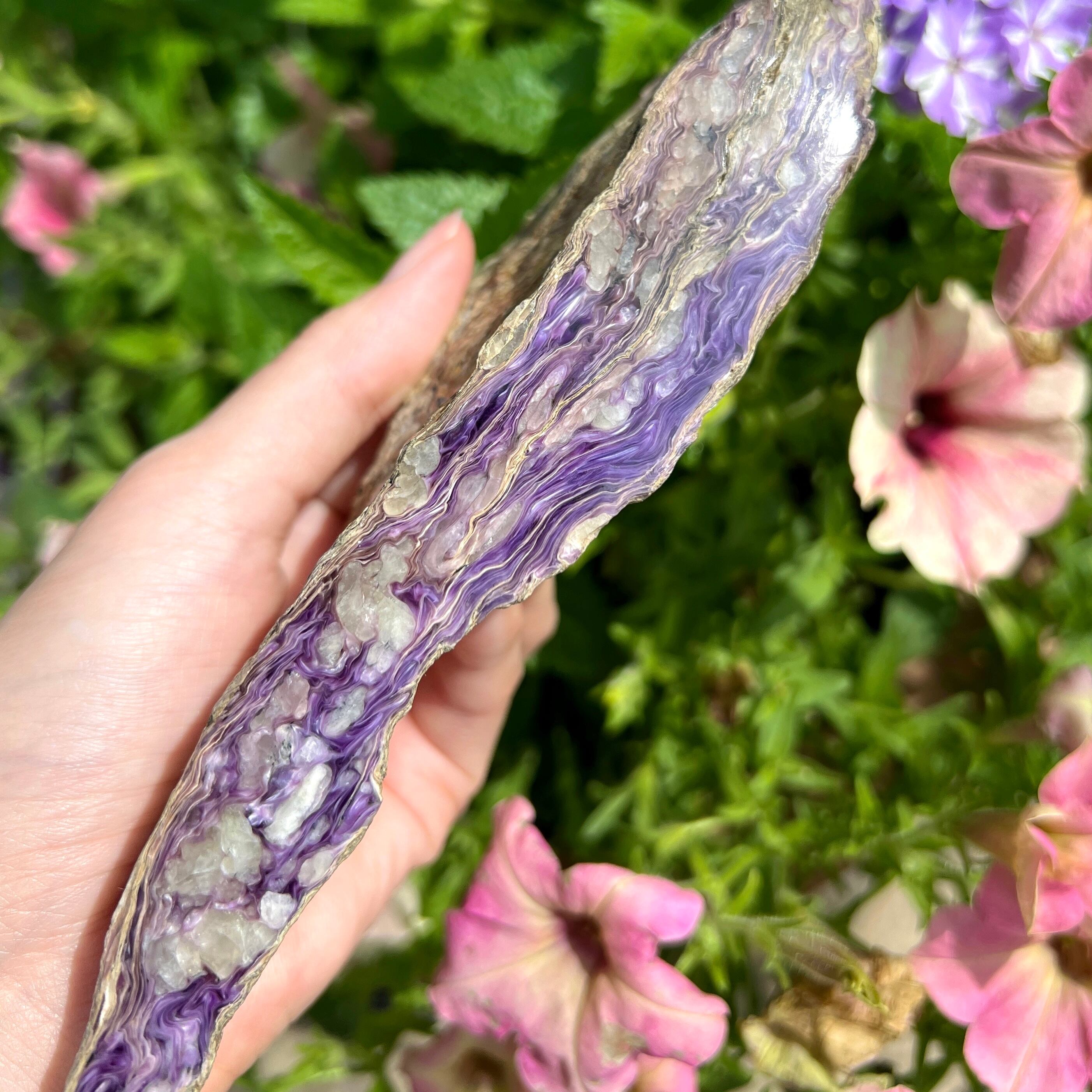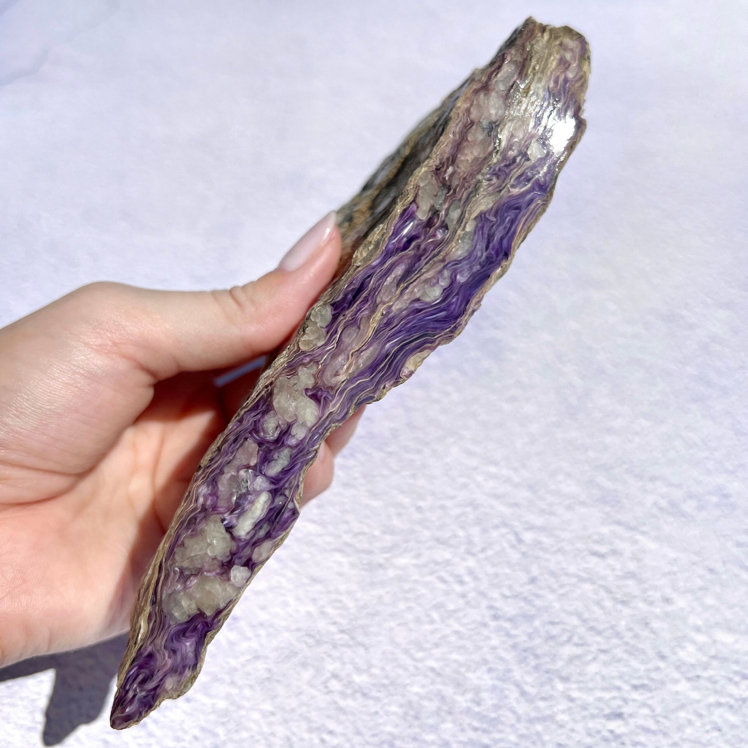 チャロアイトは基本的に巨大な岩状で採取されるので、原石と言っても人為的にカットしてあるものが流通します。