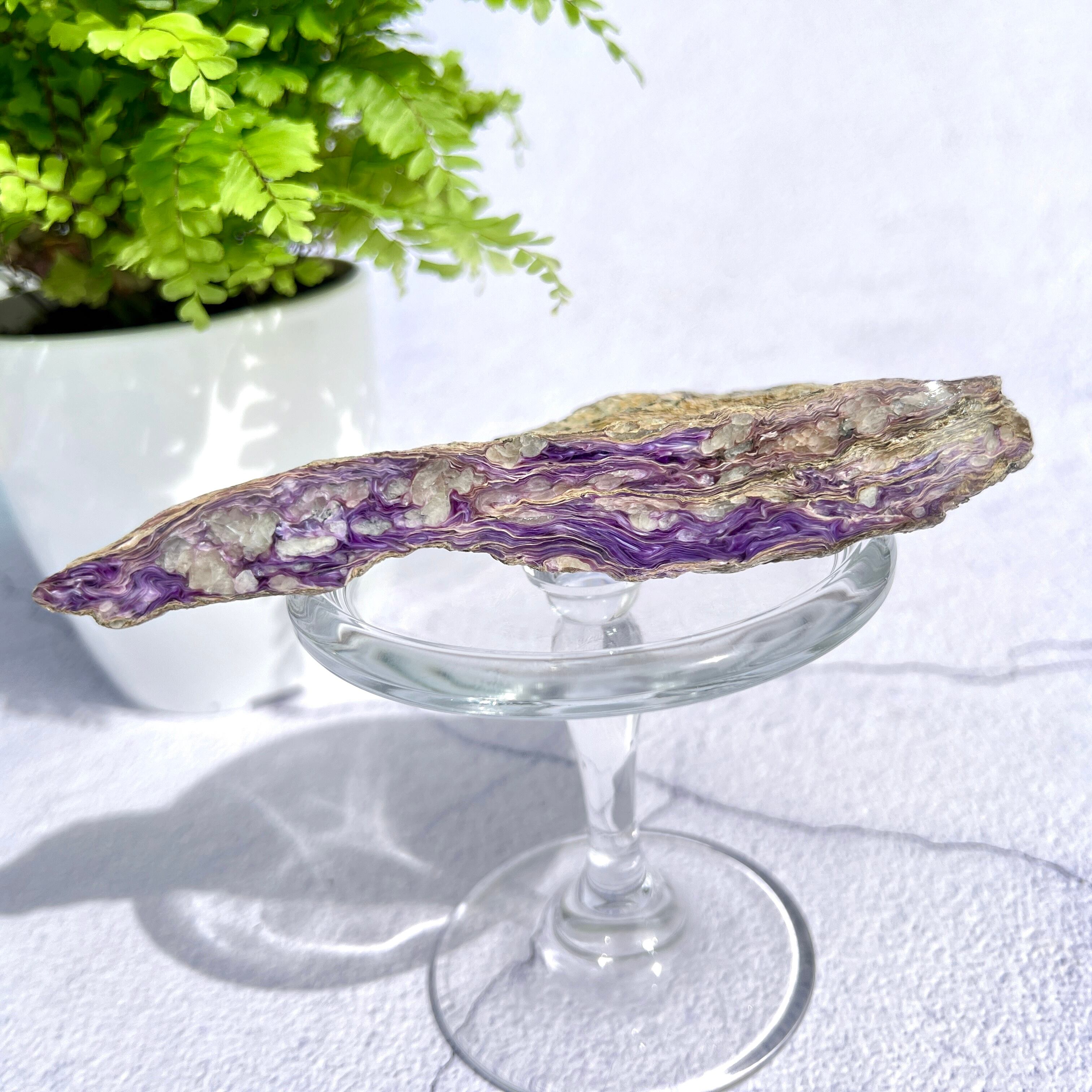 こちらの標本を見ていると、チャロアイトがミルフィーユのような繊維状構造の石であることがよく分かりますね。