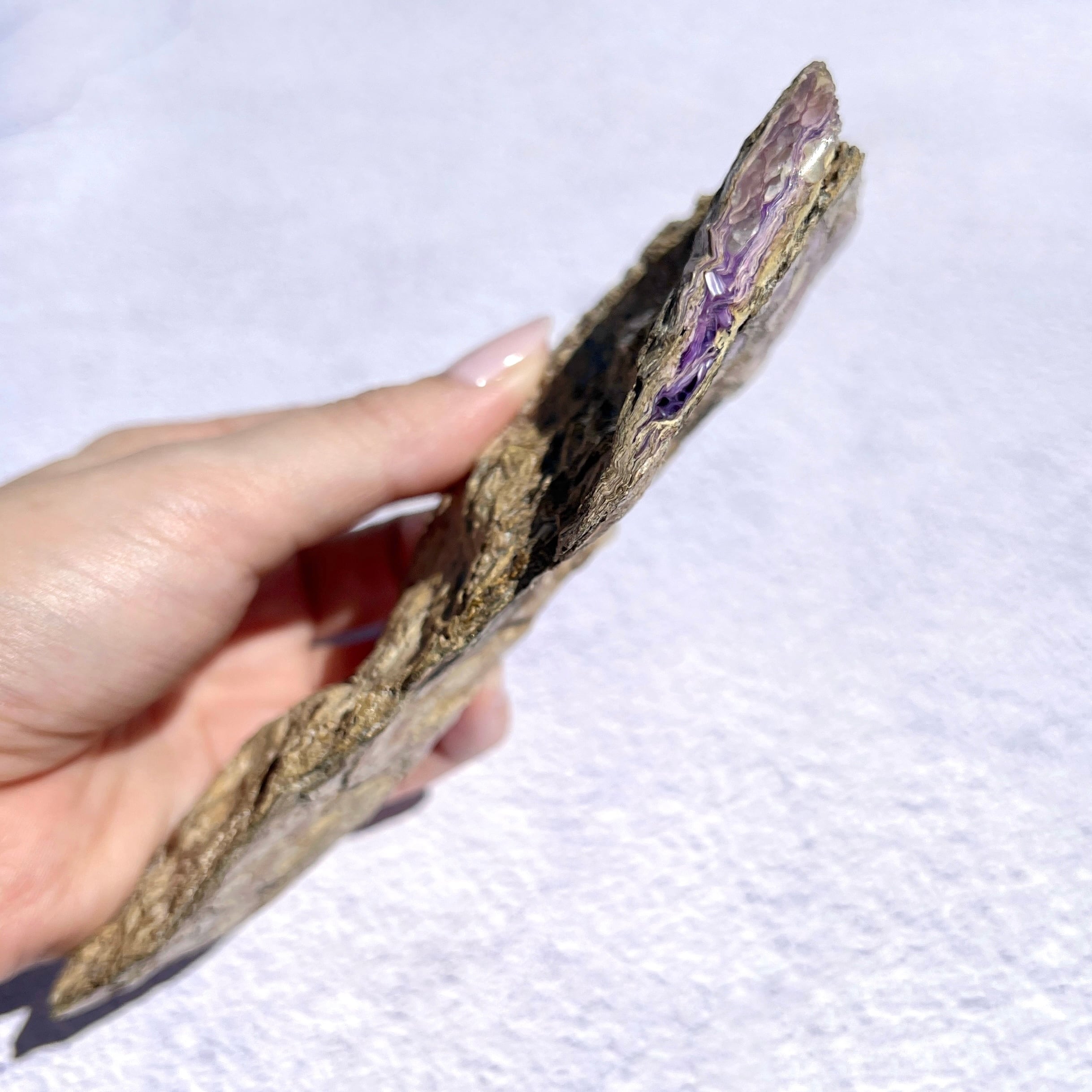 このように自然の成り行きのままの形で薄い母岩に囲まれた原石はなかなか出会えないのではないでしょうか。原始的なフォルムが魅力的です。