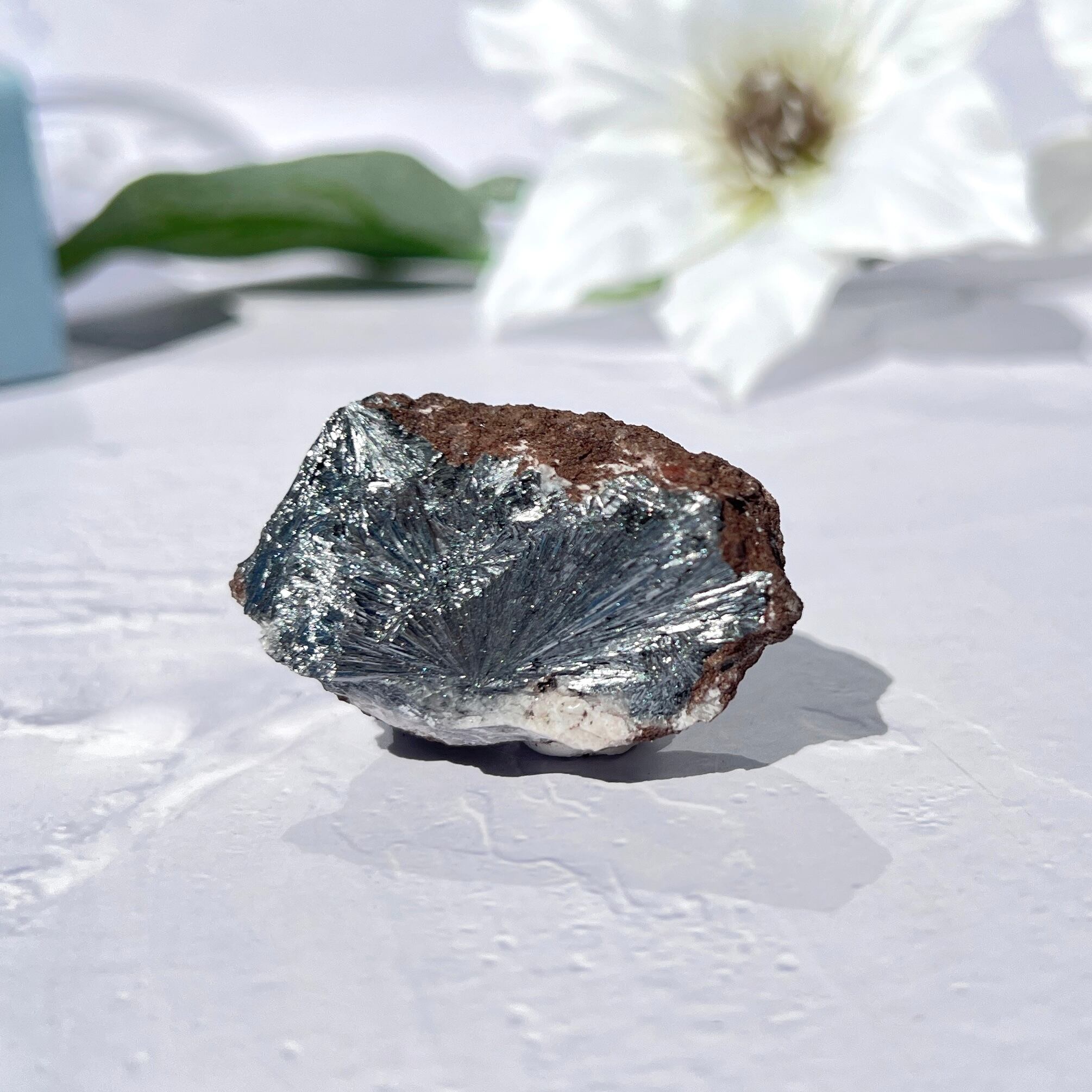 放射状に広がるメタリックな結晶が、ファンタジックで近未来的なイメージを連想させます。強い光沢のある石ですが、非常に繊細な結晶が集結しているので